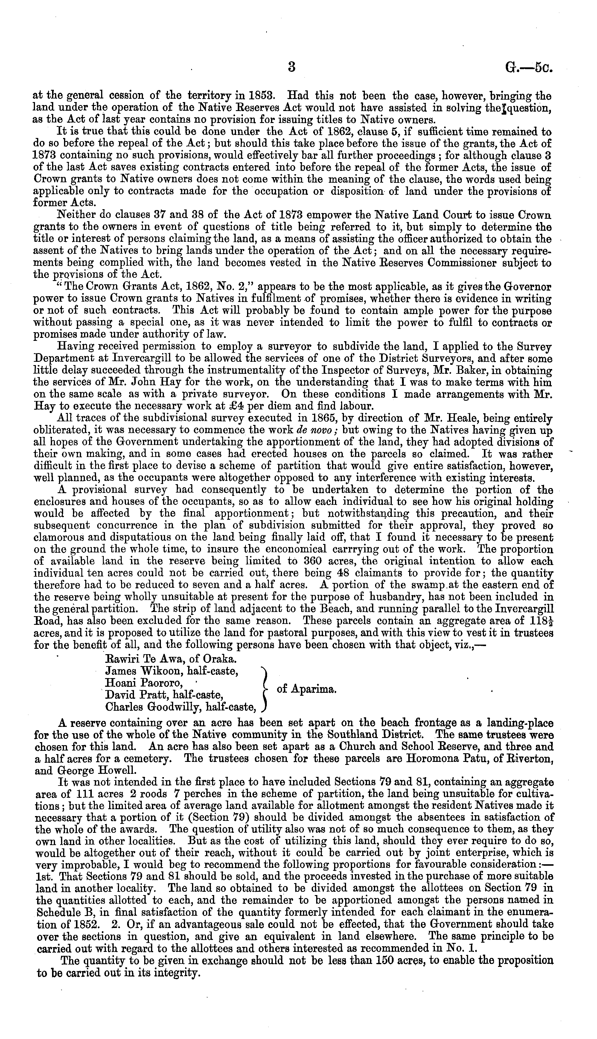 at the general cession of the territory in 1853. Had this not been the case, however, bringing the land under the operation of the Native Eeserves Act would not have assisted in solving the^question, as the Act of last year contains no provision for issuing titles to Native owners. It is true that this could be done under the Act of 1862, clause 5, if sufficient time remained to do so before the repeal of the Act; but should this take place before the issue of the grants, the Act of 1873 containing no such provisions, would effectively bar all further proceedings ; for although clause 3 of the last Act saves existing contracts entered into before the repeal of the former Acts, the issue of Crown grants to Native owners does not come within the meaning of the clause, the words used being applicable only to contracts made for the occupation or disposition of land under the provisions of former Acts. Neither do clauses 37 and 38 of the Act of 1873 empower the Native Land Court to issue Crown grants to the owners in event of questions of title being referred to it, but simply to determine the title or interest of persons claiming the land, as a means of assisting the officer authorized to obtain the assent of the Natives to bring lands under the operation of the Act; and on all the necessary requirements being complied with, the land becomes vested in the Native Eeserves Commissioner subject to the provisions of the Act. "The Crown Grants Act, 1862, No. 2," appears to be the most applicable, as it gives the Governor power to issue Crown grants to Natives in fulfilment of promises, whether there is evidence in writing or not of such contracts. This Act will probably be found to contain ample power for the purpose without passing a special one, as it was never intended to limit the power to fulfil to contracts or promises made under authority of law. Having received permission to employ a surveyor to subdivide the land, I applied to the Survey Department at Invercargill to be allowed the services of one of the District Surveyors, and after some little delay succeeded through the instrumentality of the Inspector of Surveys, Mr. Baker, in obtaining the services of Mr. John Hay for the work, on the understanding that I was to make terms with him on the same scale as with a private surveyor. On these conditions I made arrangements with Mr. Hay to execute the necessary work at £4 per diem and find labour. All traces of the subdivisional survey executed in 1865, by direction of Mr. Heale, being entirely obliterated, it was necessary to commence the work de novo; but owing to the Natives having given up all hopes of the Government undertaking the apportionment of the land, they had adopted divisions of their own making, and in some cases had erected houses on the parcels so claimed. It was rather difficult in the first place to devise a scheme of partition that would give entire satisfaction, however, well planned, as the occupants were altogether opposed to any interference with existing interests. A provisional survey had consequently to be undertaken to determine the portion of the enclosures and houses of the occupants, so as to allow each individual to see how his original holding would be affected by the final apportionment; but notwithstanding this precaution, and their subsequent concurrence in the plan of subdivision submitted for their approval, they proved so clamorous and disputatious on the land being finally laid off, that I found it necessary to be present on the ground the whole time, to insure the enconomical carrrying out of the work. The proportion of available land in the reserve being limited to 360 acres, the original intention to allow each individual ten acres could not be carried out, there being 48 claimants to provide for; the quantity therefore had to be reduced to seven and a half acres. A portion of the swamp at the eastern end of the reserve being wholly unsuitable at present for the purpose of husbandry, has not been included in the general partition. The strip of land adjacent to the Beach, and running parallel to the Invercargill Eoad, has also been excluded for the same reason. These parcels contain an aggregate area of 118| acres, and it is proposed to utilize the land for pastoral purposes, and with this view to vest it in trustees for the benefit of all, and the following persons have been chosen with that object, viz.,— Eawiri Te Awa, of Oraka. James Wikoon, half-caste, "} Hoani Paororo, ' ( ~ . David Pratt, half-caste, C ot APanmaCharles Goodwilly, half-caste, J A reserve containing over an acre has been set apart on the beach frontage as a landing-place for the use of the whole of the Native community in the Southland District. The same trustees were chosen for this land. An acre has also been set apart as a Church and School Eeserve, and three and a half acres for a cemetery. The trustees chosen for these parcels are Horomona Patu, of Eiverton, and George Howell. It was not intended in the first place to have included Sections 79 and 81, containing an aggregate area of 111 acres 2 roods 7 perches in the scheme of partition, the land being unsuitable for cultivations ; but the limited area of average land available for allotment amongst the resident Natives made it necessary that a portion of it (Section 79) should be divided amongst the absentees in satisfaction of the whole of the awards. The question of utility also was not of so much consequence to them, as they own land in other localities. But as the cost of utilizing this land, should they ever require to do so, would be altogether out of their reach, without it could be carried out by joint enterprise, which is very improbable, I would beg to recommend the following proportions for favourable consideration: — Ist. That Sections 79 and 81 should be sold, and the proceeds invested in the purchase of more suitable land in another locality. The land so obtained to be divided amongst the allottees on S