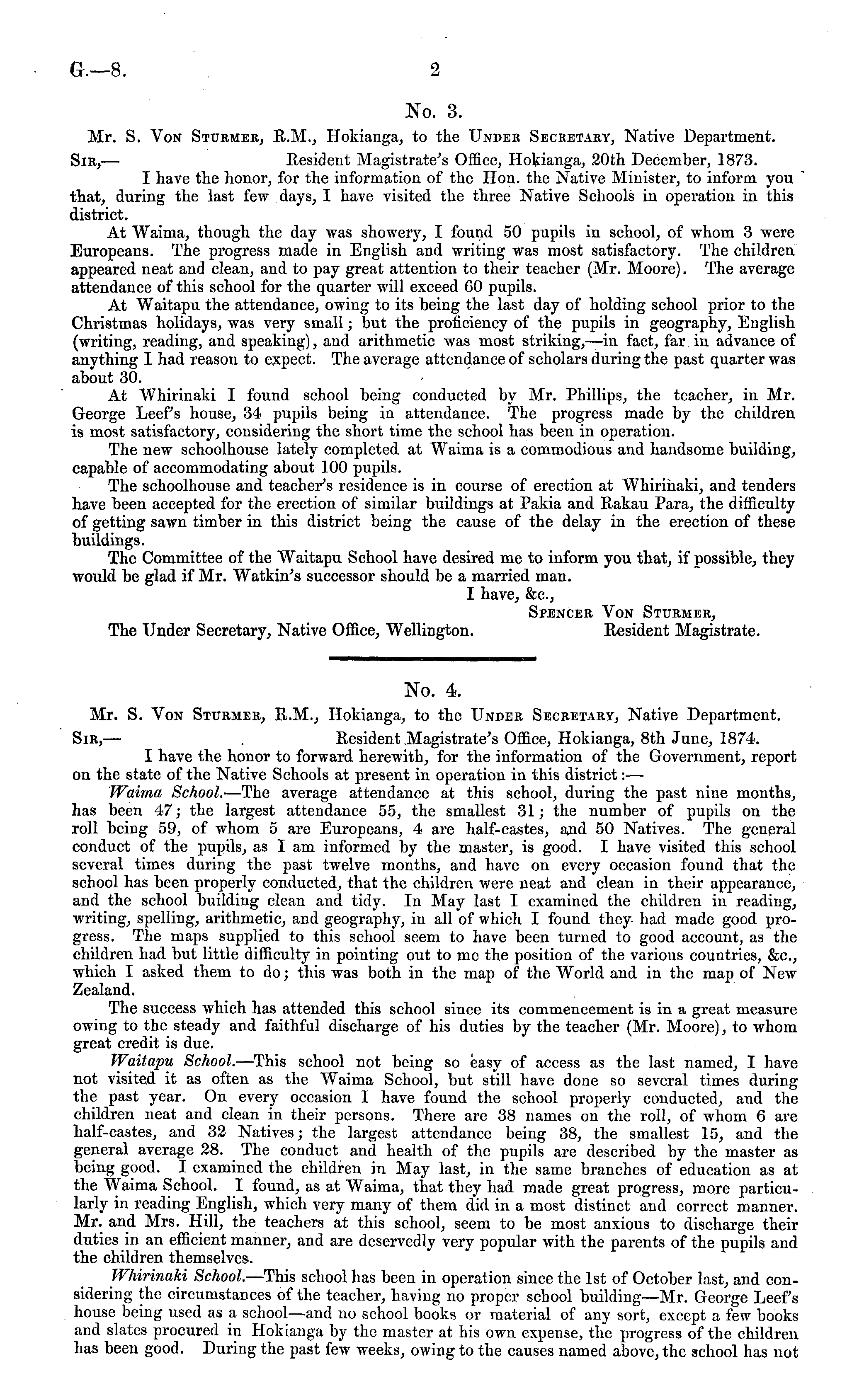 No. 3. Mr. S. Yon Stunner, R.M., Hokianga, to the Under Secretary, Native Department. Sir, — Resident Magistrate's Office, Hokianga, 20th December, 1873. I have the honor, for the information of the Hon. the Native Minister, to inform you that, during the last few days, I have visited the three Native Schools in operation in this district. At Waima, though the day was showery, I found 50 pupils in school, of whom 3 were Europeans. The progress made in English and writing was most satisfactory. The children appeared neat and clean, and to pay great attention to their teacher (Mr. Moore). The average attendance of this school for the quarter will exceed 60 pupils. At Waitapu the attendance, owing to its being the last day of holding school prior to the Christmas holidays, was very small; but the proficiency of the pupils in geography, English (writing, reading, and speaking), and arithmetic was most striking,—in fact, far in advance of anything I had reason to expect. The average attendance of scholars during the past quarter was about 30. At Whirinaki I found school being conducted by Mr. Phillips, the teacher, in Mr. George Leefs house, 34 pupils being in attendance. The progress made by the children is most satisfactory, considering the short time the school has been in operation. The new schoolhouse lately completed at Waima is a commodious and handsome building, capable of accommodating about 100 pupils. The schoolhouse and teacher's residence is in course of erection at Whirinaki, and tenders have been accepted for the erection of similar buildings at Pakia and Rakau Para, the difficulty of getting sawn timber in this district being the cause of the delay in the erection of these buildings. The Committee of the Waitapu School have desired me to inform you that, if possible, they would be glad if Mr. Watkin's successor should be a married man. I have, &c, Spencer Yon Stunner, The Under Secretary, Native Office, Wellington. Resident Magistrate.
