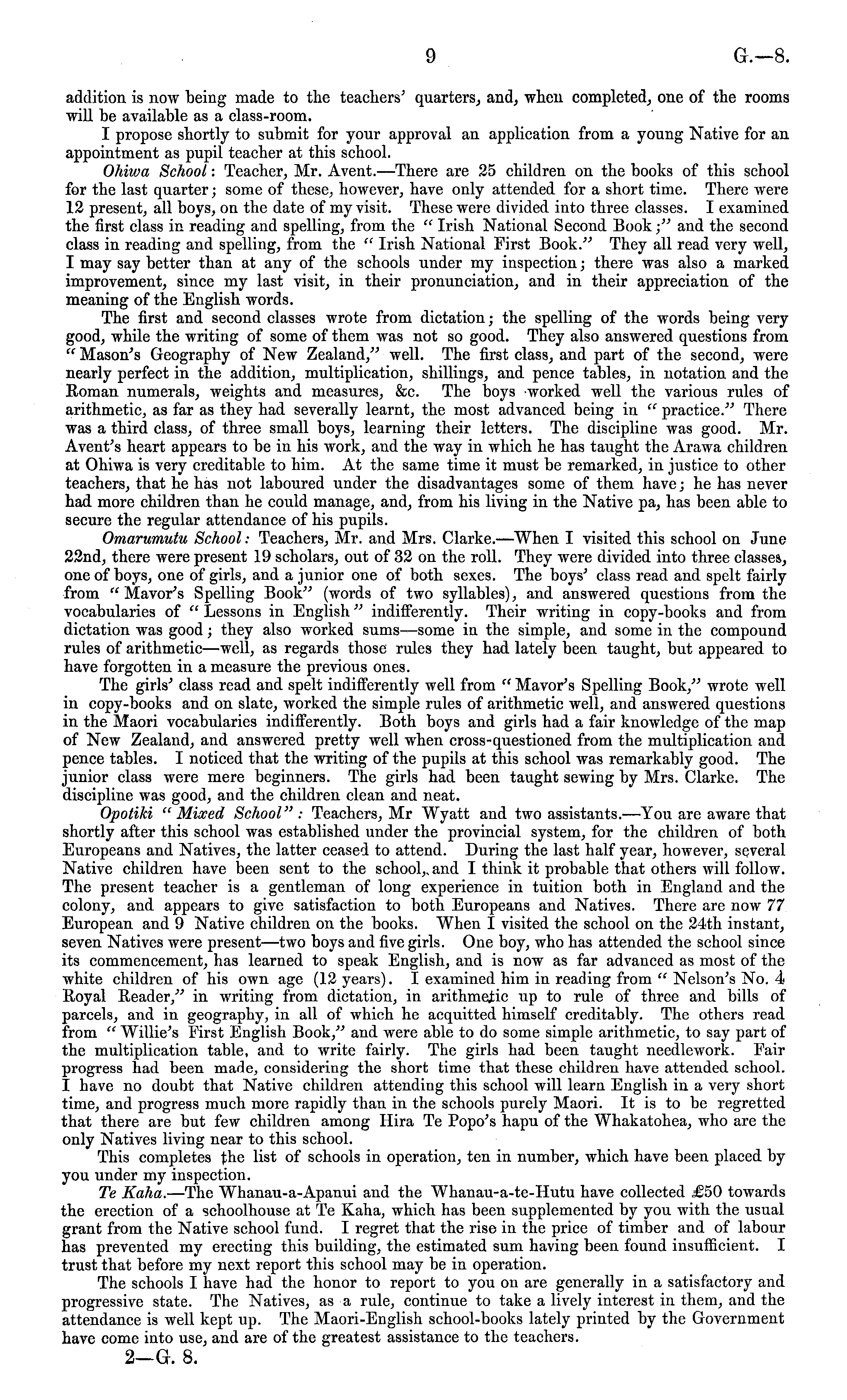 addition is now being made to the teachers' quarters, and, when completed, one of the rooms will be available as a class-room. I propose shortly to submit for your approval an application from a young Native for an appointment as pupil teacher at this school. Ohiwa School : Teacher, Mr. Avent.—There are 25 children on the books of this school for the last quarter; some of these, however, have only attended for a short time. There were 12 present, all boys, on the date of my visit. These were divided into three classes. I examined the first class in reading and spelling, from the " Irish National Second Book;" and the second class in reading and spelling, from the " Irish National First Book." They all read very well, I may say better than at any of the schools under my inspection; there was also a marked improvement, since my last visit, in their pronunciation, and in their appreciation of the meaning of the English words. The first and second classes wrote from dictation; the spelling of the words being very good, while the writing of some of them was not so good. They also answered questions from " Mason's Geography of New Zealand," well. The first class, and part of the second, were nearly perfect in the addition, multiplication, shillings, and pence tables, in notation and the Roman numerals, weights and measures, &c. The boys worked well the various rules of arithmetic, as far as they had severally learnt, the most advanced being in " practice." There was a third class, of three small boys, learning their letters. The discipline was good. Mr. Avent's heart appears to be in his work, and the way in which he has taught the Arawa children at Ohiwa is very creditable to him. At the same time it must be remarked, in justice to other teachers, that he has not laboured under the disadvantages some of them have; he has never had more children than he could manage, and, from his living in the Native pa, has been able to secure the regular attendance of his pupils. Omarumutu School: Teachers, Mr. and Mrs. Clarke. —When I visited this school on June 22nd, there were present 19 scholars, out of 32 on the roll. They were divided into three classeu, one of boys, one of girls, and a junior one of both sexes. The boys' class read and spelt fairly from " Mayor's Spelling Book" (words of two syllables), and answered questions from the vocabularies of " Lessons in English " indifferently. Their writing in copy-books and from dictation was good; they also worked sums—some in the simple, and some in the compound rules of arithmetic —well, as regards those rules they had lately been taught, but appeared to have forgotten in a measure the previous ones. The girls' class read and spelt indifferently well from " Mayor's Spelling Book," wrote well in copy-books and on slate, worked the simple rules of arithmetic well, and answered questions in the Maori vocabularies indifferently. Both boys and girls had a fair knowledge of the map of New Zealand, and answered pretty well when cross-questioned from the multiplication and pence tables. I noticed that the writing of the pupils at this school was remarkably good. The junior class were mere beginners. The girls had been taught sewing by Mrs. Clarke. The discipline was good, and the children clean and neat. Opotiki "Mixed School" : Teachers, Mr Wyatt and two assistants.—You are aware that shortly after this school was established under the provincial system, for the children of both Europeans and Natives, the latter ceased to attend. During the last half year, however, several Native children have been sent to the school, and I think it probable that others will follow. The present teacher is a gentleman of long experience in tuition both in England and the colony, and appears to give satisfaction to both Europeans and Natives. There are now 77 European and 9 Native children on the books. When I visited the school on the 24th instant, seven Natives were present —two boys and five girls. One boy, who has attended the school since its commencement, has learned to speak English, and is now as far advanced as most of the white children of his own age (12 years). I examined him in reading from " Nelson's No. 4 Royal Reader," in writing from dictation, in arithmetic up to rule of three and bills of parcels, and in geography, in all of which he acquitted himself creditably. The others read from " Willies First English Book," and were able to do some simple arithmetic, to say part of the multiplication table, and to write fairly. The girls had been taught needlework. Fair progress had been made, considering the short time that these children have attended school. I have no doubt that Native children attending this school will learn English in a very short time, and progress much more rapidly than in the schools purely Maori. It is to be regretted that there are but few children among Hira Te Popo's hapu of the Whakatohea, who are the only Natives living near to this school. This completes the list of schools in operation, ten in number, which have been placed by you under my inspection. Te Kaha. —The Whanau-a-Apanui and the Whanau-a-te-Hutu have collected £50 towards the erection of a schoolhouse at Te Kaha, which has been supplemented by you with the usual grant from the Native school fund. I regret that the rise in the price of timber and of labour has prevented my erecting this building, the estimated sum having been found insufficient. I trust that before my next report this school may be in operation. The schools I have had the honor to report to you on are generally in a satisfactory and progressive state. The Natives, as a rule, continue to take a lively interest in them, and the attendance is well kept up. The Maori-English school-books lately printed by the Government have come into use, and are of the greatest assistance to tho teachers. 2—G. 8.