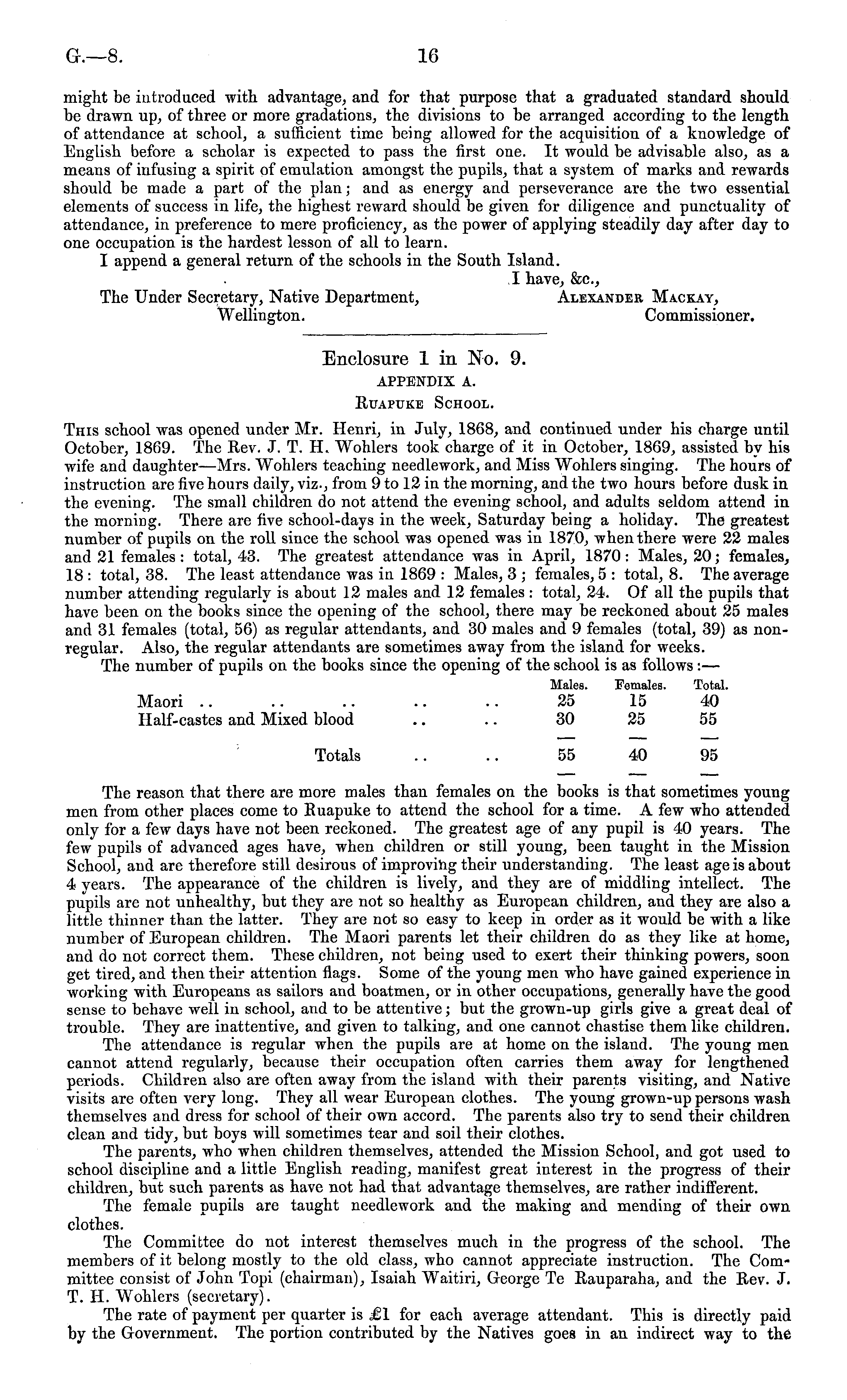 Enclosure 1 in No. 9. APPENDIX A. Ruapuke School. This school was opened under Mr. Henri, in July, 1868, and continued under his charge until October, 1869. The Rev. J. T. H. "Wohlers took charge of it in October, 1869, assisted by his wife and daughter—Mrs. Wohlers teaching needlework, and Miss Wohlers singing. The hours of instruction are five hours daily, viz., from 9 to 12 in the morning, and the two hours before dusk in the evening. The small children do not attend the evening school, and adults seldom attend in the morning. There are five school-days in the week, Saturday being a holiday. The greatest number of pupils on the roll since the school was opened was in 1870, when there were 22 males and 21 females : total, 43. The greatest attendance was in April, 1870: Males, 20; females, 18 : total, 38. The least attendance was in 1869 : Males, 3 ; females, 5 : total, 8. The average number attending regularly is about 12 males and 12 females : total, 24. Of all the pupils that have been on the books since the opening of the school, there may be reckoned about 25 males and 31 females (total, 56) as regular attendants, and 30 males and 9 females (total, 39) as nonregular. Also, the regular attendants are sometimes away from the island for weeks. The number of pupils on the books since the opening of the school is as follows:— Males. Females. Total. Maori .. .. .. .. .. 25 15 40 Half-castes and Mixed blood .. .. 30 25 55 Totals .. .. 55 40 95 The reason that there are more males than females on the books is that sometimes young men from other places come to Ruapuke to attend the school for a time. A few who attended only for a few days have not been reckoned. The greatest age of any pupil is 40 years. The few pupils of advanced ages have, when children or still young, been taught in the Mission School, and are therefore still desirous of improving their understanding. The least age is about 4 years. The appearance of the children is lively, and they are of middling intellect. The pupils are not unhealthy, but they are not so healthy as European children, and they are also a little thinner than the latter. They are not so easy to keep in order as it would be with a like number of European children. The Maori parents let their children do as they like at home, and do not correct them. These children, not being used to exert their thinking powers, soon get tired, and then thei'' attention flags. Some of the young men who have gained experience in working with Europeans as sailors and boatmen, or in other occupations, generally have the good sense to behave well in school, and to be attentive; but the grown-up girls give a great deal of trouble. They are inattentive, and given to talking, and one cannot chastise them like children. The attendance is regular when the pupils are at home on the island. The young men cannot attend regularly, because their occupation often carries them away for lengthened periods. Children also are often away from the island with their parents visiting, and Native visits are often very long. They all wear European clothes. The young grown-up persons wash themselves and dress for school of their own accord. The parents also try to send their children clean and tidy, but boys will sometimes tear and soil their clothes. The parents, who when children themselves, attended the Mission School, and got used to school discipline and a little English reading, manifest great interest in the progress of their children, but such parents as have not had that advantage themselves, are rather indifferent. The female pupils are taught needlework and the making and mending of their own clothes. The Committee do not interest themselves much in the progress of the school. The members of it belong mostly to the old class, who cannot appreciate instruction. The Committee consist of John Topi (chairman), Isaiah Waitiri, George Te Rauparaha, and the Rev. J. T. H. Wohlers (secretary). The rate of payment per quarter is £1 for each average attendant. This is directly paid by the Government. The portion contributed by the Natives goes in an indirect way to the