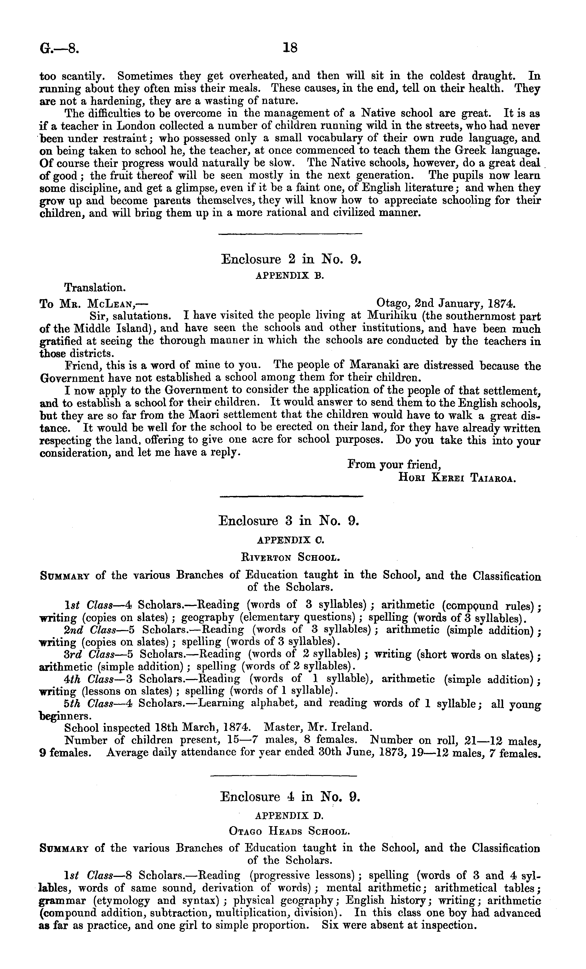 Enclosure 2 in No. 9. APPENDIX B. Translation. To Mr. McLean, — Otago, 2nd January, 1874. Sir, salutations. I have visited the people living at Murihiku (the southernmost part of the Middle Island), and have seen the schools and other institutions, and have been much gratified at seeing the thorough manner in which the schools are conducted by the teachers in those districts. Friend, this is a word of mine to you. The people of Maranaki are distressed because the Government have not established a school among them for their children. I now apply to the Government to consider the application of the people of that settlement, and to establish a school for their children. It would answer to send them to the English schools, but they are so far from the Maori settlement that the children would have to walk a great distance. It would be well for the school to be erected on their land, for they have already written respecting the land, offering to give one acre for school purposes. Do you take this into your consideration, and let me have a reply. From your friend, Hori Kerei Taiaroa.