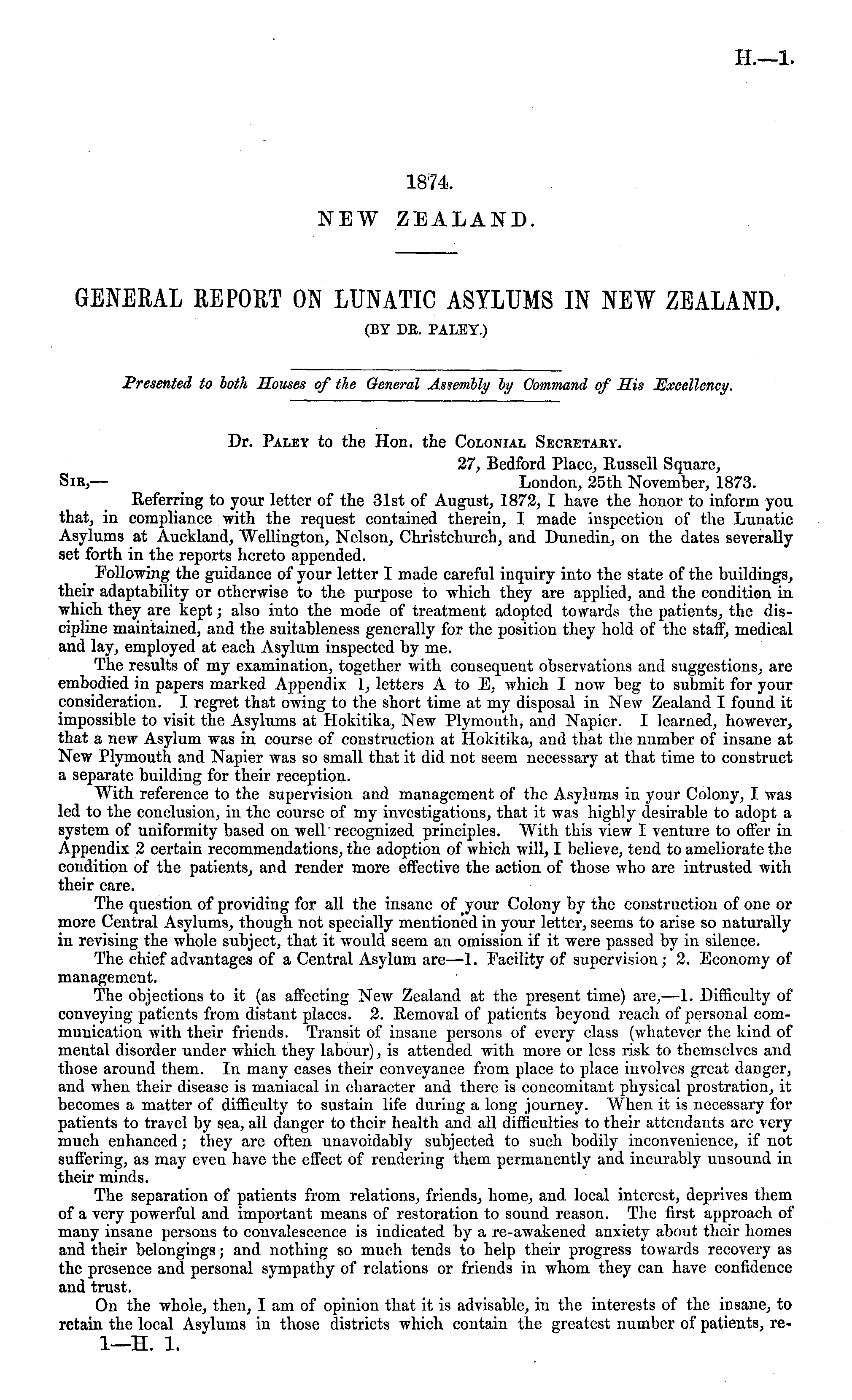 Dr. Paley to the Hon. the Colonial Secretary. 27, Bedford Place, Russell Square, Sir,— London, 25th November, 1873. Referring to your letter of the 31st of August, 1872, I have the honor to inform you that, in compliance with the request contained therein, I made inspection of the Lunatic Asylums at Auckland, Wellington, Nelson, Christchurch, and Dunedin, on the dates severally set forth in the reports hereto appended. Following the guidance of your letter I made careful inquiry into the state of the buildings, their adaptability or otherwise to the purpose to which they are applied, and the condition in which they are kept; also into the mode of treatment adopted towards the patients, the discipline maintained, and the suitableness generally for the position they hold of the staff, medical and lay, employed at each Asylum inspected by me. The results of my examination, together with consequent observations and suggestions, are embodied in papers marked Appendix 1, letters A to E, which I now beg to submit for your consideration. I regret that owing to the short time at my disposal in New Zealand I found it impossible to visit the Asylums at Hokitika, New Plymouth, and Napier. I learned, however, that a new Asylum was in course of construction at Hokitika, and that the number of insane at New Plymouth and Napier was so small that it did not seem necessary at that time to construct a separate building for their reception. With reference to the supervision and management of the Asylums in your Colony, I was led to the conclusion, in the course of my investigations, that it was highly desirable to adopt a system of uniformity based on well recognized principles. With this view I venture to offer in Appendix 2 certain recommendations, the adoption of which will, I believe, tend to ameliorate the condition of the patients, and render more effective the action of those who are intrusted with their care. The question of providing for all the insane of your Colony by the construction of one or more Central Asylums, though not specially mentioned in your letter, seems to arise so naturally in revising the whole subject, that it would seem an omission if it were passed by in silence. The chief advantages of a Central Asylum are—l. Facility of supervision; 2. Economy of management. The objections to it (as affecting New Zealand at the present time) are, —1. Difficulty of conveying patients from distant places. 2. Removal of patients beyond reach of personal communication with their friends. Transit of insane persons of every class (whatever the kind of mental disorder under which they labour), is attended with more or less risk to themselves and those around them. In many cases their conveyance from place to place involves great danger, and when their disease is maniacal in character and there is concomitant physical prostration, it becomes a matter of difficulty to sustain life during a long journey. When it is necessary for patients to travel by sea, all danger to their health and all difficulties to their attendants are very much enhanced; they are often unavoidably subjected to such bodily inconvenience, if not suffering, as may even have the effect of rendering them permanently and incurably unsound in their minds. The separation of patients from relations, friends, home, and local interest, deprives them of a very powerful and important means of restoration to sound reason. The first approach of many insane persons to convalescence is indicated by a re-awakened anxiety about their homes and their belongings; and nothing so much tends to help their progress towards recovery as the presence and personal sympathy of relations or friends in whom they can have confidence and trust. On the whole, then, I am of opinion that it is advisable, in the interests of the insane, to retain the local Asylums in those districts which contain the greatest number of patients, re--I—H. 1.