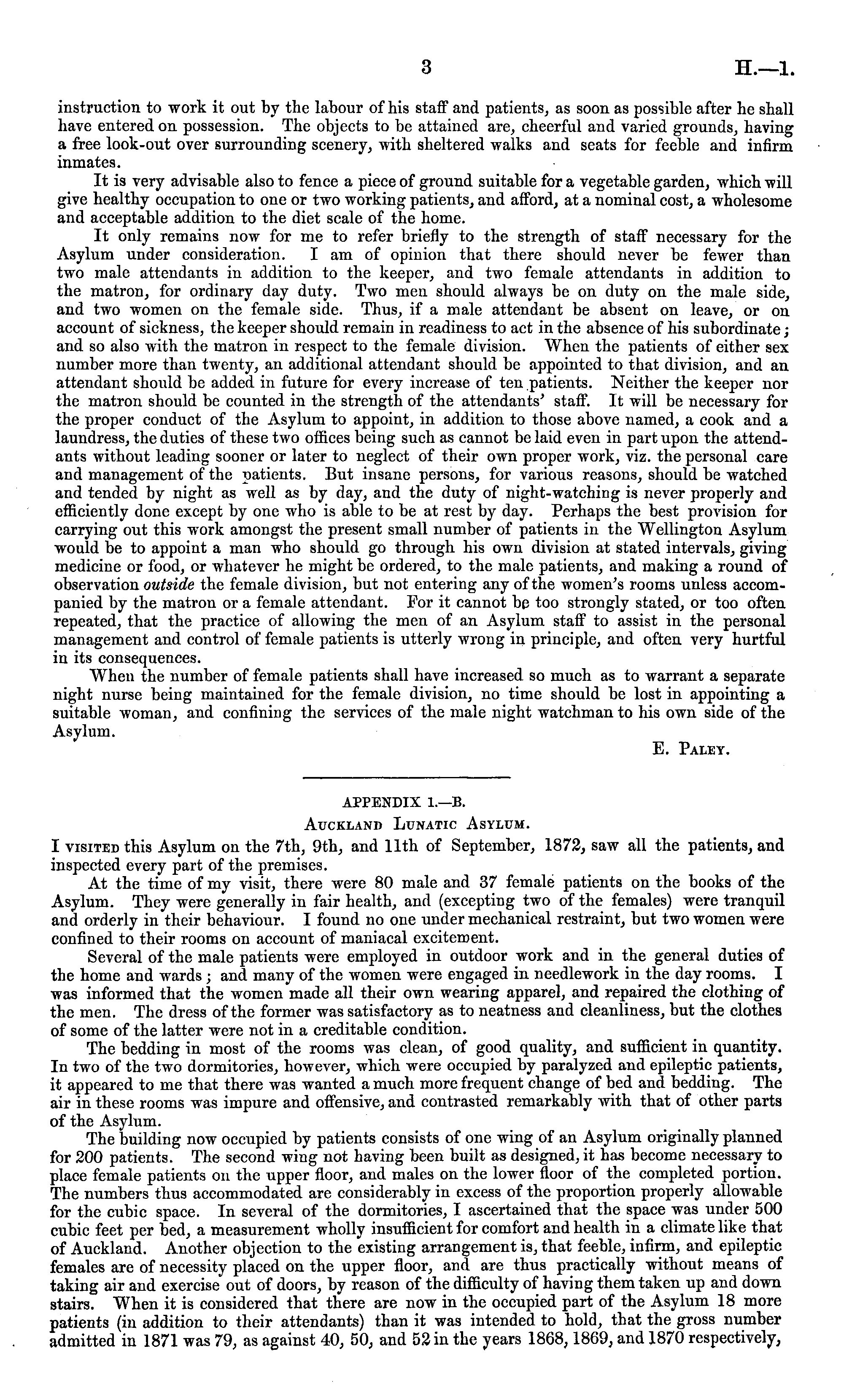 insti'uction to work it out by the labour of his staff and patients, as soon as possible after he shall have entered on possession. The objects to be attained are, cheerful and varied grounds, having a free look-out over surrounding scenery, with sheltered walks and seats for feeble and infirm inmates. It is very advisable also to fence a piece of ground suitable for a vegetable garden, which will give healthy occupation to one or two working patients, and afford, at a nominal cost, a wholesome and acceptable addition to the diet scale of the home. It only remains now for me to refer briefly to the strength of staff necessary for the Asylum under consideration. I am of opinion that there should never be fewer than two male attendants in addition to the keeper, and two female attendants in addition to the matron, for ordinary day duty. Two men should always be on duty on the male side, and two women on the female side. Thus, if a male attendant be absent on leave, or on account of sickness, the keeper should remain in readiness to act in the absence of his subordinate; and so also with the matron in respect to the female division. When the patients of either sex number more than twenty, an additional attendant should be appointed to that division, and an attendant should be added in future for every increase of ten patients. Neither the keeper nor the matron should be counted in the strength of the attendants' staff. It will be necessary for the proper conduct of the Asylum to appoint, in addition to those above named, a cook and a laundress, the duties of these two offices being such as cannot be laid even in pai't upon the attendants without leading sooner or later to neglect of their own proper work, viz. the personal care and management of the patients. But insane persons, for various reasons, should be watched and tended by night as well as by day, and the duty of night-watching is never properly and efficiently done except by one who is able to be at rest by day. Perhaps the best provision for carrying out this work amongst the present small number of patients in the Wellington Asylum would be to appoint a man who should go through his own division at stated intervals, giving medicine or food, or whatever he might be ordered, to the male patients, and making a round of observation outside the female division, but not entering any of the women's rooms unless accompanied by the matron or a female attendant. For it cannot be too strongly stated, or too often repeated, that the practice of allowing the men of an Asylum staff to assist in the personal management and control of female patients is utterly wrong in principle, and often very hurtful in its consequences. When the number of female patients shall have increased so much as to warrant a separate night nurse being maintained for the female division, no time should be lost in appointing a suitable woman, and confining the services of the male night watchman to his own side of the Asylum. E. Paley.