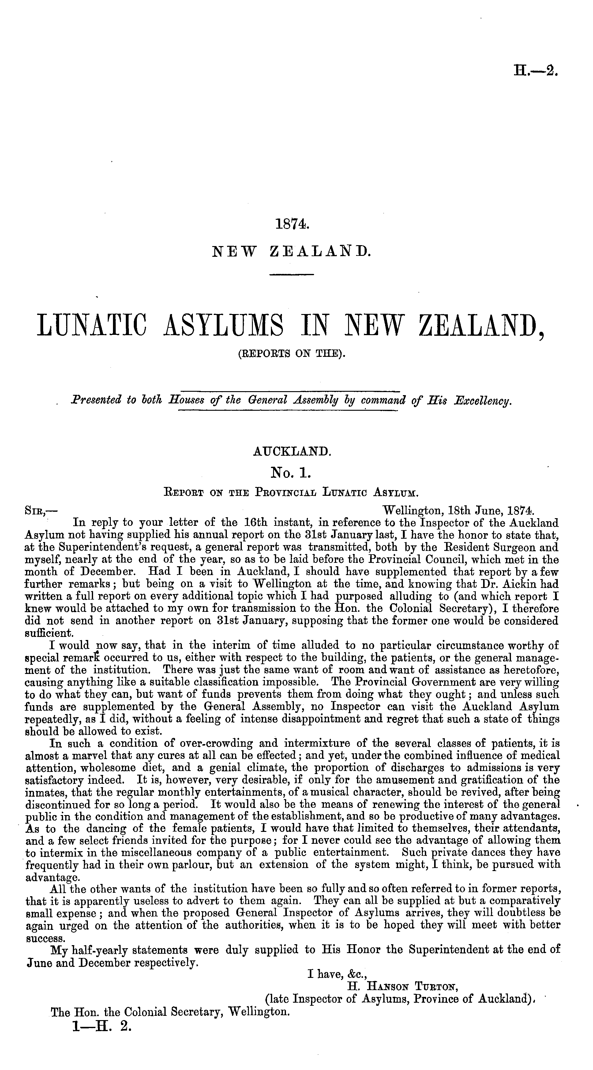 AUCKLAND. No. 1. Eepoet on the Peovincial Lunatic Astltjm. Sie ,— "Wellington, 18th June, 1874. In reply to your letter of the 16th instant, in reference to the Inspector of the Auckland Asylum not having supplied his annual report on the 31st January last, I have the honor to state that, at the Superintendent's request, a general report was transmitted, both by the Eesident Surgeon and myself, nearly at the end of the year, so as to be laid before the Provincial Council, which met in the month of December. Had I been in Auckland, I should have supplemented that report by a few further remarks; but being on a visit to Wellington at the time, and knowing that Dr. Aickin had written a full report on every additional topic which I had purposed alluding to (and which report I knew would be attached to my own for transmission to the Hon. the Colonial Secretary), I therefore did not send in another report on 31st January, supposing that the former one would be considered sufficient. I would now say, that in the interim of time alluded to no particular circumstance worthy of special remark" occurred to us, either with respect to the building, the patients, or the general management of the institution. There was just the same want of room and want of assistance as heretofore, causing anything like a suitable classification impossible. The Provincial Government are very willing to do what they can, but want of funds prevents them from doing what they ought; and unless such, funds are supplemented by the General Assembly, no Inspector can visit the Auckland Asylum repeatedly, as I did, without a feeling of intense disappointment and regret that such a state of things should be allowed to exist. In such a condition of over-crowding and intermixture of the several classes of patients, it is almost a marvel that any cures at all can be effected; and yet, under the combined influence of medical attention, wholesome diet, and a genial climate, the proportion of discharges to admissions is very satisfactory indeed. It is, however, very desirable, if only for the amusement and gratification of the inmates, that the regular monthly entertainments, of a musical character, should be revived, after being discontinued for so long a period. It would also be the means of renewing the interest of the general public in the condition and management of the establishment, and so be productive of many advantages. As to the dancing of the female patients, I would have that limited to themselves, their attendants, and a few select friends invited for the purpose; for I never could see the advantage of allowing them to intermix in the miscellaneous company of a public entertainment. Such private dances they have frequently had in their own parlour, but an extension of the system might, I think, be pursued with advantage. All the other wants of the institution have been so fully and so often referred to in former reports, that it is apparently useless to advert to them again. They can all be supplied at but a comparatively small expense ; and when the proposed General Inspector of Asylums arrives, they will doubtless be again urged on the attention of the authorities, when it is to be hoped they will meet with better success. My half-yearly statements were duly supplied to His Honor the Superintendent at the end of June and December respectively. I have, &c, H. Hanson Ttjeton, (late Inspector of Asylums, Province of Auckland), The Hon. the Colonial Secretary, Wellington. I—H. 2.