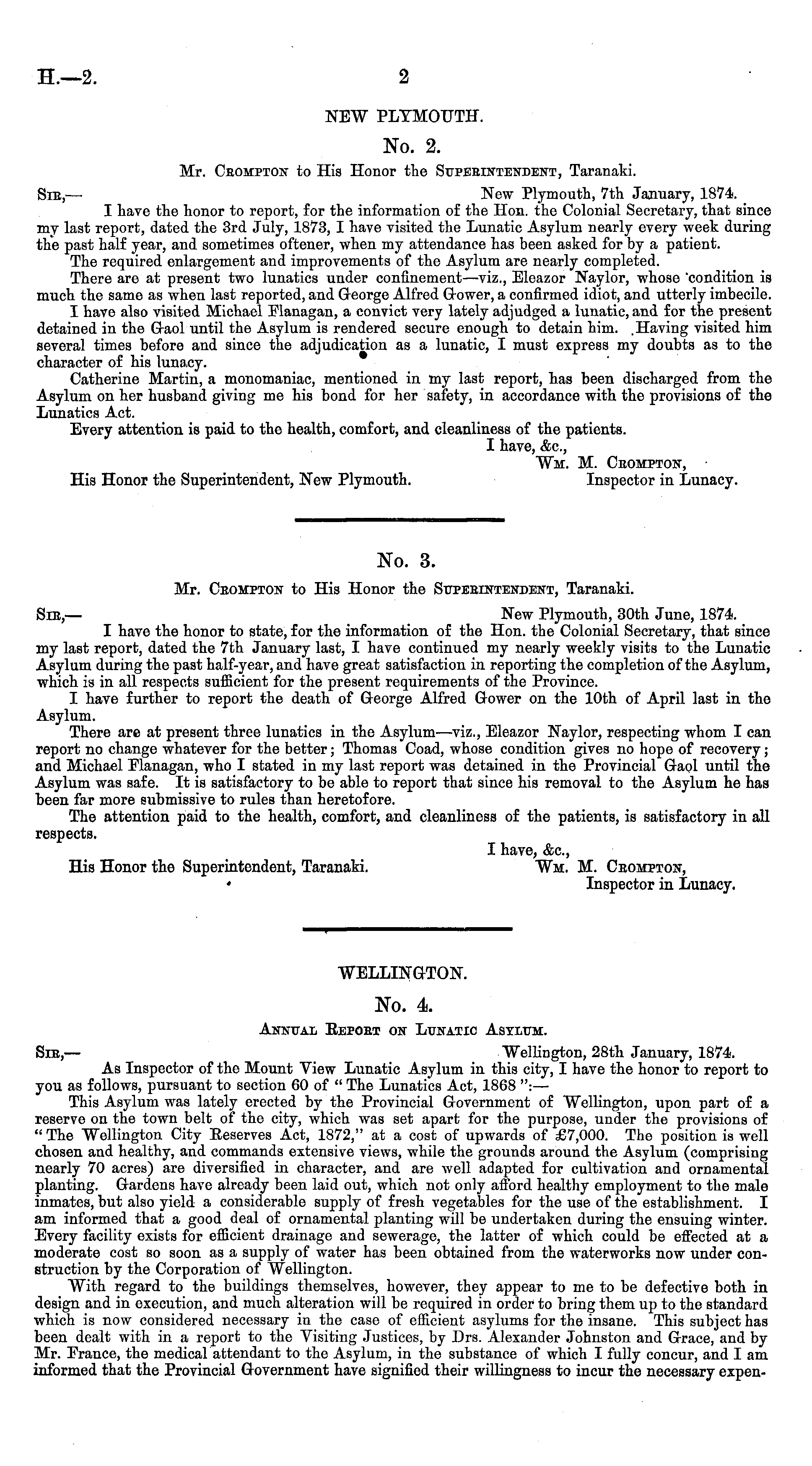 NEW PLYMOUTH. No. 2. Mr. Ceompton to His Honor the Supeeintendent, Taranaki. Sib, — New Plymouth, 7th January, 1874. I have the honor to report, for the information of the Hon. the Colonial Secretary, that since my last report, dated the 3rd July, 1873, I have visited the Lunatic Asylum nearly every week during the past half year, and sometimes oftener, when my attendance has been asked for by a patient. The required enlargement and improvements of the Asylum are nearly completed. There are at present two lunatics under confinement—viz., Eleazor Naylor, whose 'condition is much the same as when last reported, and George Alfred Gower, a confirmed idiot, and utterly imbecile. I have also visited Michael Flanagan, a convict very lately adjudged a lunatic, and for the present detained in the Gaol until the Asylum is rendered secure enough to detain him. Having visited him several times before and since the adjudication as a lunatic, I must express my doubts as to the character of his luna.cy. Catherine Martin, a monomaniac, mentioned in my last report, has been discharged from the Asylum on her husband giving me his bond for her safety, in accordance with the provisions of the Lunatics Act. Every attention is paid to the health, comfort, and cleanliness of the patients. I have, &c, Wm. M. Ceompton, • His Honor the Superintendent, New Plymouth. Inspector in Lunacy.