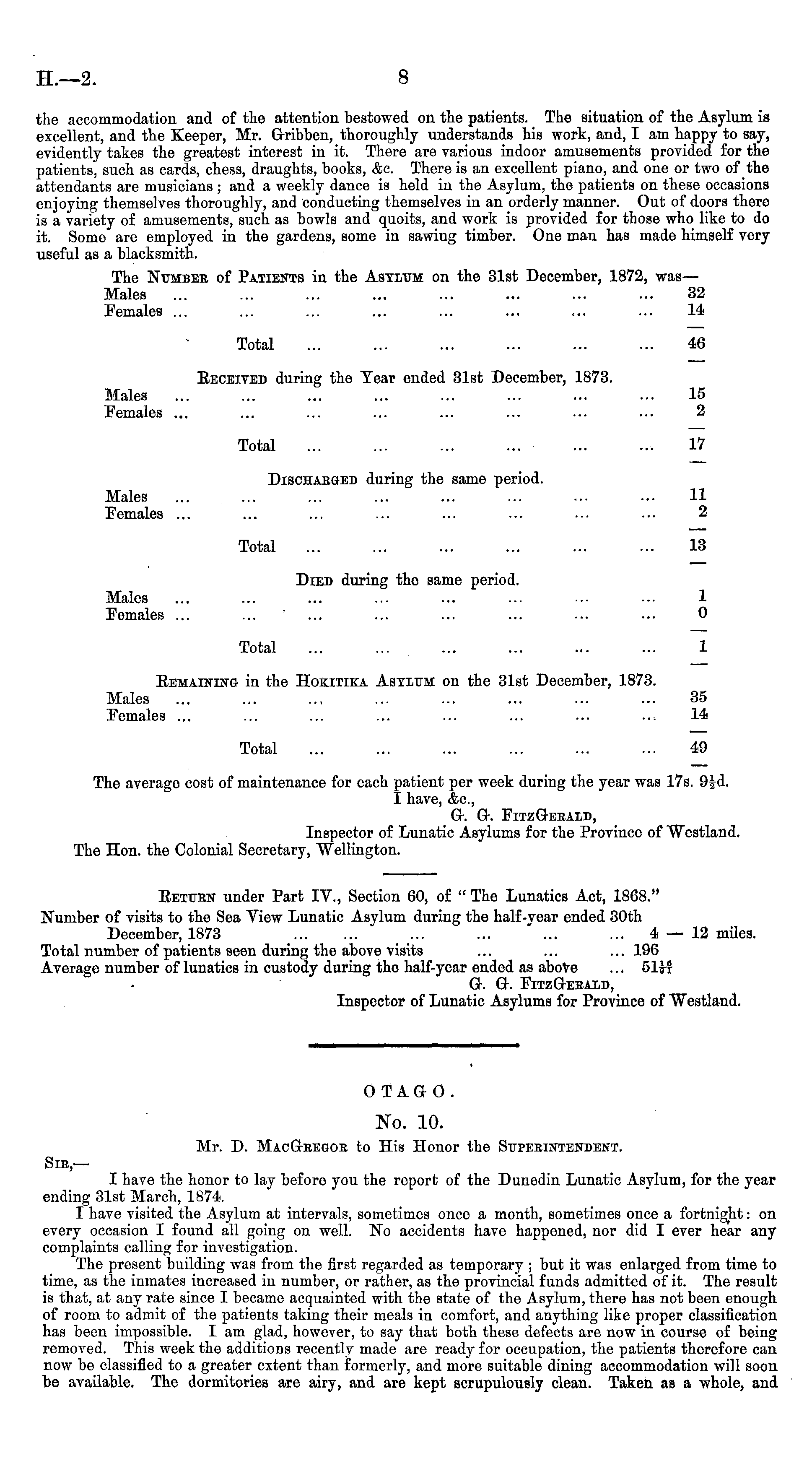 OTAGO. No. 10. Mr. D. MacGbesoe to His Honor the Supeeintendent. Sib, — I have the honor to lay before you the report of the Dunedin Lunatic Asylum, for the year ending 31st March, 1874. I have visited the Asylum at intervals, sometimes once a month, sometimes once a fortnight: on every occasion I found all going on well. No accidents have happened, nor did I ever hear any complaints calling for investigation. The present building was from the first regarded as temporary ; but it was enlarged from time to time, as the inmates increased in number, or rather, as the provincial funds admitted of it. The result is that, at any rate since I became acquainted with the state of the Asylum, there has not been enough of room to admit of the patients taking their meals in comfort, and anything like proper classification has been impossible. I am glad, however, to say that both these defects are now in course of being removed. This week the additions recently made are ready for occupation, the patients therefore can now be classified to a greater extent than formerly, and more suitable dining accommodation will soon be available. The dormitories are airy, and are kept scrupulously clean. Taken as a whole, and