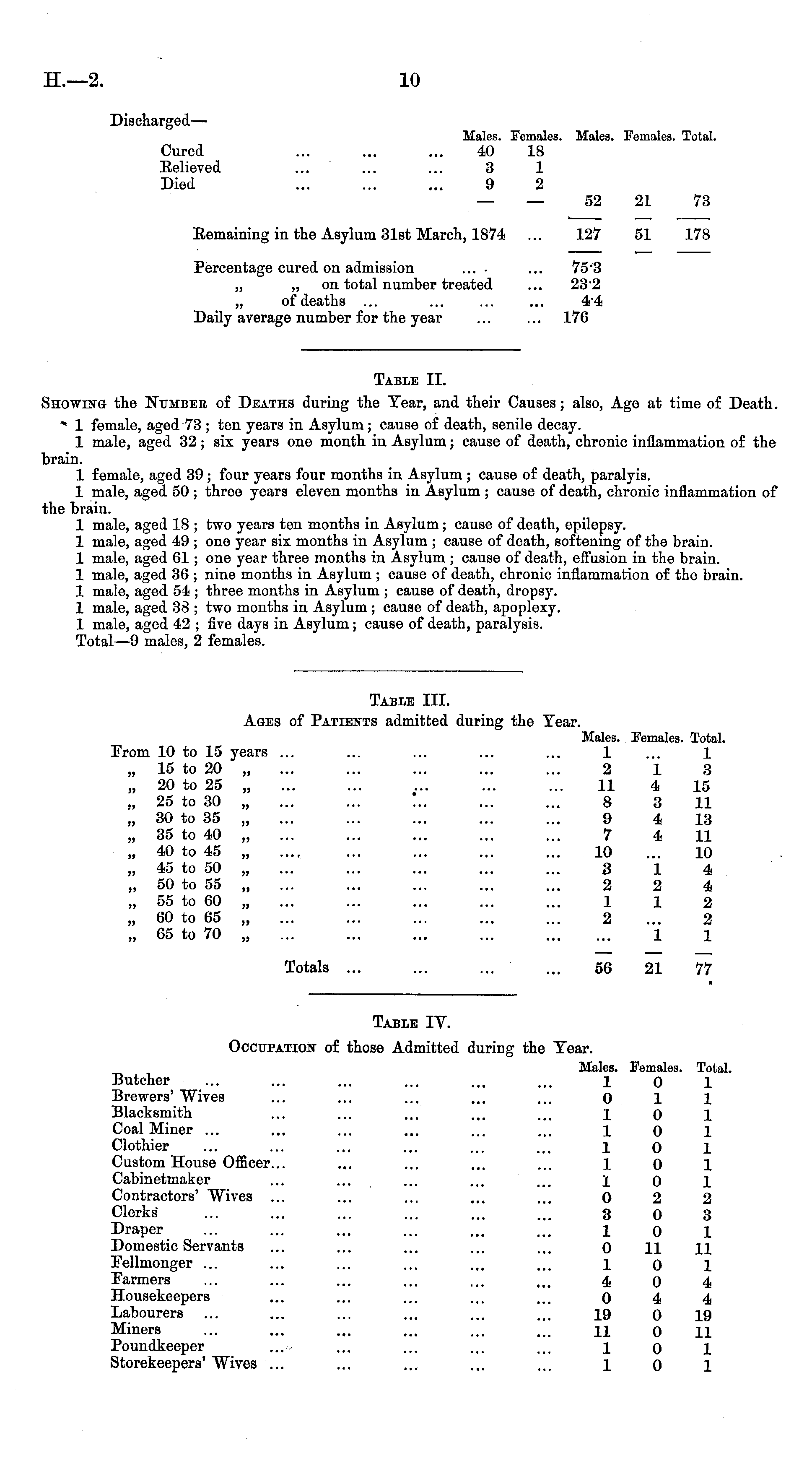 Discharged— Males. Females. Males. Females. Total. Cured ... ... ... 40 18 Believed ... ... ... 3 1 Died ... ... ... 9 2 — — 52 21 73 Eemaining in the Asylum 31st March, 1874 ... 127 51 178 Percentage cured on admission ... ... 75"3 „ „ on total number treated ... 23'2 „ of deaths ... ... ... ... 4'4 Daily average number for the year ... ... 176