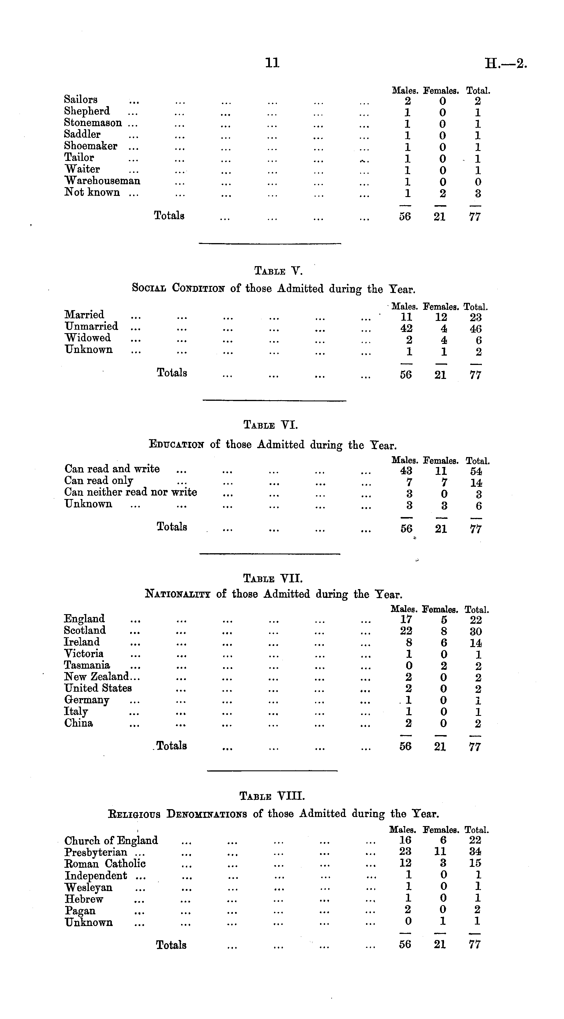 lailors ihepherd Itonemason ... iaddler ihoemaker ... Cailor Waiter Warehouseman STot known ... A. . Males. J 2 1 1 1 1 1 1 1 1 Females. 0 0 0 0 0 0 0 0 2 r Total 2 1 1 1 1 1 1 0 3 Totals 56 21 77