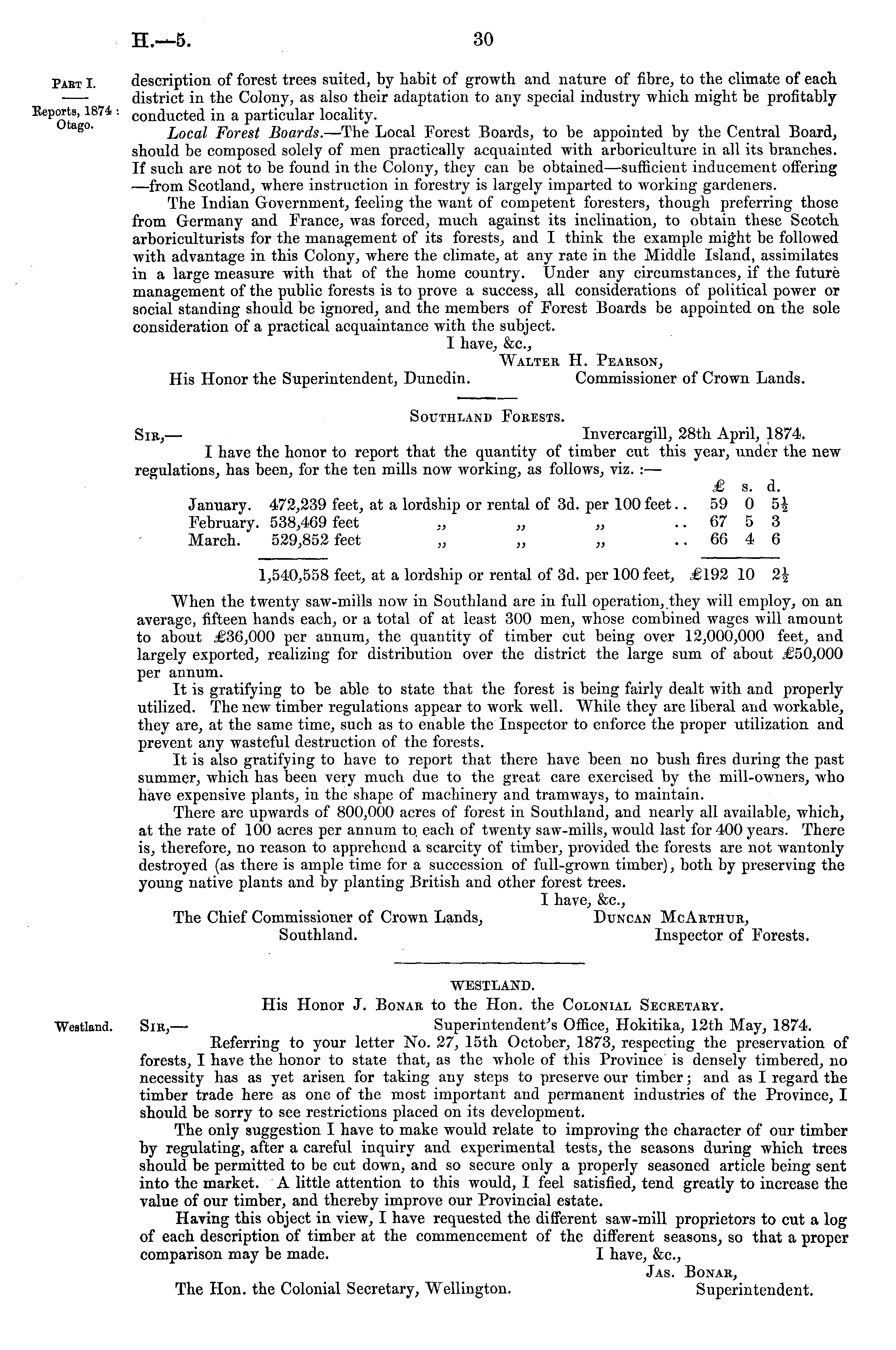 WESTLAND. His Honor J. Bonar to the Hon. the Colonial Secretary. Sir, — Superintendent's Office, Hokitika, 12th May, 1874. Referring to your letter No. 27, 15th October, 1873, respecting the preservation of forests, I have the honor to state that, as the ■whole of this Province is densely timbered, no necessity has as yet arisen for taking any steps to preserve our timber; and as I regard the timber trade here as one of the most important and permanent industries of the Province, I should be sorry to see restrictions placed on its development. The only suggestion I have to make would relate to improving the character of our timber by regulating, after a careful inquiry and experimental tests, the seasons during which trees should be permitted to be cut down, and so secure only a properly seasoned article being sent into the market. A little attention to this would, I feel satisfied, tend greatly to increase the value of our timber, and thereby improve our Provincial estate. Having this object in view, I have requested the different saw-mill proprietors to cut a log of each description of timber at the commencement of the different seasons, so that a proper comparison may be made. I have, &c., Jas. Bonar, The Hon. the Colonial Secretary, Wellington. Superintendent.