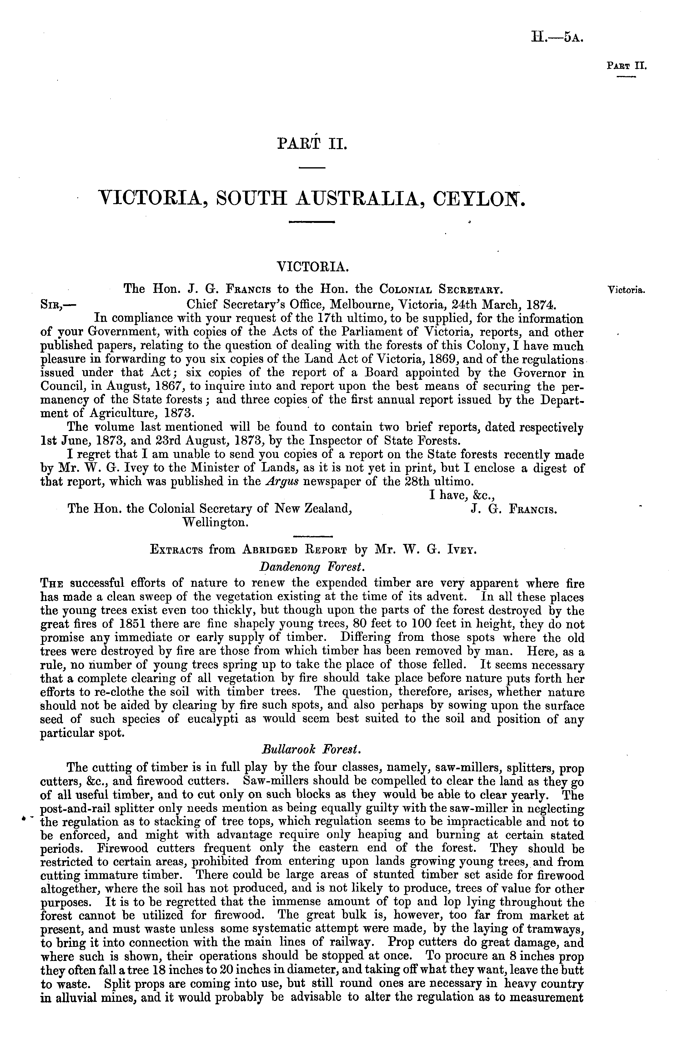 VICTORIA. The Hon. J. G. Francis to the Hon. the Colonial Secretary. Sir, — Chief Secretary's Office, Melbourne, Victoria, 24th March, 1874. In compliance with your request of the 17th ultimo, to be supplied, for the information of your Government, with copies of the Acts of the Parliament of Victoria, reports, and other published papers, relating to the question of dealing with the forests of this Colony, I have much pleasure in forwarding to you six copies of the Land Act of Victoria, 1869, and of the regulations issued under that Act; six copies of the report of a Board appointed by the Governor in Council, in August, 1867, to inquire into and report upon the best means of securing the permanency of the State forests ; and three copies of the first annual report issued by the Department of Agriculture, 1873. The volume last mentioned will be found to contain two brief reports, dated respectively Ist June, 1873, and 23rd August, 1873, by the Inspector of State Forests. I regret that I am unable to send you copies of a report on the State forests recently made by Mr. W. G. Ivey to the Minister of Lands, as it is not yet in print, but I enclose a digest of that report, which was published in the Argus newspaper of the 28th ultimo. I have, &c, The Hon. the Colonial Secretary of New Zealand, J. G. Francis. Wellington. Extracts from Abridged Report by Mr. W. G. Ivey. Dandenong Forest. The successful efforts of nature to renew the expended timber are very apparent where fire has made a clean sweep of the vegetation existing at the time of its advent. In all these places the young trees exist even too thickly, but though upon the parts of the forest destroyed by the great fires of 1851 there are fine shapely young trees, 80 feet to 100 feet in height, they do not promise any immediate or early supply of timber. Differing from those spots where the old trees were destroyed by fire are those from which timber has been removed by man. Here, as a rule, no number of young trees spring up to take the place of those felled. It seems necessary that a complete clearing of all vegetation by fire should take place before nature puts forth her efforts to re-clothe the soil with timber trees. The question, therefore, arises, whether nature should not be aided by clearing by fire such spots, and also perhaps by sowing upon the surface seed of such species of eucalypti as would seem best suited to the soil and position of any particular spot. Bullarook Forest. The cutting of timber is in full play by the four classes, namely, saw-millers, splitters, prop cutters, &c, and firewood cutters. Saw-millers should be compelled to clear the land as they go of all useful timber, and to cut only on such blocks as they would be able to clear yearly. The post-and-rail splitter only needs mention as being equally guilty with the saw-miller in neglecting * " the regulation as to stacking of tree tops, which regulation seems to be impracticable and not to be enforced, and might with advantage require only heaping and burning at certain stated periods. Firewood cutters frequent only the eastern end of the forest. They should be restricted to certain areas, prohibited from entering upon lands growing young trees, and from cutting immature timber. There could be large areas of stunted timber set aside for firewood altogether, where the soil has not produced, and is not likely to produce, trees of value for other purposes. It is to be regretted that the immense amount of top and lop lying throughout the forest cannot be utilized for firewood. The great bulk is, however, too far from market at present, and must waste unless some systematic attempt were made, by the laying of tramways, to bring it into connection with the main lines of railway. Prop cutters do great damage, and where such is shown, their operations should be stopped at once. To procure an 8 inches prop they often fall a tree 18 inches to 20 inches in diameter, and taking off what they want, leave the butt to waste. Split props are coming into use, but still round ones are necessary in heavy country in alluvial mines, and it would probably be advisable to alter the regulation as to measurement