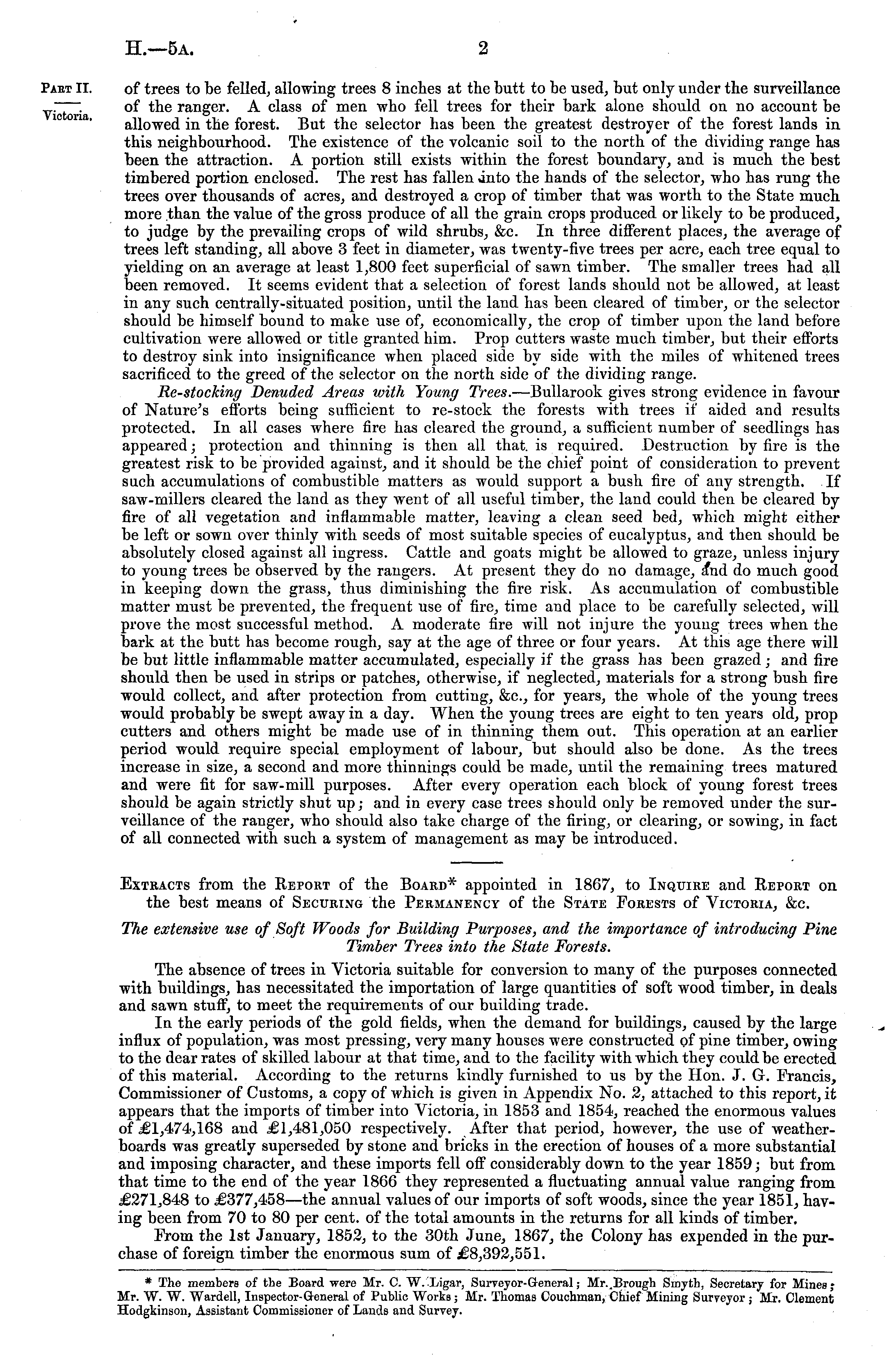 of trees to be felled, allowing trees 8 inches at the butt to be used, but only under the surveillance of the ranger. A class of men who fell trees for their bark alone should on no account be allowed in the forest. But the selector has been the greatest destroyer of the forest lands in this neighbourhood. The existence of the volcanic soil to the north of the dividing range has been the attraction. A portion still exists within the forest boundary, and is much the best timbered portion enclosed. The rest has fallen into the hands of the selector, who has rung the trees over thousands of acres, and destroyed a crop of timber that was worth to the State much more than the value of the gross produce of all the grain crops produced or likely to be produced, to judge by the prevailing crops of wild shrubs, &c. In three different places, the average of trees left standing, all above 3 feet in diameter, was twenty-five trees per acre, each tree equal to yielding on an average at least 1,800 feet superficial of sawn timber. The smaller trees had all been removed. It seems evident that a selection of forest lands should not be allowed, at least in any such centrally-situated position, until the land has been cleared of timber, or the selector should be himself bound to make use of, economically, the crop of timber upon the land before cultivation were allowed or title granted him. Prop cutters waste much timber, but their efforts to destroy sink into insignificance when placed side by side with the miles of whitened trees sacrificed to the greed of the selector on the north side of the dividing range. Re-stocking Denuded Areas with Young Trees. —Bullarook gives strong evidence in favour of Nature's efforts being sufficient to re-stock the forests with trees if aided and results protected. In all cases where fire has cleared the ground, a sufficient number of seedlings has appeared; protection and thinning is then all that, is required. Destruction by fire is the greatest risk to be provided against, and it should be the chief point of consideration to prevent such accumulations of combustible matters as would support a bush fire of any strength. If saw-millers cleared the land as they went of all useful timber, the land could then be cleared by fire of all vegetation and inflammable matter, leaving a clean seed bed, which might either be left or sown over thinly with seeds of most suitable species of eucalyptus, and then should be absolutely closed against all ingress. Cattle and goats might be allowed to graze, unless injury to young trees be observed by the rangers. At present they do no damage, aW do much good in keeping down the grass, thus diminishing the fire risk. As accumulation of combustible matter must be prevented, the frequent use of fire, time and place to be carefully selected, will prove the most successful method. A moderate fire will not injure the young trees when the bark at the butt has become rough, say at the age of three or four years. At this age there will be but little inflammable matter accumulated, especially if the grass has been grazed; and fire should then be used in strips or patches, otherwise, if neglected, materials for a strong bush fire would collect, and after protection from cutting, &c, for years, the whole of the young trees would probably be swept away in a day. When the young trees are eight to ten years old, prop cutters and others might be made use of in thinning them out. This operation at an earlier period would require special employment of labour, but should also be done. As the trees increase in size, a second and more thinnings could be made, until the remaining trees matured and were fit for saw-mill purposes. After every operation each block of young forest trees should be again strictly shut up; and in every case trees should only be removed under the surveillance of the ranger, who should also take charge of the firing, or clearing, or sowing, in fact of all connected with such a system of management as may be introduced. Extracts from the Report of the Board* appointed in 1867, to Inquire and Report on the best means of Securing the Permanency of the State Forests of Victoria, &c. The extensive use of Soft Woods for Building Purposes, and the importance of introducing Pine Timber Trees into the State Forests. The absence of trees in Victoria suitable for conversion to many of the purposes connected with buildings, has necessitated the importation of large quantities of soft wood timber, in deals and sawn stuff, to meet the requirements of our building trade. In the early periods of the gold fields, when the demand for buildings, caused by the large influx of population, was most pressing, very many houses were constructed of pine timber, owing to the dear rates of skilled labour at that time, and to the facility with which they could be erected of this material. According to the returns kindly furnished to us by the Hon. J. G. Francis, Commissioner of Customs, a copy of which is given in Appendix No. 2, attached to this report, it appears that the imports of timber into Victoria, in 1853 and 1854, reached the enormous values of £1,474,168 and £1,481,050 respectively. After that period, however, the use of weatherboards was greatly superseded by stone and bricks in the erection of houses of a more substantial and imposing character, and these imports fell off considerably down to the year 1859; but from that time to the end of the year 1866 they represented a fluctuating annual value ranging from £271,848 to £377,458 —the annual values of our imports of soft woods, since the year 1851, having been from 70 to 80 per cent, of the total amounts in the returns for all kinds of timber. From the Ist January, 1852, to the 30th June, 1867, the Colony has expended in the purchase of foreign timber the enormous sum of £8,392,551. * The members of the Board were Mr. C. W. Xigar, Surveyor-General; Mr. Brough Smyth, Secretary for Mines; Mr. W. 