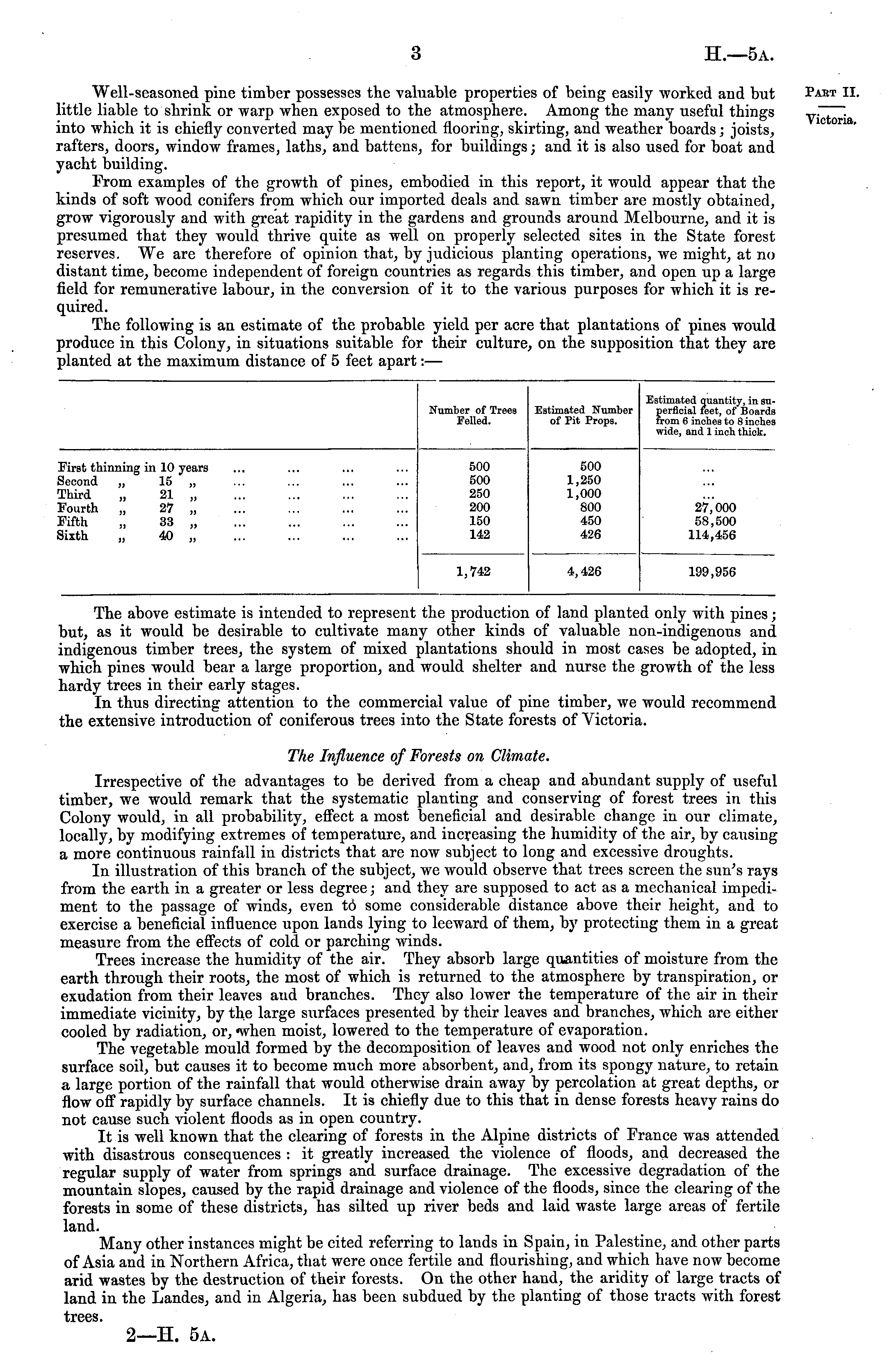 Well-seasoned pine timber possesses the valuable properties of being easily worked and but little liable to shrink or warp when exposed to the atmosphere. Among the many useful things into which it is chiefly converted may be mentioned flooring, skirting, and weather boards; joists, rafters, doors, window frames, laths, and battens, for buildings; and. it is also used for boat and yacht building. From examples of the growth of pines, embodied in this report, it would appear that the kinds of soft wood conifers from which our imported deals and sawn timber are mostly obtained, grow vigorously and with great rapidity in the gardens and grounds around Melbourne, and it is presumed that they would thrive quite as well on properly selected sites in the State forest reserves. We are therefore of opinion that, by judicious planting operations, we might, at no distant time, become independent of foreign countries as regards this timber, and open up a large field for remunerative labour, in the conversion of it to the various purposes for which it is required. The following is an estimate of the probable yield per acre that plantations of pines would produce in this Colony, in situations suitable for their culture, on the supposition that they are planted at the maximum distance of 5 feet apart:—
