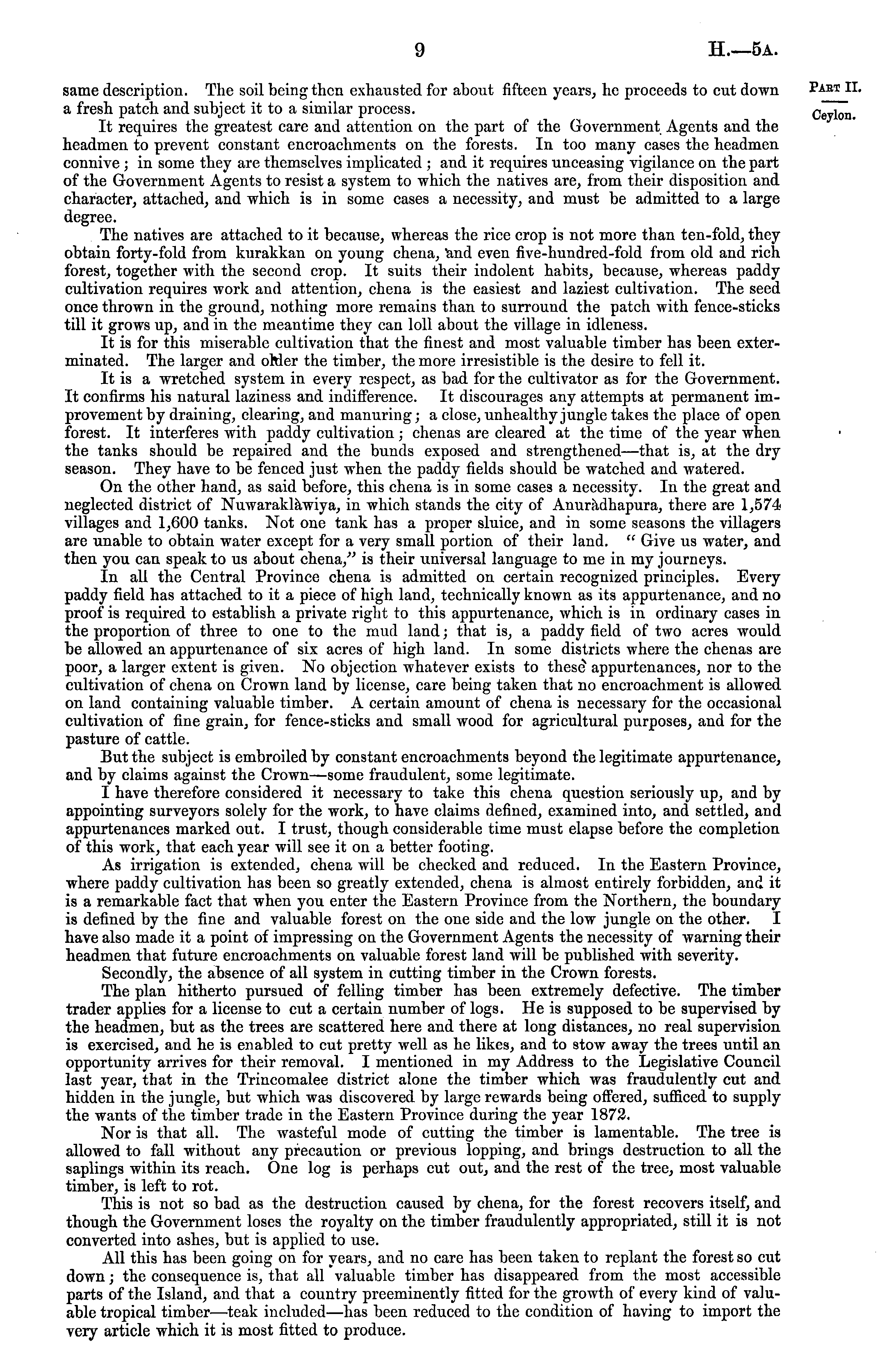 same description. The soil being then exhausted for about fifteen years, he proceeds to cut down a fresh patch and subject it to a similar process. It requires the greatest care and attention on the part of the Government Agents and the headmen to prevent constant encroachments on the forests. In too many cases the headmen connive ; in some they are themselves implicated ; and it requires unceasing vigilance on the part of the Government Agents to resist a system to which the natives are, from their disposition and character, attached, and which is in some cases a necessity, and must be admitted to a large degree. The natives are attached to it because, whereas the rice crop is not more than ten-fold, they obtain forty-fold from kurakkan on young chena, Und even five-hundred-fold from old and rich forest, together with the second crop. It suits their indolent habits, because, whereas paddy cultivation requires work and attention, chena is the easiest and laziest cultivation. The seed once thrown in the ground, nothing more remains than to surround the patch with fence-sticks till it grows up, and in the meantime they can 101 l about the village in idleness. It is for this miserable cultivation that the finest and most valuable timber has been exterminated. The larger and oMer the timber, the more irresistible is the desire to fell it. It is a wretched system in every respect, as bad for the cultivator as for the Government. It confirms his natural laziness and indifference. It discourages any attempts at permanent improvement by draining, clearing, and manuring; a close, unhealthy jungle takes the place of open forest. It interferes with paddy cultivation; chenas are cleared at the time of the year when the tanks should be repaired and the bunds exposed and strengthened—that is, at the dry season. They have to be fenced just when the paddy fields should be watched and watered. On the other hand, as said before, this chena is in some cases a necessity. In the great and neglected district of Nuwaraklawiya, in which stands the city of Anuradhapura, there are 1,574 villages and 1,600 tanks. Not one tank has a proper sluice, and in some seasons the villagers are unable to obtain water except for a very small portion of their land. " Give us water, and then you can speak to us about chena," is their universal language to me in my journeys. In all the Central Province chena is admitted on certain recognized principles. Every paddy field has attached to it a piece of high land, technically known as its appurtenance, and no proof is required to establish a private right to this appurtenance, which is in ordinary cases in the proportion of three to one to the mud land; that is, a paddy field of two acres would be allowed an appurtenance of six acres of high land. In some districts where the chenas are poor, a larger extent is given. No objection whatever exists to thesd appurtenances, nor to the cultivation of chena on Crown land by license, care being taken that no encroachment is allowed on land containing valuable timber. A certain amount of chena is necessary for the occasional cultivation of fine grain, for fence-sticks and small wood for agricultural purposes, and for the pasture of cattle. But the subject is embroiled by constant encroachments beyond the legitimate appurtenance, and by claims against the Crown—some fraudulent, some legitimate. I have therefore considered it necessary to take this chena question seriously up, and by appointing surveyors solely for the work, to have claims defined, examined into, and settled, and appurtenances marked out. I trust, though considerable time must elapse before the completion of this work, that each year will see it on a better footing. As irrigation is extended, chena will be checked and reduced. In the Eastern Province, where paddy cultivation has been so greatly extended, chena is almost entirely forbidden, and it is a remarkable fact that when you enter the Eastern Province from the Northern, the boundary is defined by the fine and valuable forest on the one side and the low jungle on the other. I have also made it a point of impressing on the Government Agents the necessity of warning their headmen that future encroachments on valuable forest land will be published with severity. Secondly, the absence of all system in cutting timber in the Crown forests. The plan hitherto pursued of felling timber has been extremely defective. The timber trader applies for a license to cut a certain number of logs. He is supposed to be supervised by the headmen, but as the trees are scattered here and there at long distances, no real supervision is exercised, and he is enabled to cut pretty well as he likes, and to stow away the trees until an opportunity arrives for their removal. I mentioned in my Address to the Legislative Council last year, that in the Trincomalee district alone the timber which was fraudulently cut and hidden in the jungle, but which was discovered by large rewards being offered, sufficed to supply the wants of the timber trade in the Eastern Province during the year 1872. Nor is that all. The wasteful mode of cutting the timber is lamentable. The tree is allowed to fall without any precaution or previous lopping, and brings destruction to all the saplings within its reach. One log is perhaps cut out, and the rest of the tree, most valuable timber, is left to rot. This is not so bad as the destruction caused by chena, for the forest recovers itself, and though the Government loses the royalty on the timber fraudulently appropriated, still it is not converted into ashes, but is applied to use. All this has been going on for years, and no care has been taken to replant the forest so cut down; the consequence is, that all valuable timber has disappeared from the most accessible parts of the Island, and that a country preeminently fitted for the growth of every kind of valuable tropical timber—teak included—has been reduced to the c
