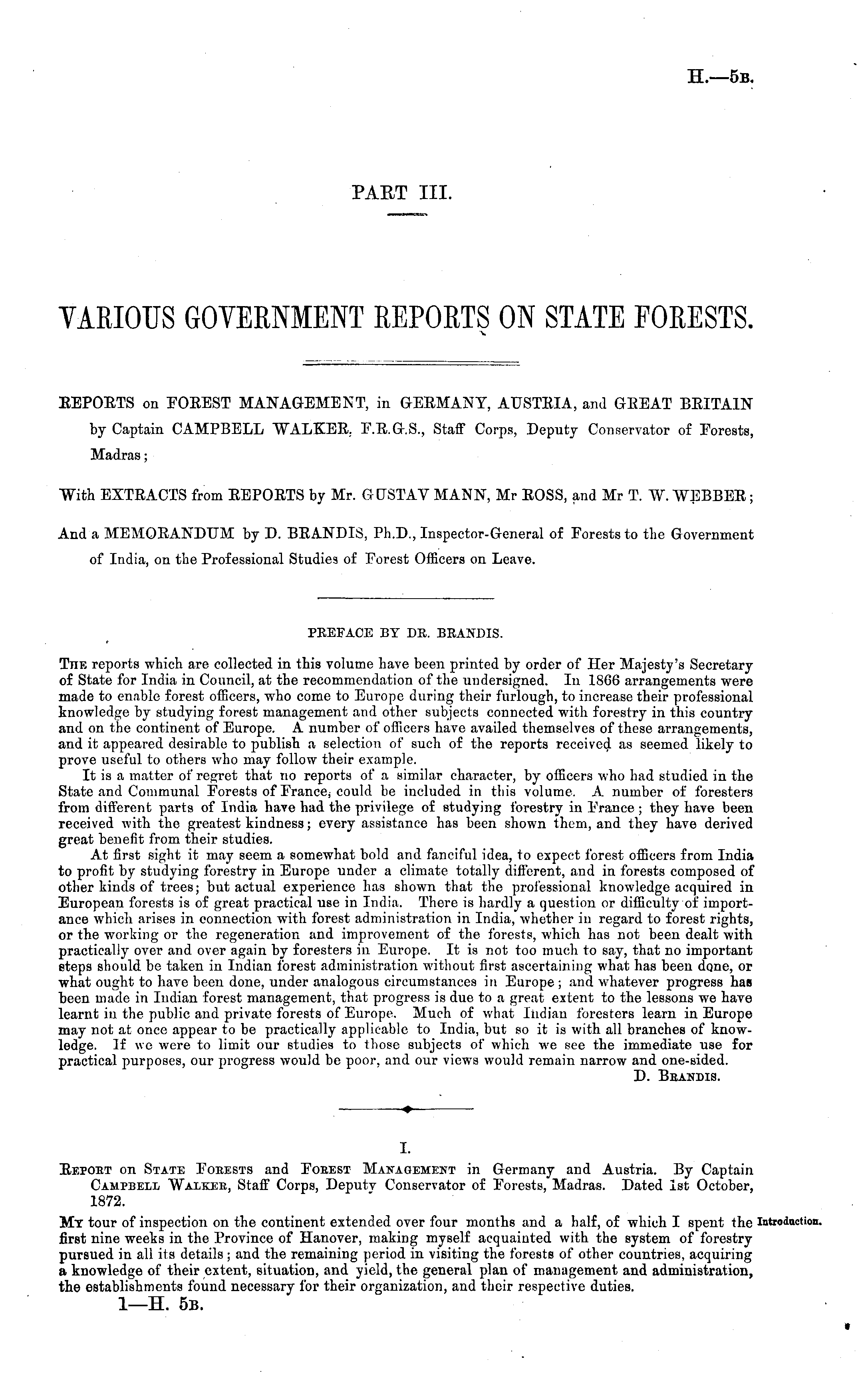 REPORTS on FOREST MANAGEMENT, in GERMANY, AUSTRIA, and GREAT BRITAIN by Captain CAMPBELL WALKER F.R.G.S., Staff Corps, Deputy Conservator of Forests, Madras; With EXTRACTS from REPORTS by Mr. GUSTAV MANN, Mr ROSS, and Mr T. W. WEBBER j And a MEMORANDUM by D. BRANDIS, Ph.D., Inspector-General of Forests to the Government of India, on the Professional Studies of Forest Officers on Leave.