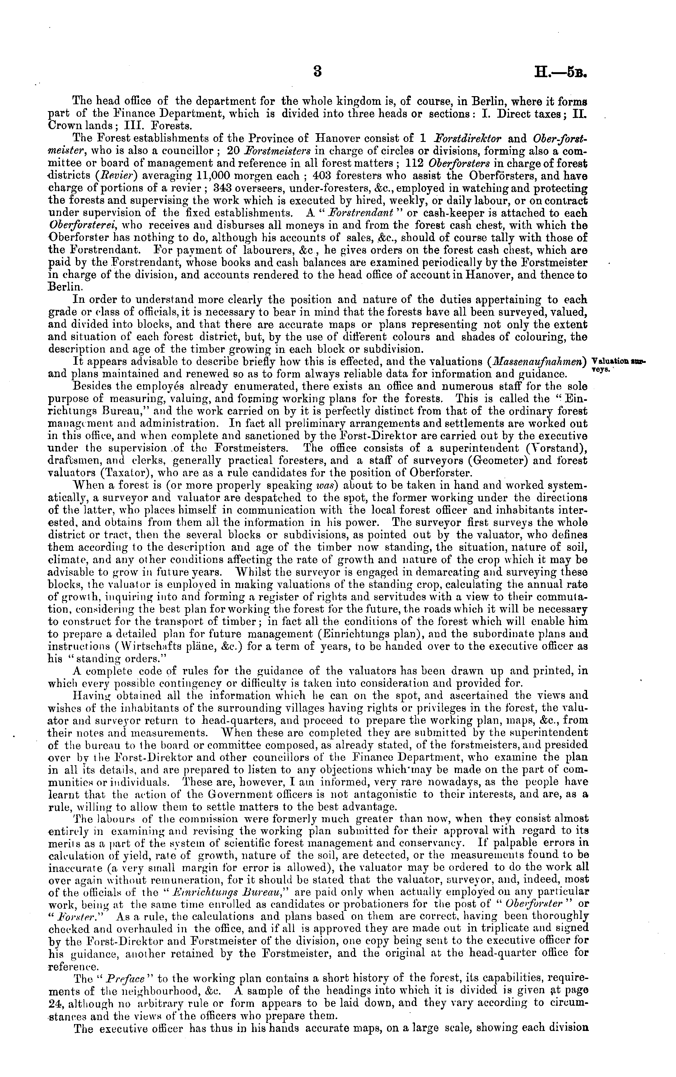 The head office of the department for the whole kingdom is, of course, in Berlin, where it forms part of the Finance Department, which is divided into three heads or sections :I. Direct taxes; 11. Crown lands ; 111. Forests. The Forest establishments of the Province of Hanover consist of 1 Forstdirelctor and Ober-forst-meister, who is also a councillor ; 20 Forstmeisters in charge of circles or divisions, forming also a committee or board of management and reference in all forest matters ; 112 Oberforsters in charge of forest districts (Revier) averaging 11,000 morgen each ; 403 foresters who assist the Oberforsters, and have charge of portions of a revier ; 343 overseers, under-foresters, &c, employed in watching and protecting the forests and supervising the work which is executed by hired, weekly, or daily labour, or on contract under supervision of the fixed establishments. A " Forstrendant "or cash-keeper is attached to each Oberforsterei, who receives and disburses all moneys in and from the forest cash chest, with which the Oberforster has nothing to do, although his accounts of sales, &c, should of course tally with those of the Forstrendant. For payment of labourers, &c ,he gives orders on the forest cash chest, which are paid by the Forstrendant, whose books and cash balances are examined periodically by the Forstmeister in charge of the division, and accounts rendered to the head office of account in Hanover, and thence to Berlin. In order to understand more clearly the position and nature of the duties appertaining to each grade or class of officials, it is necessary to bear in mind that the forests have all been surveyed, valued, and divided into blocks, and that there are accurate maps or plans representing not only the extent and situation of each forest district, but, by the use of different colours and shades of colouring, the description and age of the timber growing in each block or subdivision. It appears advisable to describe briefly how this is effected, and the valuations (Massenaufnahmen) and plans maintained and renewed so as to form always reliable data for information and guidance. Besides the employes already enumerated, there exists an office and numerous staff for the sole purpose of measuring, valuing, and forming working plans for tho forests. This is called the " Einrichtungs Bureau," and the work carried on by it is perfectly distinct from that of the ordinary forest management and administration. In fact all preliminary arrangements and settlements are worked out in this office, and when complete and sanctioned by the Forst-Direktor are carried out by the executive under the supervision of tho Forstmeisters. The office consists of a superintendent (Vorstand), draftsmen, and clerks, generally practical foresters, and a staff of surveyors (Geometer) and forest valuators (Taxator), who are as a rule candidates for the position of Oberforster. When a forest is (or more properly speaking was) about to be taken in hand and worked systematically, a surveyor and valuator are despatched to the spot, the former working under the directions of the latter, who places himself in communication with the local forest officer and inhabitants interested, and obtains from them all the information in his power. The surveyor first surveys the whole district or tract, then the several blocks or subdivisions, as pointed out by the valuator, who defines them according to the description and age of the timber now standing, the situation, nature of soil, climate, and any other conditions affecting the rate of growth and nature of the crop which it may be advisable to grow in future years. Whilst the surveyor is engaged in demarcating and surveying these blocks, the valuator is employed in making valuations of the standing crop, calculating the annual rate of growth, inquiring into and forming a register of rights and servitudes with a view to their commutation, considering the best plan for working the forest for the future, the roads which it will be necessary to construct for the transport of timber; in fact all the conditions of the forest which will enable him to prepare a detailed plan for future management (Einrichtungs plan), and the subordinate plans and instructions (Wirtschafts plane, &c.) for a term of years, to be handed over to the executive officer as his " standing orders." A complete code of rules for the guidance of the valuators has been drawn up and printed, in which every possible contingency or difficulty is taken into consideration and provided for. Having obtained all the information which he can on the spot, and ascertained the views and wishes of the inhabitants of the surrounding villages having rights or privileges in the forest, tho valuator and surveyor return to head-quarters, and proceed to prepare the working plan, maps, &c, from their notes and measurements. When these are completed they are submitted by the superintendent of the bureau to ihe hoard or committee composed, as already stated, of the forstmeisters, and presided over by the Forst-Direktor and other councillors of the Finance Department, who examine the plan in all its details, and are prepared to listen to any objections whichmay be made on the part of communities or individuals. These are, however, lam informed, very rare nowadays, as the people have learnt that the action of the Government officers is not antagonistic to their interests, and are, as a rule, willing to allow them to settle matters to the best advantage. The labours of the commission were formerly much greater than now, when they consist almost entirely in examining and revising the working plan submitted for their approval with regard to its merits as a part of the system of scientific forest management and conservancy. If palpable errors in calculation of yield, rate of growth, nature of the soil, are detected, or the measurements found to be inaccurate (a very small margin for error is allowed), the valuator may b
