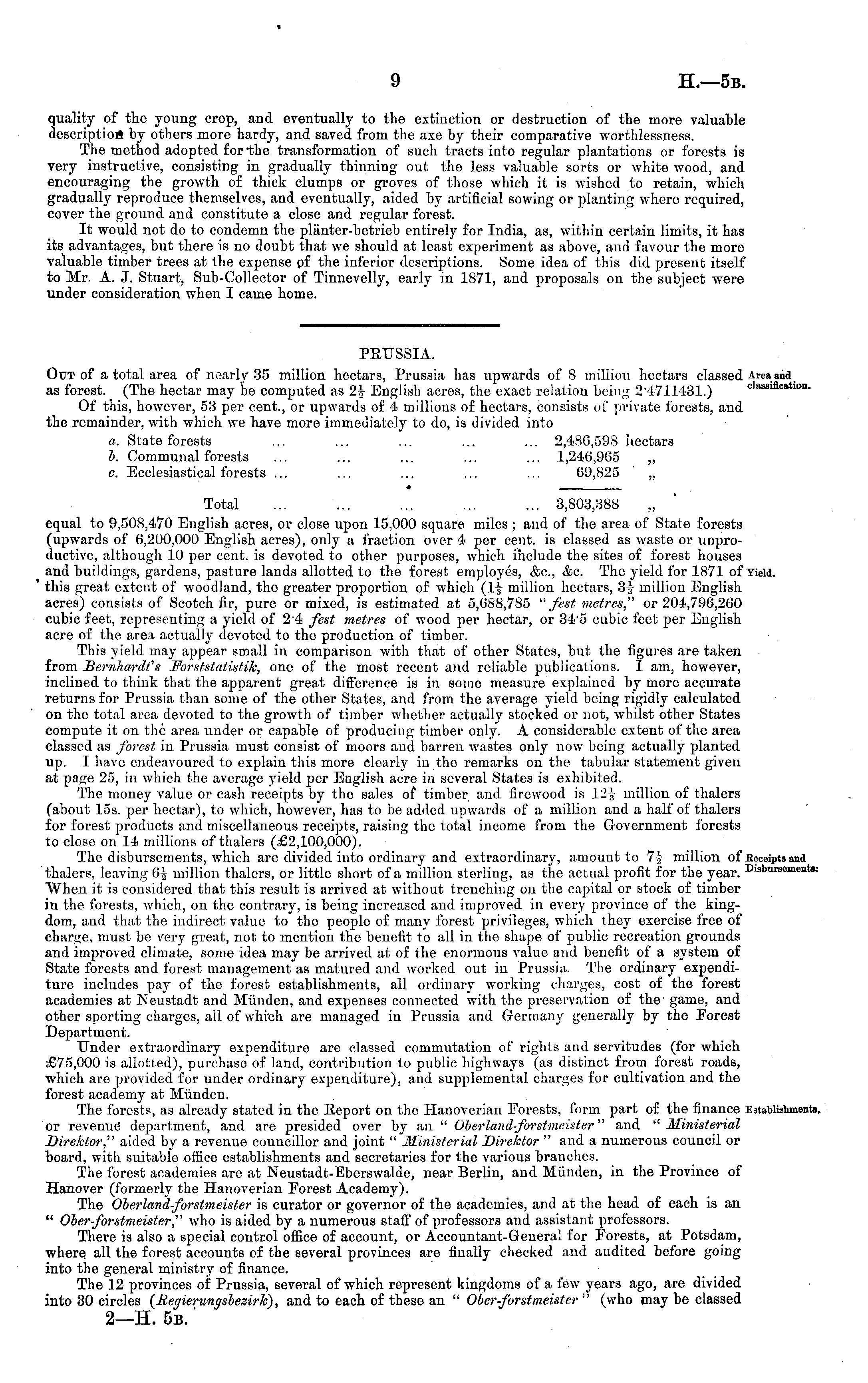 PRUSSIA. Out of a total area of nearly 35 million hectars, Prussia has upwards of 8 million hectars classed as forest. (The hectar may be computed as 2-h English acres, the exact relation being 2'4711431.) Of this, however, 53 per cent., or upwards of 4 millions of hectars, consists of private forests, and the remainder, with which we have more immediately to do, is divided into a. State forests ... ... ... ... ... 2,486,598 hectars b. Communal forests ... ... ... ... ... 1,246,965 ~ c. Ecclesiastical forests ... ... ... ... ... 69,825 „ * ________ Total ... ... ... ... ... 3,803,388 equal to 9,508,470 English acres, or close upon 15,000 square miles ; and of the area of State forests (upwards of 6,200,000 English acres), only a fraction over 4 per cent, is classed as waste or unproductive, although 10 per cent, is devoted to other purposes, which include the sites of forest houses and buildings, gardens, pasture lands allotted to the forest employes, &c, &c. The yield for 1871 of this great extent of woodland, the greater proportion of which (1-|- million hectars, 3^- million English acres) consists of Scotch fir, pure or mixed, is estimated at 5,688,785 " fest metres," or 204,796,260 cubic feet, representing a yield of 2'4 fest metres of wood per hectar, or 34'5 cubic feet per English acre of tho area actually devoted to the production of timber. This yield may appear small in comparison with that of other States, but the figures are taken from Bernhardt's Forststatistik, one of the most recent and reliable publications. I am, however, inclined to think that the apparent great difference is in some measure explained by more accurate returns for Prussia than some of the other States, and from the average yield being rigidly calculated on the total area devoted to the growth of timber whether actually stocked or not, whilst other States compute it on the area under or capable of producing timber only. A considerable extent of the area classed as forest in Prussia must consist of moors and barren wastes only now being actually planted up. I have endeavoured to explain this more clearly in the remarks on the tabular statement given at page 25, in which the average yield per English acre in several States is exhibited. The money value or cash receipts by the sales of timber and firewood is 12^ million of thalers (about 15s. per hectar), to which, however, has to be added upwards of a million and a half of thalers for forest products and miscellaneous receipts, raising the total income from the Government forests to close on 14 millions of thalers (£2,100,000). The disbursements, which are divided into ordinary and extraordinary, amount to 7_- million of. thalers, leaving 6.j million thalers, or little short of a million sterling, as the actual profit for the year. ■ When it is considered that this result is arrived at without trenching on the capital or stock of timber in the forests, which, on the contrary, is being increased and improved in every province of the kingdom, and that the indirect value to the people of many forest privileges, which they exercise free of charge, must be very great, not to mention the benefit to all in the shape of public recreation grounds and improved climate, some idea may be arrived at of the enormous value and benefit of a system of State forests and forest management as matured and worked out in Prussia. The ordinary expenditure includes pay of the forest establishments, all ordinary working charges, cost of the forest academies at Neustadt and Miinden, and expenses connected with the preservation of the- game, and other sporting charges, all of which are managed in Prussia and Germany generally by the Forest Department. Under extraordinary expenditure are classed commutation of rights and servitudes (for which £75,000 is allotted), purchase of land, contribution to public highways (as distinct from forest roads, which are provided for under ordinary expenditure), and supplemental charges for cultivation and the forest academy at Miinden. The forests, as already stated in the Report on the Hanoverian Forests, form part of the finance : or revenue department, and are presided over by an " Oberland-forstmehter" and " Ministerial Direktor," aided by a revenue councillor and joint " Ministerial Birektor " and a numerous council or board, with suitable office establishments and secretaries for the various branches. The forest academies are at Neustadt-Eberswalde, near Berlin, and Miinden, in the Province of Hanover (formerly the Hanoverian Forest Academy). The Oberland-forstmeister is curator or governor of the academies, and at the head of each is an " Ober-forstmeister," who is aided by a numerous staff of professors and assistant professors. There is also a special control office of account, or Accountant-General for Forests, at Potsdam, where all the forest accounts of the several provinces are finally checked and audited before going into the general ministry of finance. The 12 provinces of Prussia, several of which represent kingdoms of a few years ago, are divided into 30 circles (Reaierungsbezirk), and to each of these an " Ober-forstmeister " (who may be classed 2—H. sb.