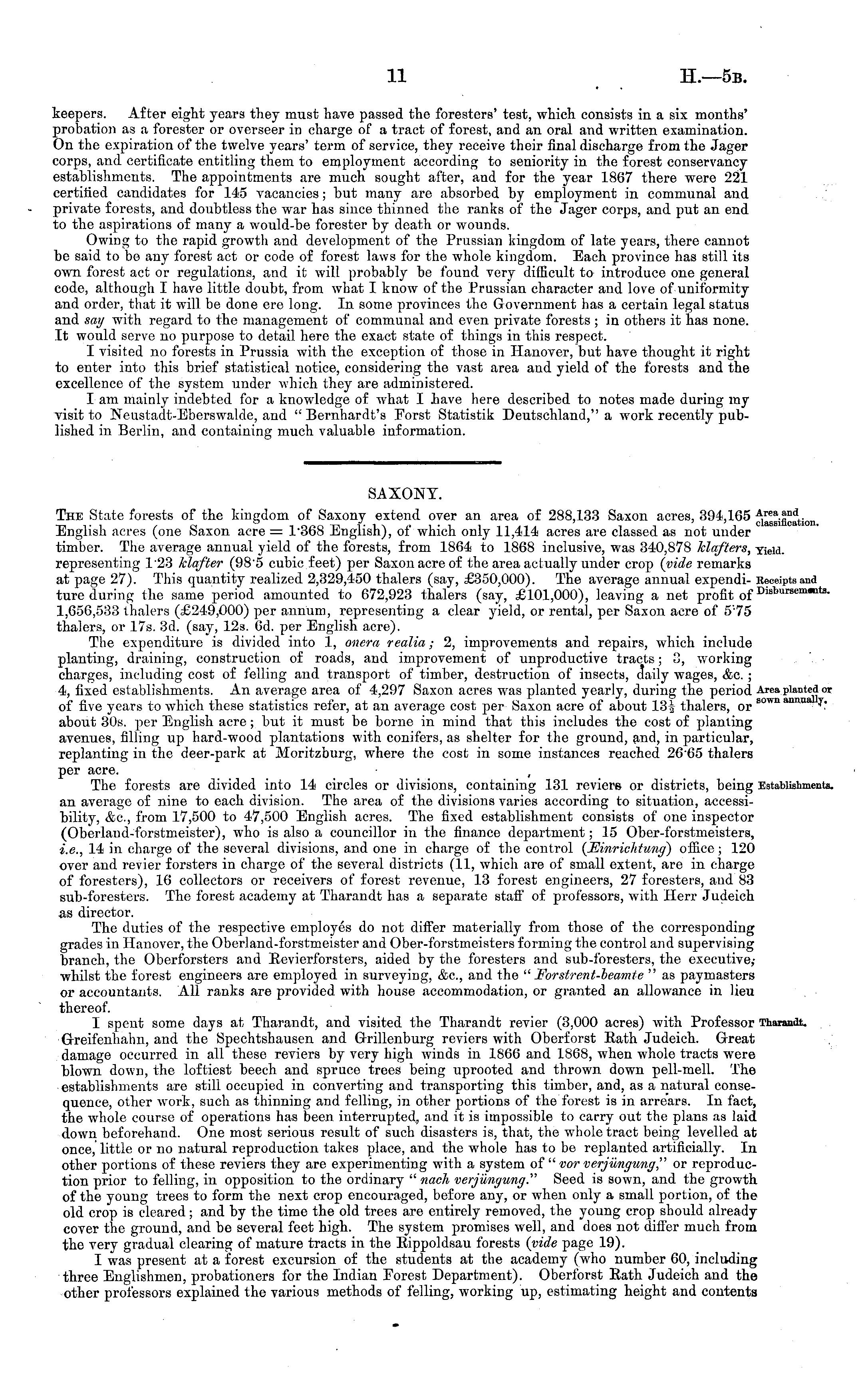 SAXONY. The State forests of the kingdom of Saxony extend over an area of 288,133 Saxon acres, 394,165 ; English acres (one Saxon acre = T368 English), of which only 11,414 acres are classed as not under timber. The average annual yield of the forests, from 1864 to 1868 inclusive, was 340,878 klqfters, ■ representing T23 Mafter (98'5 cubic feet) per Saxon acre of the area actually under crop (vide remarks at page 27). This quantity realized 2,329,450 thalers (say, £350,000). The average annual expendi-: ture during the same period amounted to 672,923 thalers (say, £101,000), leaving a net profit of 1,656,533 thalers (£249,000) per annum, representing a clear yield, or rental, per Saxon acre of 5;75 thalers, or 17s. 3d. (say, 12s. 6d. per English acre). The expenditure is divided into 1, onera realia; 2, improvements and repairs, which include planting, draining, construction of roads, and improvement of unproductive tracts; 2, working charges, including cost of felling and transport of timber, destruction of insects, daily wages, &c. ; 4, fixed establishments. An average area of 4,297 Saxon acres was planted yearly, during the period of five years to which these statistics refer, at an average cost per Saxon acre of about 13^ thalers, or about 30s. per English acre ; but it must be borne in mind that this includes the cost of planting avenues, filling up hard-wood plantations with conifers, as shelter for the ground, and, in particular, replanting in the deer-park at Moritzburg, where the cost in some instances reached 2665 thalers per acre. The forests are divided into 14 circles or divisions, containing 131 reviers or districts, being an average of nine to each division. The area of the divisions varies according to situation, accessibility, &c., from 17,500 to 47,500 English acres. The fixed establishment consists of one inspector (Oberland-forstmeister), who is also a councillor in the finance department; 15 Ober-forstmeisters, i.e., 14 in charge of the several divisions, and one in charge of the control (Einrichtung) office ; 120 over and revier forsters in charge of the several districts (11, which are of small extent, are in charge of foresters), 16 collectors or receivers of forest revenue, 13 forest engineers, 27 foresters, and 83 sub-foresters. The forest academy at Tharandt has a separate staff of professors, with Herr Judeich as director. The duties of the respective employes do not differ materially from those of the corresponding grades in Hanover, the Oberland-forstmeister and Ober-forstmeisters forming the control and supervising branch, the Oberforsters and Revierforsters, aided by the foresters and sub-foresters, the executive,whilst the forest engineers are employed in surveying, &c, and the " Forstrent-beamie " as paymasters or accountants. All ranks are provided with house accommodation, or granted an allowance in lieu thereof. I spent some days at Tharandt, and visited the Tharandt revier (3,000 acres) with Professor Grreifenhahn, and the Spechtshausen and Grillenburg reviers with Oberforst Rath Judeich. Great damage occurred in all these reviers by very high winds in 1866 and 1868, when whole tracts were blown down, the loftiest beech and spruce trees being uprooted and thrown down pell-mell. The establishments are still occupied in converting and transporting this timber, and, as a natural consequence, other work, such as thinning and felling, in other portions of the forest is in arrears. In fact, the whole course of operations has been interrupted, and it is impossible to carry out the plans as laid down beforehand. One most serious result of such disasters is, that, the whole tract being levelled at once, little or no natural reproduction takes place, and the whole has to be replanted artificially. In other portions of these reviers they are experimenting with a system of " vor verjungimg" or reproduction prior to felling, in opposition to the ordinary " nach verjungung." Seed is sown, and the growth of the young trees to form the next crop encouraged, before any, or when only a small portion, of the old crop is cleared; and by the time the old trees are entirely removed, the young crop should already cover the ground, and be several feet high. The system promises well, and does not differ much from the very gradual clearing of mature tracts in the Rippoldsau forests (vide page 19). I was present at a forest excursion of the students at the academy (who number 60, including three Englishmen, probationers for the Indian Forest Department). Oberforst Rath Judeich and the other professors explained the various methods of felling, working up, estimating height and contents