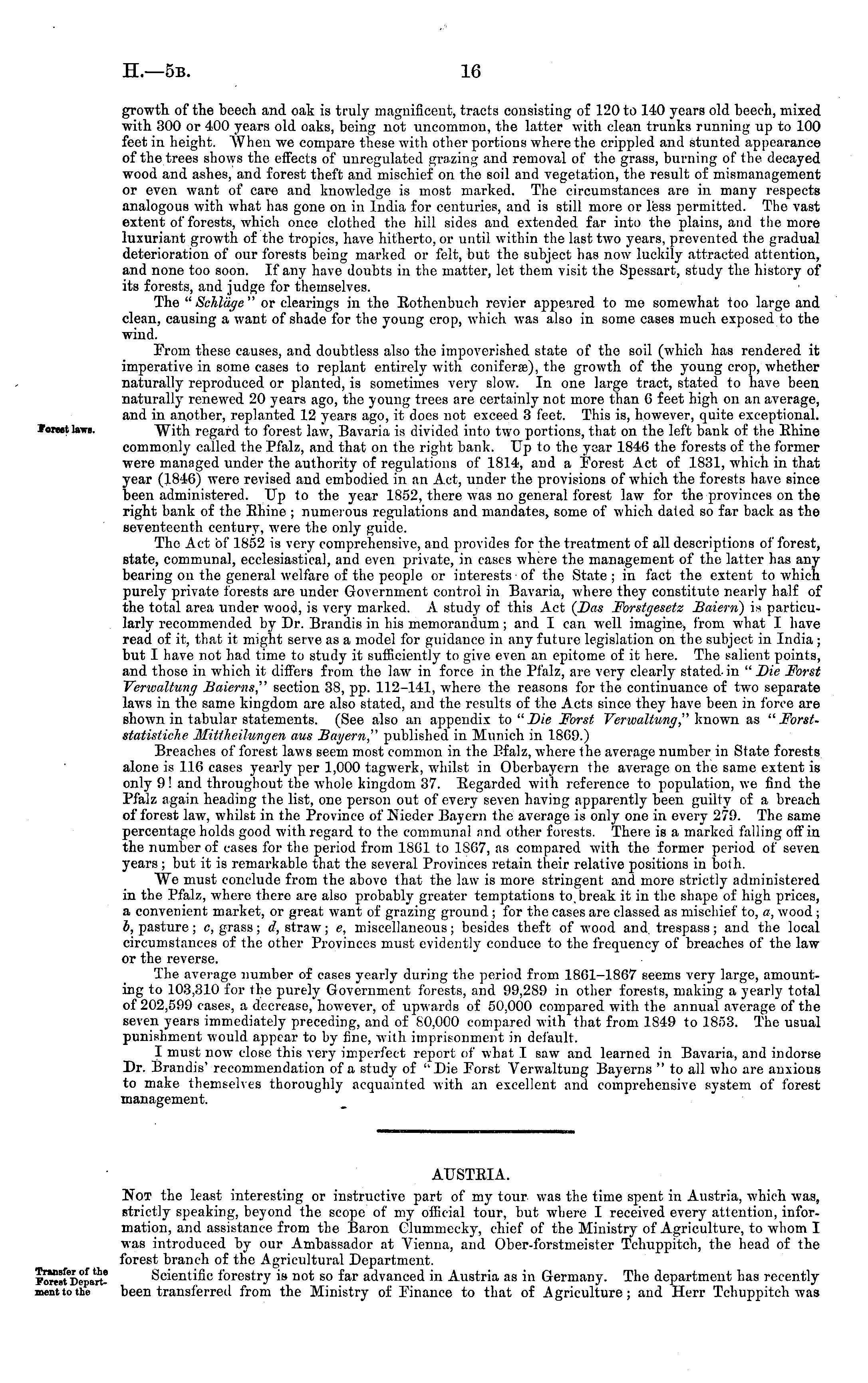 AUSTRIA. Not the least interesting or instructive part of my tour was the time spent in Austria, which was, strictly speaking, beyond the scope of my official tour, but where I received every attention, information, and assistance from the Baron Clummecky, chief of the Ministry of Agriculture, to whom I was introduced by our Ambassador at Vienna, and Ober-forstmeister Tchuppitch, the head of the forest branch of the Agricultural Department. Scientific forestry is not so far advanced in Austria as in Germany. The department has recently been transferred from the Ministry of Finance to that of Agriculture; and Hcrr Tchuppitch was