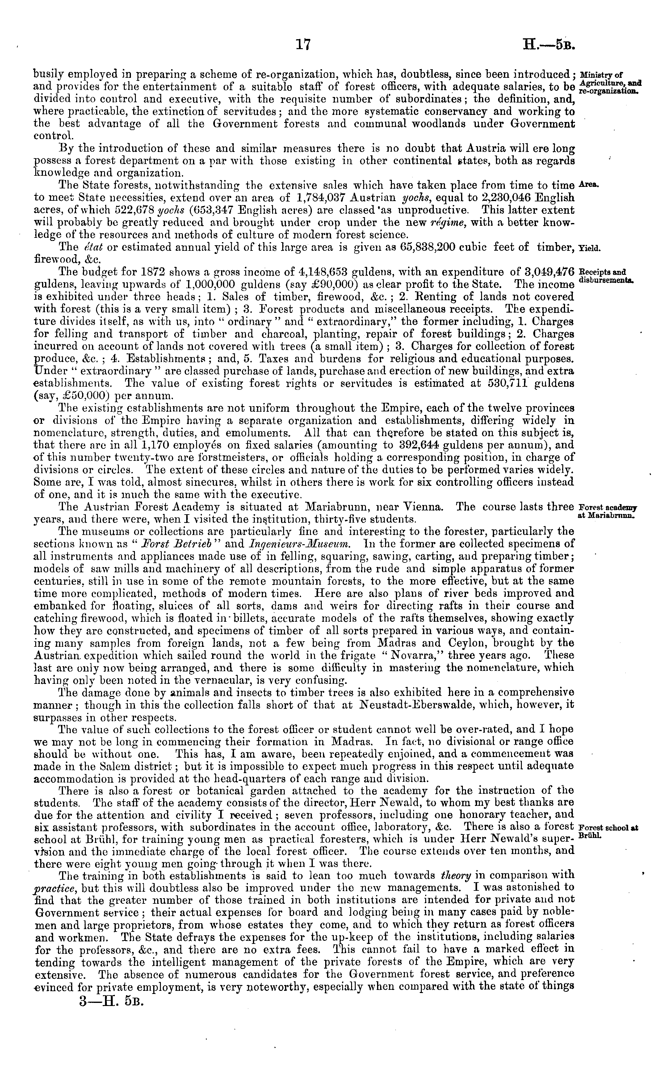 busily employed in preparing a scheme of re-organization, which has, doubtless, since been introduced; and provides for the entertainment of a suitablo staff of forest officers, with adequate salaries, to be divided into control and executive, with the requisite number of subordinates; the definition, and, where practicable, the extinction of servitudes; and the more systematic conservancy and working to the best advantage of all the Government forests and communal woodlands under Government control. By the introduction of these and similar measures there is no doubt that Austria will ere long possess a forest department on a par with those existing in other continental states, both as regards knowledge and organization. The State forests, notwithstanding the extensive sales which have taken place from time to time to meet State necessities, extend over an area of 1,784,037 Austrian yochs, equal to 2,230,046 English acres, of which 522,678 yochs (653,347 English acres) are classed'as unproductive. This latter extent will probably be greatly reduced and brought under crop under the new regime, with a better knowledge of the resources and methods of culture of modern forest science. The etat or estimated annual yield of this large area is given as 65,838,200 cubic feet of timber, firewood, &c. The budget for 1872 shows a gross income of 4,148,653 guidons, with an expenditure of 3,049,476 guldens, leaving upwards of 1,000,000 guldens (say £90,000) as clear profit to the State. The income is exhibited under three heads; 1. Sales of timber, firewood, &c. ;2. Renting of lands not covered with forest (this is a very small item) ;3. Forest products and miscellaneous receipts. The expenditure divides itself, as with us, into " ordinary" and ': extraordinary," the former including, 1. Charges for felling and transport of timber and charcoal, planting, repair of forest buildings; 2. Charges incurred on account of lands not covered with trees (a small item) ; 3. Charges for collection of forest produce, &c. ; 4. Establishments ; and, 5. Taxes and burdens for religious and educational purposes. Under " extraordinary " are classed purchase of lands, purchase and erection of new buildings, and extra establishments. The value of existing forest rights or servitudes is estimated at 530,711 guldens (say, £50,000) per annum. The existing establishments are not uniform throughout the Empire, each of the twelve provinces or divisions of the Empire having a separate organization and establishments, differing widely in nomenclature, strength, duties, and emoluments. All that can therefore be stated on this subject is, that there are in all 1,170 employes on fixed salaries (amounting to 392,644 guldens per annum), and of this number twenty-two are forstmeisters, or officials holding a corresponding position, in charge of divisions or circles. The extent of these circles and nature of the duties to be performed varies widely. Some arc, I was told, almost sinecures, whilst in others there is work for six controlling officers instead of one, and it is much the same with the executive. The Austrian Forest Academy is situated at Mariabrunn, near Vienna. The course lasts three years, and there were, when I visited the institution, thirty-five students. The museums or collections are particularly fine and interesting to the forester, particularly the sections known as " Forst Bctrieb " and Ingenienrs-Museam. In the former are collected specimens of all instruments and appliances made use of in felling, squaring, sawing, carting, and preparing timber; models of saw mills and machinery of all descriptions, from the rude and simple apparatus of former centuries, still in use in some of the remote mountain forests, to the more effective, but at the same time more complicated, methods of modern times. Here are also plans of river beds improved and embanked for floating, sluices of all sorts, dams and weirs for directing rafts in their course and catching firewood, which is floated in billets, accurate models of the rafts themselves, showing exactly how they are constructed, and specimens of timber of all sorts prepared in various ways, and containing many samples from foreign lands, not a few being from Madras and Ceylon, brought by the Austrian expedition which sailed round the world in the frigate " Novarra," three years ago. These last are only now being arranged, and there is some difficulty in mastering the nomenclature, which having only been noted in the vernacular, is very confusing. The damage done by animals and insects to timber trees is also exhibited here in a comprehensive manner ; though in this the collection falls short of that at Neustadt-Eberswalde, which, however, it surpasses in other respects. The value of such collections to the forest officer or student cannot well be over-rated, and I hope we may not be long in commencing their formation in Madras. In fact, no divisional or range office should be without one. This has, lam aware, been repeatedly enjoined, and a commencement was made in the Salem district; but it is impossible to expect much progress in this respect until adequate accommodation is provided at the head-quarters of each range and division. There is also a forest or botanical garden attached to the academy for tho instruction of the students. The staff of the academy consists of the director, Herr Newald, to whom my best thanks are due for the attention and civility I received ; seven professors, including one honorary teacher, and six assistant professors, with subordinates in the account office, laboratory, &c. There is also a forest school at Bruhl, for training young men as practical foresters, which is under Herr Newald's supervision and the immediate charge of the local forest officer. The course extends over ten months, and there were eight young men going- through it when I was there. The training in both establishments is said to lean too much towards theory in comparison wi