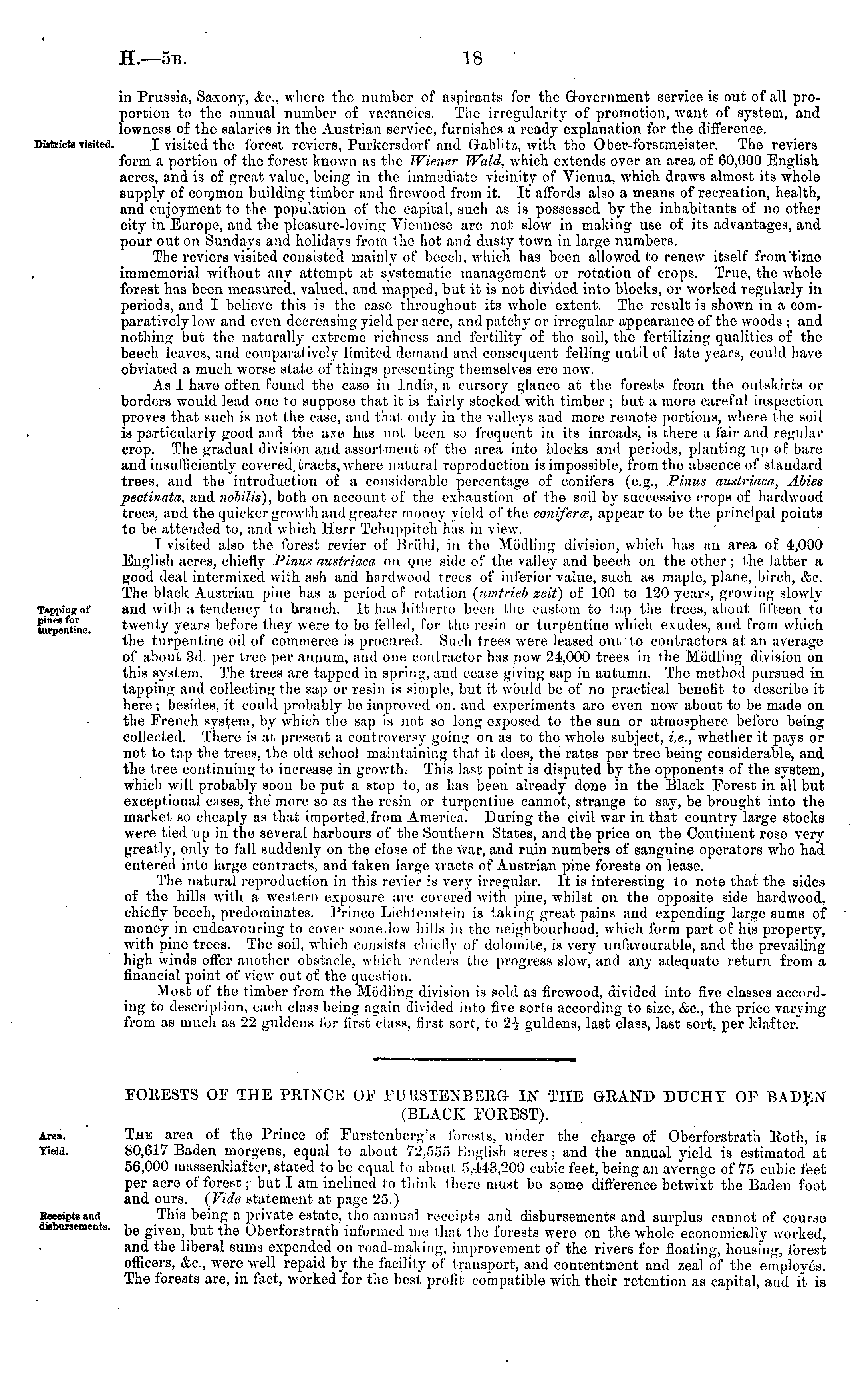 in Prussia, Saxony, _c, where the number of aspirants for the Government service is out of all proportion to the annual number of vacancies. Tho irregularity of promotion, want of system, and lowness of the salaries in the Austrian service, furnishes a ready explanation for the difference. I visited the forest reviers, Purkersdorf and Gablitz, with the Ober-forstmeister. The reviers form a portion of the forest known as the Wiener Wald, which extends over an area of 60,000 English acres, and is of great value, being in the immediate vicinity of Vienna, which draws almost its whole supply of common building timber and firewood from it. It affords also a means of recreation, health, and enjoyment to the population of the capital, such as is possessed by the inhabitants of no other city in Europe, and the pleasure-loving Viennese are not slow in making use of its advantages, and pour out on Sundays and holidays from the hot and dusty town in large numbers. The reviers visited consisted mainly of beech, which has been allowed to renew itself from'time immemorial without any attempt at systematic management or rotation of crops. True, the w Thole forest has been measured, valued, and mapped, but it is not divided into blocks, or worked regularly in periods, and I believe this is the case throughout its whole extent. Tho result is shown in a comparatively low and even decreasing yield per acre, and patchy or irregular appearance of the woods ; and nothing but the naturally extreme richness and fertility of the soil, the fertilizing qualities of the beech leaves, and comparatively limited demand and consequent felling until of late years, could have obviated a much worse; state of things presenting themselves ere now. As I have often found the case in India, a cursory glance at the forests from the outskirts or borders would lead one to suppose that it is fairly stocked with timber ; but a more careful inspection proves that such is not the case, and that only in the valleys and more remote portions, where the soil is particularly good and the axe has not been so frequent in its inroads, is there a fair and regular crop. The gradual division and assortment of the area into blocks and periods, planting up of bare and insufficiently covered, tracts, where natural reproduction is impossible, from the absence of standard trees, and tho introduction of a considerable percentage of conifers (e.g., Pinus austriaca, Abies peciinata, and nobilis), both on account of the exhaustion of the soil by successive crops of hardwood trees, and the quicker growth and greater money yield of the conferee, appear to be tho principal points to be attended to, and which Herr Tchuppitch has in view. I visited also the forest revier of Briihl, in the Modling division, which has an area of 4,000 English acres, chiefly Pinus austriaca on Qne side of the valley and beech on the other; the latter a good deal intermixed with ash and hardwood trees of inferior value, such as maple, plane, birch, &e. The black Austrian pine has a period of rotation (umtrieb zeit) of 100 to 120 years, growing slowly and with a tendency' to branch. It has hitherto been the custom to tap the trees, about fifteen to twenty years before they were to be felled, for the resin or turpentine which exudes, and from which the turpentine oil of commerce is procured. Such trees were leased out to contractors at an average of about 3d. per tree per annum, and one contractor has now 24,000 trees in the Modling division on this system. The trees are tapped in spring, and cease giving sap iu autumn. The method pursued in tapping and collecting the sap or resin is simple, but it w rbuld be of no practical benefit to describe it hero; besides, it could probably be improved on. and experiments are even now about to be made on the French system, by which the sap is not so long exposed to the sun or atmosphere before being collected. There is at present a controversy going on as to the whole subject, i.e., whether it pays or not to tap the trees, the old school maintaining that it does, the rates per tree being considerable, and the tree continuing to increase ill growth. This last point is disputed by the opponents of the system, which will probably soon be put a stop to, as has been already done in the Black Forest in all but exceptional cases, the more so as the resin or turpentine cannot, strange to say, be brought into the market so cheaply as that imported from America. During the civil war in that country large stocks were tied tip in the several harbours of the Southern States, and the price on the Continent rose very greatly, only to fall suddenly on the close of the war, and ruin numbers of sanguine operators who had entered into large contracts, and taken large tracts of Austrian pine forests on lease. The natural reproduction in this revier is very irregular. It is interesting to note that the sides of the hills with a western exposure are covered with pine, whilst on the opposite side hardwood, chiefly beech, predominates. Prince Lichtcnstein is taking great pains and expending large sums of money in endeavouring to cover some low hills in the neighbourhood, which form part of his property, with pine trees. The soil, which consists chiefly of dolomite, is very unfavourable, and tho prevailing high winds offer another obstacle, which renders the progress slow, and any adequate return from a financial point of view out of the question. Most of the timber from the Modling division is sold as firewood, divided into five classes according to description, each class being again divided into five sorts according to size, &c, the price varying from as much as 22 guldens for first class, first sort, to 2| guldens, last class, last sort, per klafter.