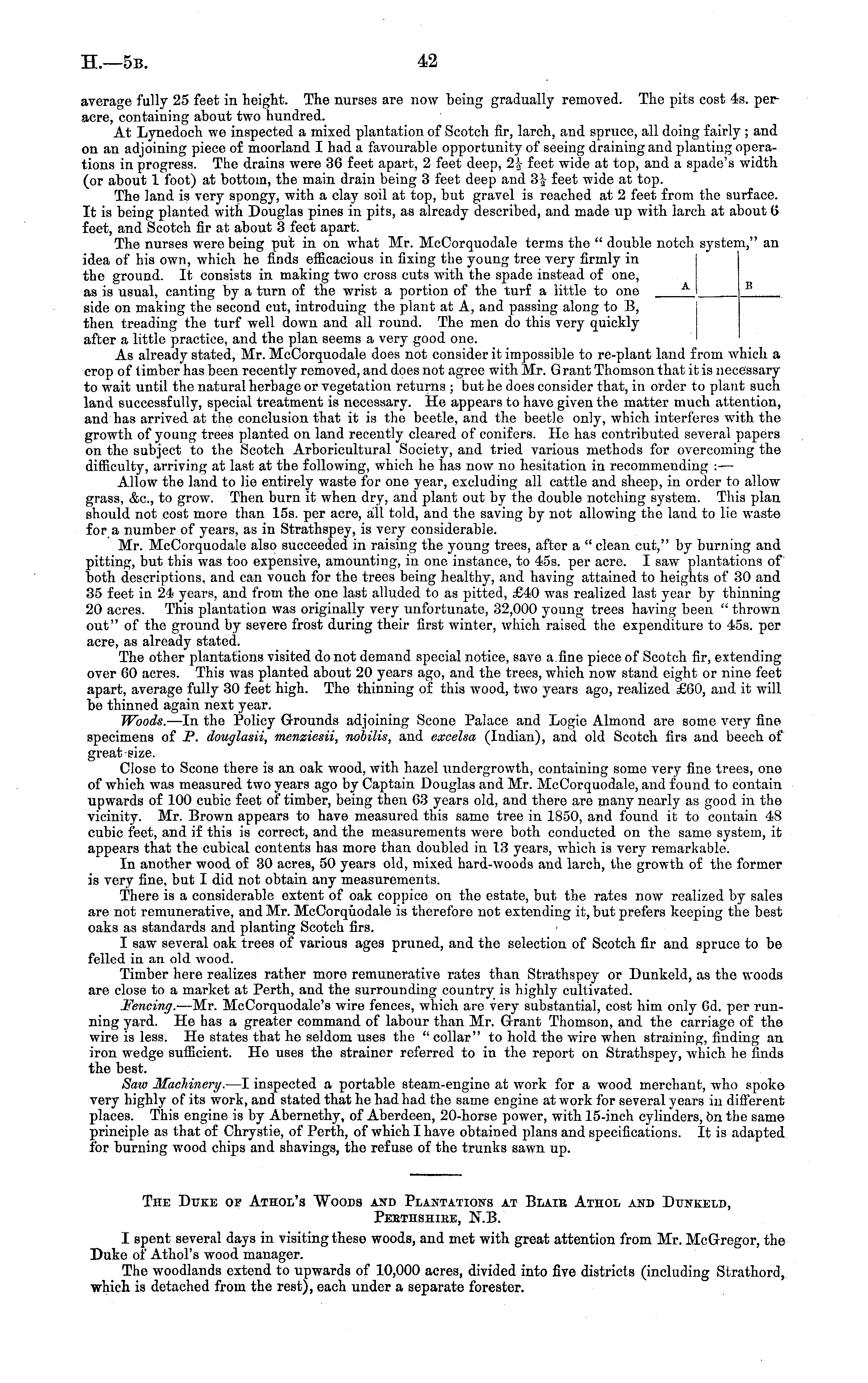 average fully 25 feet in height. The nurses are now being gradually removed. The pits cost 4s. per acre, containing about two hundred. At Lynedoch we inspected a mixed plantation of Scotch fir, larch, and spruce, all doing fairly ; and on an adjoining piece of moorland I had a favourable opportunity of seeing draining and planting operations in progress. The drains were 36 feet apart, 2 feet deep, 2^ feet wide at top, and a spade's width (or about 1 foot) at bottom, the main drain being 3 feet deep and 3^ feet wide at top. The land is very spongy, with a clay soil at top, but gravel is reached at 2 feet from the surface. It is being planted with Douglas pines in pits, as already described, and made up with larch at about 6 feet, and Scotch fir at about 3 feet apart. Tho nurses were being put in on what Mr. McCorquodale terms the " double notch system," an idea of his own, which he finds efficacious in fixing the young tree very firmly in the ground. It consists in making two cross cuts with the spade instead of one, as is usual, canting by a turn of the wrist a portion of the turf a little to one A side on making the second cut, introduing the plant at A, and passing along to B, then treading the turf well down and all round. The men do this very quickly after a little practice, and the plan seems a very good one. As already stated, Mr. McCorquodale does not consider it impossible to re-plant land from which a crop of timber has been recently removed, and does not agree with Mr. G rant Thomson that it is necessary to wait until the natural herbage or vegetation returns ; but he does consider that, in order to plant such land successfully, special treatment is necessary. He appears to have given the matter much attention, and has arrived at the conclusion that it is the beetle, and the beetle only, which interferes with the growth of young trees planted on land recently cleared of conifers. He has contributed several papers on the subject to the Scotch Arboricultural Society, and tried various methods for overcoming the difficulty, arriving at last at the following, which he has now no hesitation in recommending : — Allow the land to lie entirely waste for one year, excluding all cattle and sheep, in order to allow grass, &c, to grow. Then burn it when dry, and plant out by the double notching system. This plan should not cost more than 15s. per acre, all told, and the saving by not allowing the land to lie waste for a number of years, as in Strathspey, is very considerable. Mr. McCorquodale also succeeded in raising the young trees, after a " clean cut," by burning and pitting, but this was too expensive, amounting, in one instance, to 455. per acre. I saw plantations of Doth descriptions, and can vouch for the trees being healthy, and having attained to heights of 30 and 35 feet in 24 years, and from the one last alluded to as pitted, £40 was realized last year by thinning 20 acres. This plantation was originally very unfortunate, 32,000 young trees having been " thrown out" of the ground by severe frost during their first winter, which raised the expenditure to 455. per acre, as already stated. The other plantations visited do not demand special notice, save a fine piece of Scotch fir, extending over 60 acres. This was planted about 20 years ago, and the trees, which now stand eight or nine feet apart, average fully 30 feet high. The thinning of this wood, two years ago, realized £60, and it will be thinned again next year. Woods. —In the Policy Grounds adjoining Scone Palace and Logie Almond are some very fine specimens of P. douglasii, menziesii, nobilis, aud excelsa (Indian), and old Scotch firs and beech of great size. Close to Scone there is an oak wood, with hazel undergrowth, containing some very fine trees, one of which was measured two years ago by Captain Douglas and Mr. McCorquodale, and found to contain upwards of 100 cubic feet of timber, being then 63 years old, and there are many nearly as good in the vicinity. Mr. Brown appears to have measured this same tree in 1850, and found it to contain 48 cubic feet, and if this is correct, and the measurements were both conducted on the same system, it appears that the cubical contents has more than doubled in 13 years, which is very remarkable. In another wood of 30 acres, 50 years old, mixed hard-woods and larch, the growth of the former is very fine, but I did not obtain any measurements. There is a considerable extent of oak coppice on the estate, but the rates now realized by sales are not remunerative, and Mr. McCorquodale is therefore not extending it, but prefers keeping the best oaks as standards and planting Scotch firs. I saw several oak trees of various ages pruned, and the selection of Scotch fir and spruce to be felled in an old wood. Timber here realizes rather more remunerative rates than Strathspey or Dunkeld, as the woods are close to a market at Perth, and the surrounding country is highly cultivated. Fencing. —Mr. McCorquodale's wire fences, which are very substantial, cost him only 6d. per running yard. He has a greater command of labour than Mr. Grant Thomson, and the carriage of the wire is less. He states that he seldom uses the " collar" to hold the wire when straining, finding an iron wedge sufficient. Ho uses the strainer referred to in the report on Strathspey, which he finds the best. Saw Machinery. —l inspected a portable steam-engine at work for a wood merchant, who spoke very highly of its work, and stated that he had had the same engine at work for several years in different places. This engine is by Abernethy, of Aberdeen, 20-horse power, with 15-inch cylinders, on the same principle as that of Chrystie, of Perth, of which I have obtained plans and specifications. It is adapted for burning wood chips and shavings, the refuse of the trunks sawn up. The Duke of Athol's Woods and Plantations at Blair Athol and Dunkeld, Perthshire, N.B. I spent several days in visiting these woods, and met 