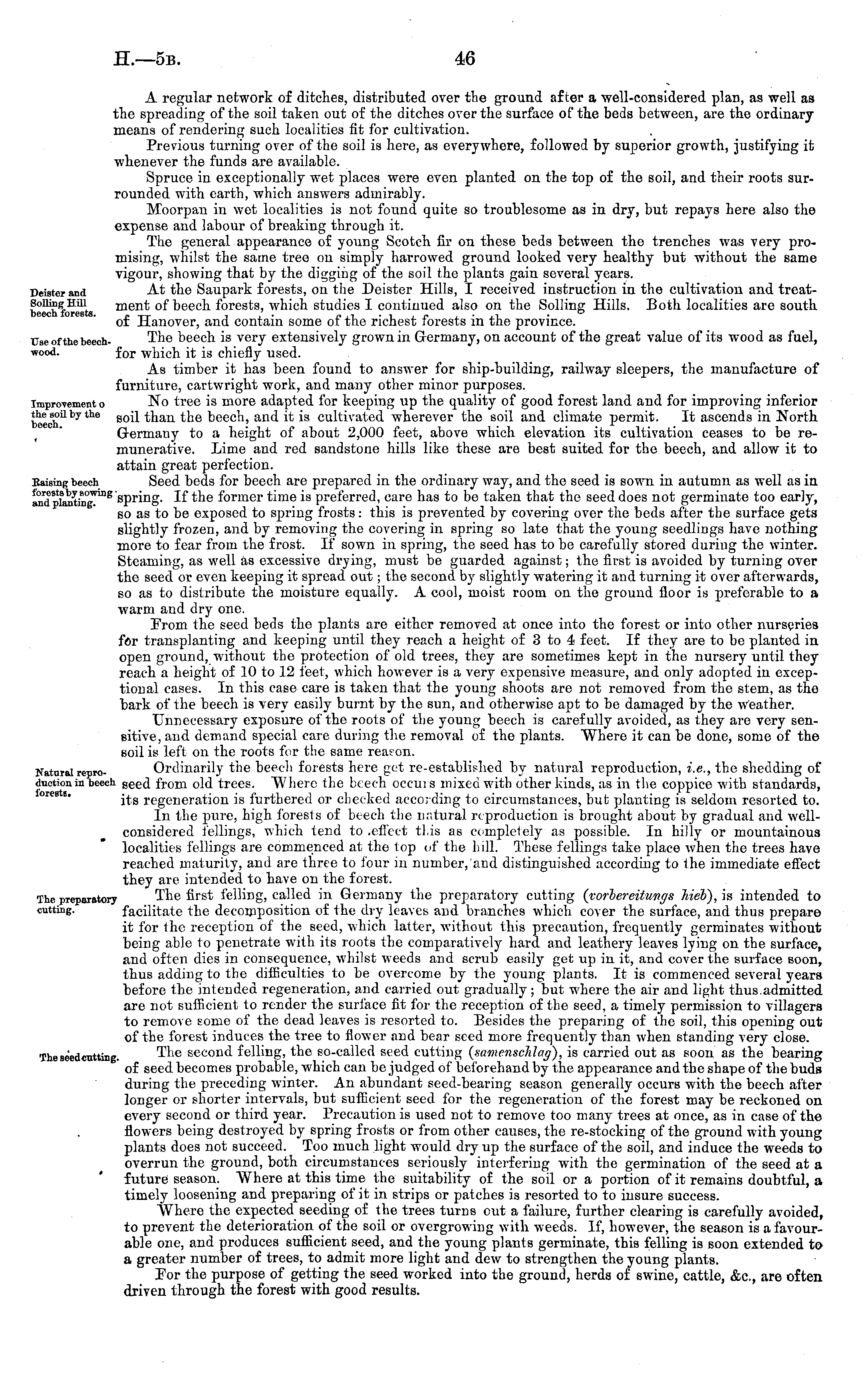 A regular network of ditches, distributed over the ground after a well-considered plan, as well as the spreading of the soil taken out of the ditches over tho surface of the beds between, are the ordinary means of rendering such localities fit for cultivation. Previous turning over of the soil is here, as everywhere, followed by superior growth, justifying it whenever the funds are available. Spruce in exceptionally wet places were even planted on the top of the soil, and their roots surrounded with earth, which answers admirably. Moorpan in wet localities is not found quite so troublesome as in dry, but repays here also the expense and labour of breaking through it. The general appearance of young Scotch fir on these beds between the trenches was very promising, whilst the same tree on simply harrowed ground looked very healthy but without the same vigour, showing that by the digging of the soil the plants gain several years. At the Saupark forests, on the Deister Hills, I received instruction in the cultivation and treatment of beech forests, which studies I continued also on the Soiling Hills. Both localities are south of Hanover, and contain some of the richest forests in the province. The beech is very extensively grown in Germany, on account of the great value of its wood as fuel, for which it is chiefly used. As timber it has been found to answer for ship-building, railway sleepers, the manufacture of furniture, cartwright work, and many other minor purposes. No tree is more adapted for keeping up the quality of good forest land and for improving inferior soil than the beech, and it is cultivated wherever the soil and climate permit. It ascends in North Germany to a height of about 2,000 feet, above which elevation its cultivation ceases to be remunerative. Lime and red sandstone hills like these are best suited for the beech, and allow it to attain great perfection. Seed beds for beech are prepared in the ordinary way, and the seed is sown in autumn as well as in spring. If the former time is preferred, care has to be taken that the seed does not germinate too early, so as to be exposed to spring frosts: this is prevented by covering over the beds after the surface gets slightly frozen, and by removing the covering in spring so late that the young seedlings have nothing more to fear from the frost. If sown in spring, the seed has to be carefully stored during the winter. Steaming, as well as excessive drying, must be guarded against; the first is avoided by turning over the seed or even keeping it spread out; the second by slightly watering it and turning it over afterwards, so as to distribute the moisture equally. A cool, moist room on the ground floor is preferable to a warm and dry one. From the seed beds the plants are either removed at once into the forest or into other nurseries for transplanting and keeping until they reach a height of 3to 4 feet. If they are to be planted in open ground, without the protection of old trees, they are sometimes kept in the nursery until they reach a height of 10 to 12 feet, which however is a very expensive measure, and only adopted in exceptional cases. In this case care is taken that the young shoots are not removed from the stem, as the bark of the beech is very easily burnt by the sun, and otherwise apt to be damaged by the weather. Unnecessary exposure of the roots of the young beech is carefully avoided, as they are very sensitive, and demand special care during the removal of the plants. Where it can be done, some of the soil is left on the roots for the same reason. Ordinarily the beech forests here get re-established by natural reproduction, i.e., the shedding of 1 seed from old trees. Where the beech occurs mixed with other kinds, as in the coppice with standards, its regeneration is furthered or checked according to circumstances, but planting is seldom resorted to. In the pure, high forests of beech the natural reproduction is brought about by gradual and wellconsidered fellings, which tend to .effect this as completely as possible. In hilly or mountainous localities fellings are commenced at the top of the hill. These fellings take place when the trees have reached maturity, and are three to four in number,'and distinguished according to the immediate effect they are intended to have on the forest. j The first felling, called in Germany the preparatory cutting (vorbereitungs hieb), is intended to facilitate the decomposition of the dry leaves and branches which cover the surface, and thus prepare it for tho reception of the seed, which latter, without this precaution, frequently germinates without being able to penetrate with its roots the comparatively hard and leathery leaves lying on the surface, and often dies in consequence, whilst weeds and scrub easily get up in it, and cover the surface soon, thus adding to the difficulties to be overcome by the young plants. It is commenced several years before the intended regeneration, and carried out gradually; but where the air and light thus.admitted are not sufficient to render the surface fit for the reception of the seed, a timely permission to villagers to remove Eome of the dead leaves is resorted to. Besides the preparing of the soil, this opening out of the forest induces the tree to flower and bear seed more frequently than when standing very close. The second felling, the so-called seed cutting (samenschlag), is carried out as soon as the bearing of seed becomes probable, which can be judged of beforehand by the appearance and the shape of the buds during the preceding winter. An abundant seed-bearing season generally occurs with the beech after longer or shorter intervals, but sufficient seed for the regeneration of the forest may be reckoned on every second or third year. Precaution is used not to remove too many trees at once, as in case of tho flowers being destroyed by spring frosts or from other causes, the re-stocking of the ground with young plants does not succe