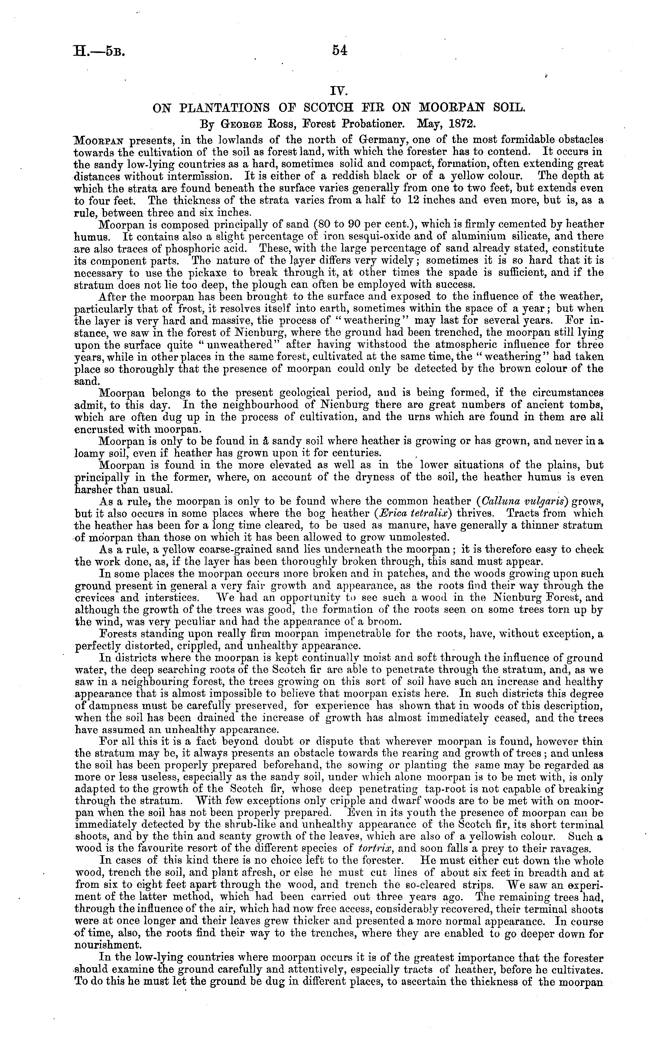 IV. ON PLANTATIONS OF SCOTCH FIR ON MOORPAN SOIL. By George Ross, Forest Probationer. May, 1872. Moorpan presents, in the lowlands of the north of Germany, one of the most formidable obstacles towards the cultivation of the soil as forest land, with which the forester has to contend. It occurs in the sandy low-lying countries as a hard, sometimes solid and compact, formation, often extending great distances without intermission. It is either of a reddish black or of a yellow colour. The depth at which the strata are found beneath the surface varies generally from one to two feet, but extends even to four feet. The thickness of the strata varies from a half to 12 inches and even more, but is, as a rule, between three and six inches. Moorpan is composed principally of sand (80 to 90 per cent.), which is firmly cemented by heather humus. It contains also a slight percentage of iron sesqui-oxide and of aluminium silicate, and there are also traces of phosphoric acid. These, with tho large percentage of sand already stated, constitute its component parts. The nature of the layer differs very widely; sometimes it is so hard that it is necessary to use the pickaxe to break through it, at other times the spade is sufficient, and if the stratum does not lie too deep, the plough can often be employed with success. After the moorpan has been brought to the surface and exposed to the influence of the weather, particularly that of frost, it resolves itself into earth, sometimes within the space of a year; but when the layer is very hard and massive, the process of " weathering" may last for several years. For instance, we saw in the forest of Nienburg, where the ground had been trenched, the moorpan still lying upon the surface quite " unweathered" after having withstood the atmospheric influence for three years, while in other places in the same forest, cultivated at the same time, the "weathering" had taken place so thoroughly that the presence of moorpan could only be detected by the brown colour of the sand. Moorpan belongs to the present geological period, and is being formed, if the circumstances admit, to this day. In the neighbourhood of Nienburg there are great numbers of ancient tombs, which are often dug up in the process of cultivation, and the urns which are found in them are ali encrusted with moorpan. Moorpan is only to be found in a sandy soil where heather is growing or has grown, and never in a loamy soil, even if heather has grown upon it for centuries. Moorpan is found in the more elevated as well as in the lower situations of the plains, but principally in the former, where, on account of the dryness of the soil, the heather humus is even harsher than usual. As a rule, the moorpan is only to be found where the common heather (Calluna vulgaris) grows, but it also occurs in some places where the bog heather (Erica tetralix) thrives. Tracts from which the heather has been for a long time cleared, to be used as manure, have generally a thinner stratum of moorpan than those on which it has been allowed to grow unmolested. As a rule, a yellow coarse-grained sand lies underneath the moorpan; it is therefore easy to check the work done, as, if the layer has been thoroughly broken through, this sand must appear. In some places the moorpan occurs more broken and in patches, and the woods growing upon such ground present in general a very fair growth and appearance, as the roots find their way through the crevices and interstices. We had an opportunity to see such a wood in the Nienburg Forest, and although the growth of the trees was good, the formation of the roots seen on some trees torn up by the wind, was very peculiar and had the appearance of a broom. Forests standing upon really firm moorpan impenetrable for the roots, have, without exception, a perfectly distorted, crippled, and unhealthy appearance. In districts where the moorpan is kept continually moist and soft through the influence of ground water, the deep searching roots of the Scotch fir are able to penetrate through tho stratum, and, as we saw in a neighbouring forest, the trees growing on this sort of soil have such an increase and healthy appearance that is almost impossible to believe that moorpan exists here. In such districts this degree of dampness must be carefully preserved, for experience has shown that in woods of this description, when the soil has been drained the increase of growth has almost immediately ceased, and the trees have assumed an unhealthy appearance. For all this it is a fact beyond doubt or dispute that wherever moorpan is found, however thin the stratum may be, it always presents an obstacle towards the rearing and growth of trees ; and unless the soil has been properly prepared beforehand, the sowing or planting the same may be regarded as more or less useless, especially as the sandy soil, under which alone moorpan is to be met with, is only adapted to the growth of the Scotch fir, whose deep penetrating tap-root is not capable of breaking through the stratum. With few exceptions only cripple and dwarf woods are to be met with on moorpan when the soil has not been properly prepared. Even in its youth the presence of moorpan can be immediately detected by the shrub-like and unhealthy appearance of the Scotch fir, its short terminal shoots, and by the thin and scanty growth of the leaves, which are also of a yellowish colour. Such a wood is the favourite resort of the different species of tortrix, and soon falls a prey to their ravages. In eases of this kind there is no choice left to the forester. He must either cut down the whole wood, trench the soil, and plant afresh, or else he must cut lines of about six feet in breadth and at from six to eight feet apart through the wood, and trench the so-cleared strips. We saw an experiment of the latter method, which had been carried out three years ago. The remaining trees had, through the influence of the air, which had now free access, considerably 