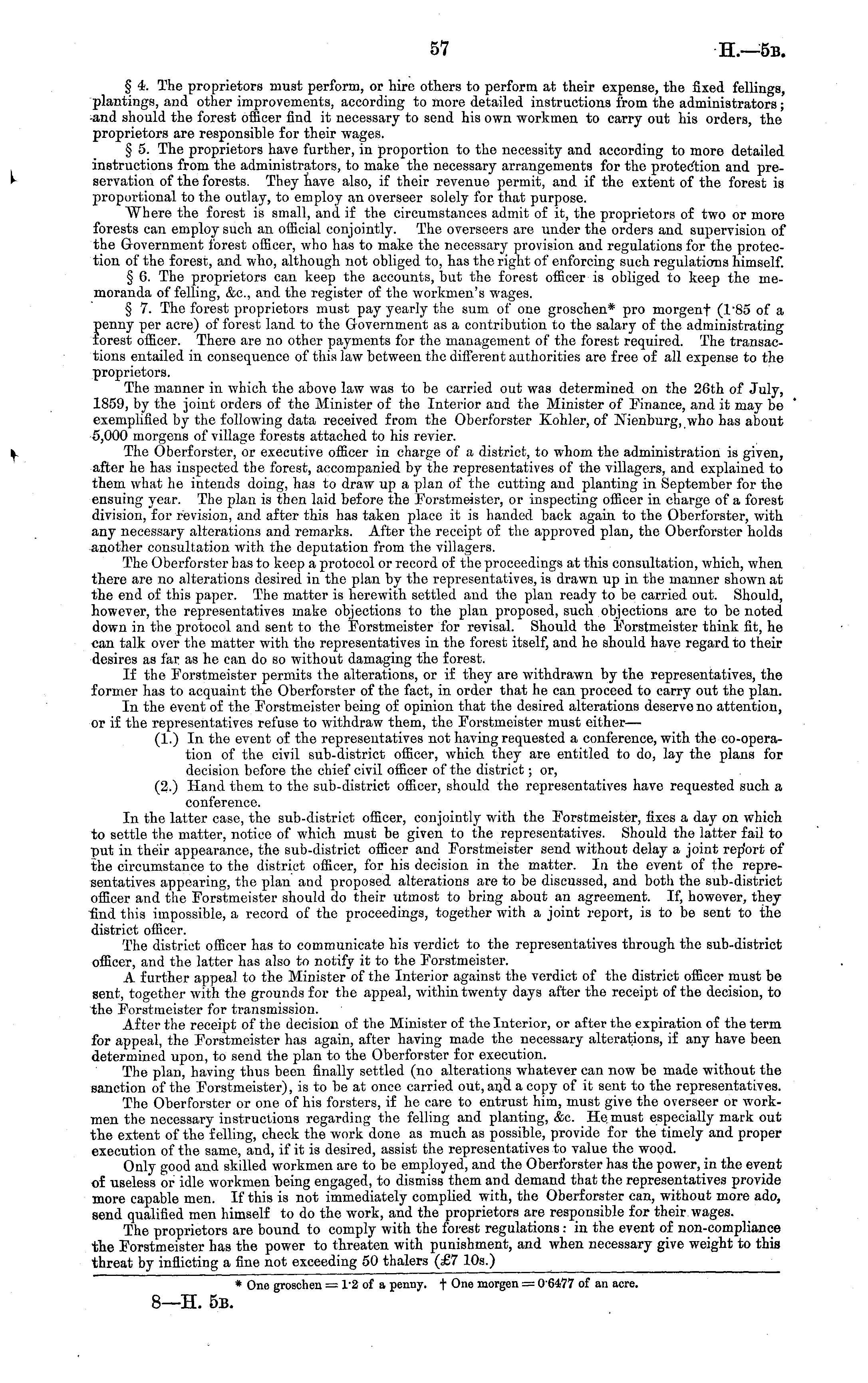 § 4. The proprietors must perform, or hire others to perform at their expense, the fixed fellings, plantings, and other improvements, according to more detailed instructions from the administrators; -and should the forest officer find it necessary to send his own workmen to carry out his orders, the proprietors are responsible for their wages. § 5. The proprietors have further, in proportion to the necessity and according to more detailed instructions from the administrators, to make the necessary arrangements for the protection and preservation of the forests. They have also, if their revenue permit, and if the extent of the forest is proportional to the outlay, to employ an overseer solely for that purpose. Where the forest is small, and if the circumstances admit of it, the proprietors of two or more forests can employ such an official conjointly. The overseers are under the orders and supervision of the Government forest officer, who has to make the necessary provision and regulations for the protection of the forest, and who, although not obliged to, has the right of enforcing such regulations himself. § 6. The proprietors can keep the accounts, but the forest officer is obliged to keep the memoranda of felling, &c, and the register of the workmen's wages. § 7. The forest proprietors must pay yearly the sum of one groschen* pro morgenf (1"85 of a penny per acre) of forest land to the Government as a contribution to the salary of the administrating forest officer. There are no other payments for the management of the forest required. The transactions entailed in consequence of this law between the different authorities are free of all expense to the proprietors. The manner in which the above law was to be carried out was determined on the 26th of July, 1859, by the joint orders of the Minister of the Interior and the Minister of Finance, and it may be exemplified by the following data received from the Oberforster Kohler, of Nienburg, who has about 5,000 morgens of village forests attached to his revier. The Oberforster, or executive officer in charge of a district, to whom the administration is given, after he has inspected the forest, accompanied by the representatives of the villagers, and explained to them what he intends doing, has to draw up a plan of the cutting and planting in September for the ensuing year. The plan is then laid before the Forstmeister, or inspecting officer in charge of a forest division, for revision, and after this has taken place it is handed back again to the Oberforster, with any necessary alterations and remarks. After the receipt of the approved plan, the Oberforster holds another consultation with the deputation from the villagers. The Oberforster has to keep a protocol or record of the proceedings at this consultation, which, when there are no alterations desired in the plan by the representatives, is drawn up in the manner shown at the end of this paper. The matter is herewith settled and the plan ready to be carried out. Should, however, the representatives make objections to the plan proposed, such objections are to be noted down in the protocol and sent to the Forstmeister for revisal. Should the Forstmeister think fit, he can talk over the matter with tho representatives in the forest itself, and he should have regard to their desires as far as he can do so without damaging the forest. If the Forstmeister permits the alterations, or if they are withdrawn by the representatives, the former has to acquaint the Oberforster of the fact, in order that he can proceed to carry out the plan. In the event of the Forstmeister being of opinion that the desired alterations deserve no attention, or if the representatives refuse to withdraw them, the Forstmeister must either— (1.) In the event of the representatives not having requested a conference, with the co-opera-tion of the civil sub-district officer, which they are entitled to do, lay the plans for decision before the chief civil officer of the district; or, (2.) Hand them to the sub-district officer, should the representatives have requested such a conference. In the latter case, the sub-district officer, conjointly with the Forstmeister, fixes a day on which to settle the matter, notice of which must be given to the representatives. Should the latter fail to put in their appearance, the sub-district officer and Forstmeister send without delay a joint report of the circumstance to the district officer, for his decision in the matter. In the event of the representatives appearing, the plan and proposed alterations are to be discussed, and both the sub-district officer and the Forstmeister should do their utmost to bring about an agreement. If, however, they find this impossible, a record of the proceedings, together with a joint report, is to be sent to the district officer. The district officer has to communicate his verdict to the representatives through the sub-district officer, and the latter has also to notify it to the Forstmeister. A further appeal to the Minister of the Interior against the verdict of the district officer must be sent, together with the grounds for the appeal, within twenty days after the receipt of the decision, to the Forstmeister for transmission. After the receipt of the decision of the Minister of the Interior, or after the expiration of the term for appeal, the Forstmeister has again, after having made the necessary alterations, if any have been determined upon, to send the plan to the Oberforster for execution. The plan, having thus been finally settled (no alterations whatever can now be made without the sanction of the Forstmeister), is to be at once carried out, and a copy of it sent to the representatives. The Oberforster or one of his forsters, if he care to entrust him, must give the overseer or workmen the necessary instructions regarding the felling and planting, &c. He must especially mark out the extent of the felling, check the work done as much as pos