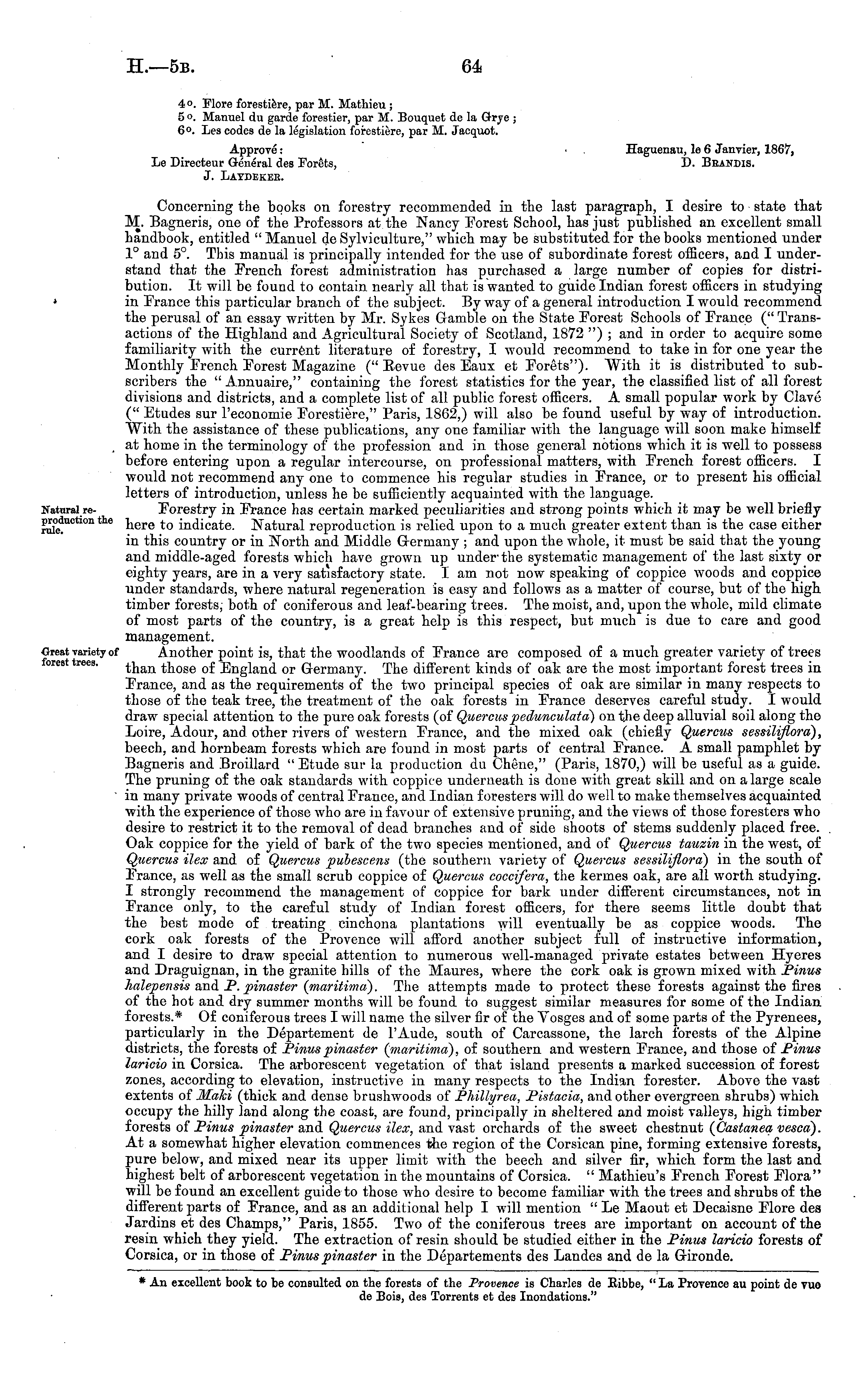 40. Elore forestiere, par M. Matliieu ; 50. Manuel du garde forestier, par M. Bouquet de la Grye ; 6°. Les codes de la legislation forestiere, par M. Jaequot. Approve: i . Haguenau, le 6 Janvier, 1867, Le Direeteur General des Forets, D. Beandis. J. Laydekee. Concerning the books on forestry recommended in the last paragraph, I desire to state that M. Bagneris, one of the Professors at the Nancy Forest School, has just published an excellent small handbook, entitled " Manuel de Sylviculture," which may be substituted for the books mentioned under 1° and s°. This manual is principally intended for the use of subordinate forest officers, and I understand that the French forest administration has purchased a large number of copies for distribution. It will be found to contain nearly all that is wanted to guide Indian forest officers in studying in France this particular branch of the subject. By way of a general introduction I would recommend the perusal of an essay written by Mr. Sykes Gamble on the State Forest Schools of France (" Transactions of the Highland and Agricultural Society of Scotland, 1872 ") ; and in order to acquire some familiarity with the current literature of forestry, I would recommend to take in for one year the Monthly French Forest Magazine (" Revue des Eaux et Forets"). With it is distributed to subscribers the "Annuaire," containing the forest statistics for the year, the classified list of all forest divisions and districts, and a complete list of all public forest officers. A small popular work by Clave (" Etudes sur l'economie Forestiere," Paris, 1862,) will also be found useful by way of introduction. With the assistance of these publications, any one familiar with the language will soon make himself at home in the terminology of the profession and in those general notions which it is well to possess before entering upon a regular intercourse, on professional matters, with French forest officers. I would not recommend any one to commence his regular studies in France, or to present his official letters of introduction, unless he be sufficiently acquainted with the language. Forestry in France has certain marked peculiarities and strong points which it may be well briefly here to indicate. Natural reproduction is relied upon to a much greater extent than is the case either in this country or in North and Middle Germany ; and upon the whole, it must be said that the young and middle-aged forests which have grown up under the systematic management of the last sixty or eighty years, are in a very satisfactory state. I am not now speaking of coppice woods and coppice under standards, where natural regeneration is easy and follows as a matter of course, but of the high timber forests, both of coniferous and leaf-bearing trees. The moist, and, upon the whole, mild climate of most parts of the country, is a great help is this respect, but much is due to care and good management. Another point is, that the woodlands of France are composed of a much greater variety of trees than those of England or Germany. The different kinds of oak are the most important forest trees in France, and as the requirements of the two principal species of oak are similar in many respects to those of the teak tree, the treatment of the oak forests in France deserves careful study. I would draw special attention to the pure oak forests (of Quercuspedunculata) on the deep alluvial soil along the Loire, Adour, and other rivers of western France, and the mixed oak (chiefly Quercus sessiliflora) , beech, and hornbeam forests which are found in most parts of central France. A small pamphlet by Bagneris and Broillard " Etude sur la production du Chene," (Paris, 1870,) will be useful as a guide. The pruning of the oak standards with coppice underneath is done with great skill and on a large scale in many private woods of central France, and Indian foresters will do well to make themselves acquainted with the experience of those who are in favour of extensive pruning, and the views of those foresters who desire to restrict it to the removal of dead branches and of side shoots of stems suddenly placed free. Oak coppice for the yield of bark of the two species mentioned, and of Quercus tauzin in the w rest, of Quercus ilex and of Quercus pubescens (the southern variety of Quercus sessiliflora) in the south of France, as well as the small scrub coppice of Quercus coccifera, the kermes oak, are all worth studying. I strongly recommend the management of coppice for bark under different circumstances, not in France only, to the careful study of Indian forest officers, for there seems little doubt that the best mode of treating cinchona plantations will eventually be as coppice woods. The cork oak forests of the Provence will afford another subject full of instructive information, and I desire to draw special attention to numerous well-managed private estates between Hyeres and Draguignan, in the granite hills of the Maures, where the cork oak is grown mixed with Pinus halepensis and P. pinaster (maritima). The attempts made to protect these forests against the fires of the hot and dry summer months will be found to suggest similar measures for some of the Indian forests.* Of coniferous trees I will name the silver fir of the Vosges and of some parts of the Pyrenees, particularly in the Departement de l'Aude, south of Carcassone, tho larch forests of the Alpine districts, the forests of Pinus pinaster (maritima), of southern and western France, and those of Pinus laricio in Corsica. The arborescent vegetation of that island presents a marked succession of forest zones, according to elevation, instructive in many respects to the Indian forester. Above the vast extents of Maki (thick and dense brushwoods of Phillyrea, Pistacia, and other evergreen shrubs) which occupy the hilly land along the coast, are found, principally in sheltered and moist valleys, high timber forests of Pinus pinaster and Quercus ile