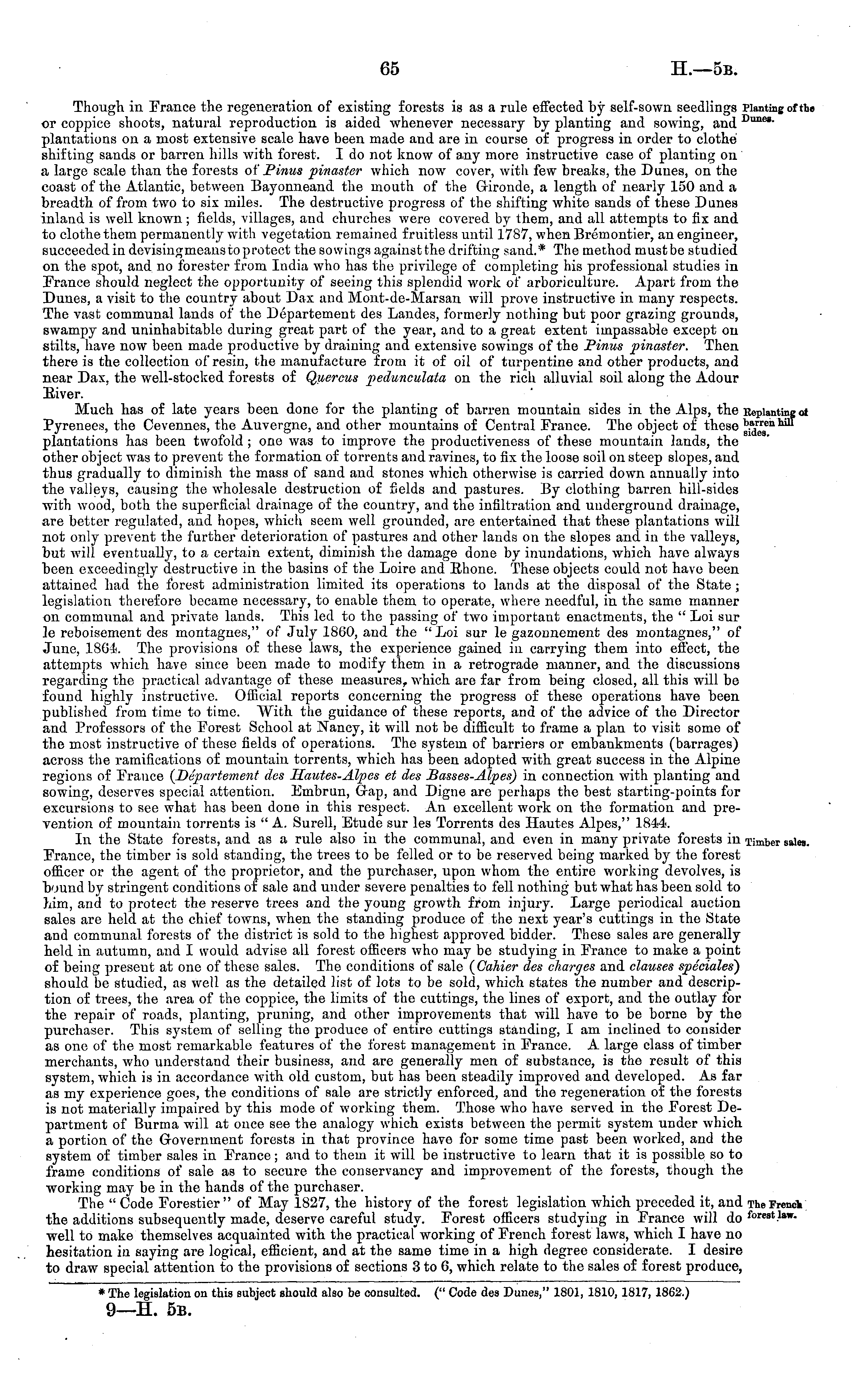 Though in France the regeneration of existing forests is as a rule effected by self-sown seedlings : or coppice shoots, natural reproduction is aided whenever necessary by planting and sowing, and ] plantations on a most extensive scale have been made and are in course of progress in order to clothe shifting sands or barren hills with forest. Ido not know of any more instructive case of planting on a large scale than the forests of Pinus pinaster which now cover, with few breaks, the Duues, on the coast of the Atlantic, between Bayonneand the mouth of the Gironde, a length of nearly 150 and a breadth of from two to six miles. The destructive progress of the shifting white sands of these Dunes inland is well known; fields, villages, and churches were covered by them, and all attempts to fix and to clothe them permanently with vegetation remained fruitless until 1787, when Bremontier, an engineer, succeeded in devisingmeans to protect the sowings against the drifting sand.* The method must be studied on the spot, and no forester from India who has the privilege of completing his professional studies in France should neglect the opportunity of seeing this splendid work of arboriculture. Apart from the Duues, a visit to the country about Dax and Mont-de-Marsan will prove instructive in many respects. The vast communal lands of the Departement des Landes, formerly nothing but poor grazing grounds, swampy aud uninhabitable during great part of the year, and to a great extent impassable except on stilts, have now been made productive by draining and extensive sowings of the Pinus pinaster. Then there is the collection of resin, the manufacture from it of oil of turpentine and other products, and near Dax. the well-stocked forests of Quercus pedunculata on the rich alluvial soil along the Adour River. Much has of late years been done for the planting of barren mountain sides in the Alps, the Pyrenees, the Cevennes, the Auvergne, and other mountains of Central France. The object of these plantations has been twofold ; one was to improve the productiveness of these mountain lands, the other object was to prevent the formation of torrents and ravines, to fix the loose soil on steep slopes, and thus gradually to diminish the mass of sand and stones which otherwise is carried down annually into the valleys, causing the wholesale destruction of fields and pastures. By clothing barren hill-sides with wood, both the superficial drainage of the country, and the infiltration and underground drainage, are better regulated, and hopes, which seem well grounded, are entertained that these plantations will not only prevent the further deterioration of pastures and other lands on the slopes and in the valleys, but will eventually, to a certain extent, diminish the damage done by inundations, which have always been exceedingly destructive in the basins of the Loire and Rhone. These objects could not have been attained had the forest administration limited its operations to lands at the disposal of the State; legislation therefore became necessary, to enable them to operate, where needful, in the same manner on communal and private lands. This led to the passing of two important enactments, the " Loi sur le reboisement des montagnes," of July 1860, and the " Loi sur le gazonnement des montagnes," of June, 1801. The provisions of these laws, the experience gained in carrying them into effect, the attempts which have since been made to modify them in a retrograde manner, and the discussions regarding the practical advantage of these measures, which are far from being closed, all this will be found highly instructive. Official reports concerning the progress of these operations have been published from time to time. With the guidance of these reports, and of the advice of the Director and Professors of the Forest School at Nancy, it will not be difficult to frame a plan to visit some of the most instructive of these fields of operations. The system of barriers or embankments (barrages) across the ramifications of mountain torrents, which has been adopted with great success in the Alpine regions of France (Departement des Hautes-Alpes et des Basses-Alpes) in connection with planting and sowing, deserves special attention. Embrun, Gap, and Digne are perhaps the best starting-points for excursions to see what has been done in this respect. An excellent work on the formation and prevention of mountain torrents is " A. Surell, Etude sur les Torrents des Hautes Alpes," 1844. Iu the State forests, and as a rule also in the communal, and even in many private forests in France, the timber is sold standing, the trees to be felled or to be reserved being marked by the forest officer or the agent of the proprietor, and the purchaser, upon whom the entire working devolves, is bound by stringent conditions of sale and under severe penalties to fell nothing but what has been sold to him, and to protect the reserve trees and the young growth from injury. Large periodical auction sales are held at the chief towns, when the standing produce of the next year's cuttings in the State and communal forests of the district is sold to the highest approved bidder. These sales are generally held in autumn, and I would advise all forest officers who may be studying in France to make a point of being present at one of these sales. The conditions of sale (Cahier des charges and clauses speciales) should be studied, as well as the detailed list of lots to be sold, which states the number and description of trees, the area of the coppice, the limits of the cuttings, the lines of export, and the outlay for the repair of roads, planting, pruning, and other improvements that will have to be borne by the purchaser. This system of selling tho produce of entire cuttings standing, lam inclined to consider as one of the most remarkable features of the forest management in France. A. large class of timber merchants, who understand their business, and are g