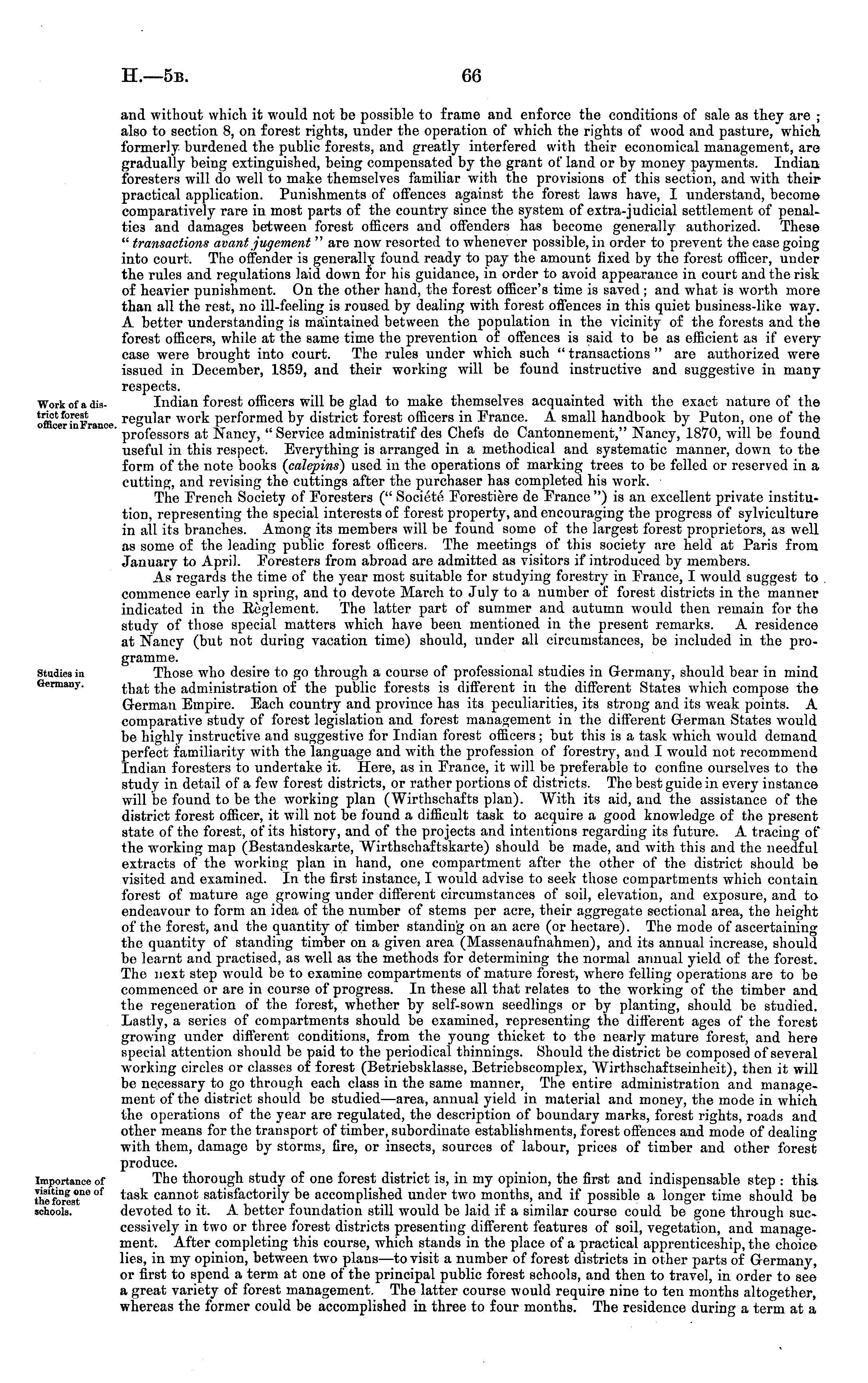 and without which it would not be possible to frame and enforce the conditions of sale as they are ; also to section 8, on forest rights, under the operation of which the rights of wood and pasture, which formerly burdened the public forests, and greatly interfered with their economical management, are gradually being extinguished, being compensated by the grant of land or by money payments. Indian foresters will do well to make themselves familiar with the provisions of this section, and with their practical application. Punishments of offences against the forest laws have, I understand, become comparatively rare in most parts of the country since the system of extra-judicial settlement of penalties and damages between forest officers and offenders has become generally authorized. These " transactions avant jugement " are now resorted to whenever possible, in order to prevent the case going into court. The offender is generally found ready to pay the amount fixed by the forest officer, under the rules and regulations laid down for his guidance, in order to avoid appearance in court and the risk of heavier punishment. On the other hand, the forest officer's time is saved ; and what is worth more than all the rest, no ill-feeling is roused by dealing with forest offences in this quiet business-like way. A better understanding is maintained between the population in the vicinity of the forests and the forest officers, while at the same time the prevention of offences is said to be as efficient as if every case were brought into court. The rules under which such " transactions " are authorized were issued in December, 1859, and their working will be found instructive and suggestive in many respects. Indian forest officers will be glad to make themselves acquainted with the exact nature of the regular work performed by district forest officers in France. A small handbook by Puton, one of the professors at Nancy, "Service administratif des Chefs de Cantonnement," Nancy, 1870, will be found useful in this respect. Everything is arranged in a methodical and systematic manner, down to the form of the note books (calepins) used in the operations of marking trees to be felled or reserved in a cutting, and revising the cuttings after the purchaser has completed his work. The French Society of Foresters (" Societe Forestiere de France ") is an excellent private institution, representing the special interests of forest property, and encouraging the progress of sylviculture in all its branches. Among its members will be found some of the largest forest proprietors, as well as some of the leading public forest officers. The meetings of this society are held at Paris from January to April. Foresters from abroad are admitted as visitors if introduced by members. As" regards the time of the year most suitable for studying forestry in France, I would suggest to commence early in spring, and to devote March to July to a number of forest districts in the manner indicated in the Reglement. The latter part of summer and autumn would then remain for the study of those special matters which have been mentioned in the present remarks. A residence at Nancy (but not during vacation time) should, under all circumstances, be included in the programme. Those who desire to go through a course of professional studies in Germany, should bear in mind that the administration of the public forests is different in the different States which compose the German Empire. Each country and province has its peculiarities, its strong and its weak points. A comparative study of forest legislation and forest management in the different German States would be highly instructive and suggestive for Indian forest officers ; but this is a task which would demand perfect familiarity with the language and with the profession of forestry, and I would not recommend Indian foresters to undertake it. Here, as in France, it will be preferable to confine ourselves to the study in detail of a few forest districts, or rather portions of districts. The best guide in every instance will be found to be the working plan (Wirthschafts plan). With its aid, and the assistance of the district forest officer, it will not be found a difficult task to acquire a good knowledge of the present state of the forest, of its history, and of the projects and intentions regarding its future. A tracing of the working map (Bestandeskarte, Wirthschaftskarte) should be made, and with this and the needful extracts of the working plan in hand, one compartment after the other of the district should be visited and examined. In the first instance, I would advise to seek those compartments which contain forest of mature age growing under different circumstances of soil, elevation, and exposure, and to endeavour to form an idea of the number of stems per acre, their aggregate sectional area, the height of the forest, and the quantity of timber standing on an acre (or hectare). The mode of ascertaining the quantity of standing timber on a given area (Massenaufnahmen), and its annual increase, should be learnt and practised, as well as the methods for determining the normal annual yield of the forest. The next step would bo to examine compartments of mature forest, where felling operations are to be commenced or are in course of progress. In these all that relates to the working of the timber and the regeneration of the forest, whether by self-sown seedlings or by planting, should be studied. Lastly, a series of compartments should be examined, representing the different ages of the forest growing under different conditions, from the young thicket to the nearly mature forest, and here special attention should be paid to the periodical thinnings. Should the district be composed of several working circles or classes of forest (Betriebsklasse, Betriebscomplex, Wirthschaftseinheit), then it will be necessary to go through each class in the same manner, The entire administration and man