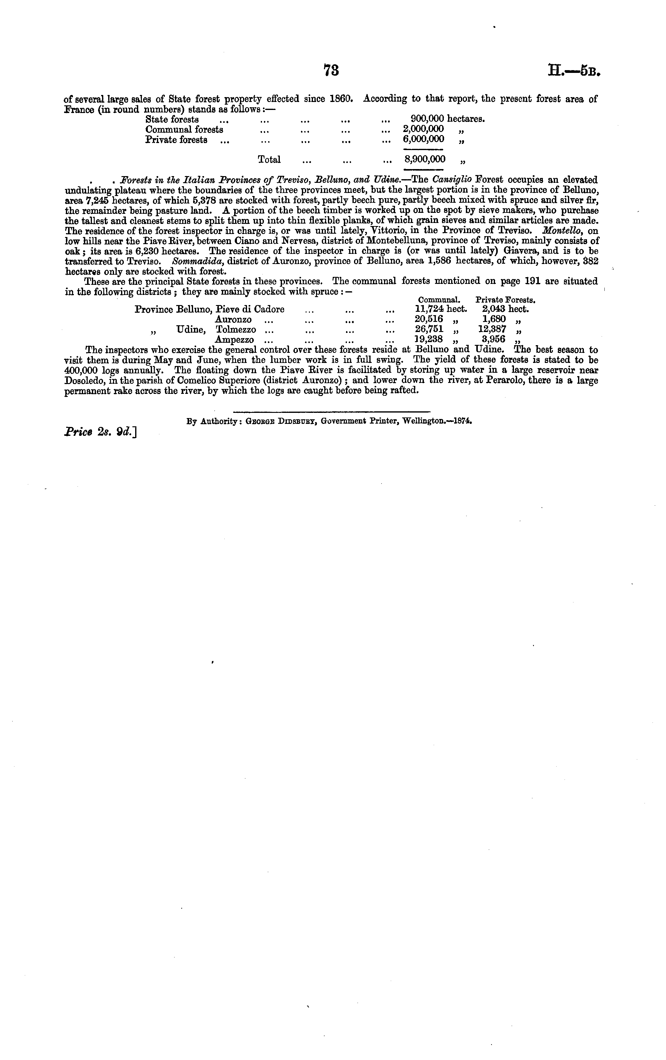 of several large sales of State forest property effected since 1860. According to that report, the present forest area of France (in round numbers) stands as follows: — State forests ... ... ... ... ... 900,000 hectares. Communal forests ... ... ... ... 2,000,000 „ Private forests 6,000,000 „ Total ... ... ... 8,900,000 „ . Forests in the Italian Provinces of Treviso, Belluno, and Udine. —The Cansiglio Forest occupies an elevated undulating plateau where the boundaries of the three provinces meet, but the largest portion is in the province of Belluno, area 7,246 hectares, of which 5,378 are stocked with forest, partly beech pure, partly beech mixed with spruce and silver fir, the remainder being pasture land. A portion of the beech timber is worked up on the spot by sieve makers, who purchase the tallest and cleanest stems to split them up into thin flexible planks, of which grain sieves and similar articles are made. The residence of the forest inspector in charge is, or was until lately, Vittorio, in the Province of Treviso. Montello, on low hills near the Piave River, between Ciano and Nervesa, district of Montebelluna, province of Treviso, mainly consists of oak; its area is 6,230 hectares. The residence of the inspector in charge is (or was until lately) Giavera, and is to be transferred to Treviso. Sommadida, district of Auronzo, province of Belluno, area 1,586 hectares, of which, however, 382 hectares only are stocked with forest. These are the principal State forests in these provinces. The communal forests mentioned on page 191 are situated in the following districts ; they are mainly stocked with spruce : — Commnnal. Private Forests. Province Belluno, Pieve di Cadore ... ... ... 11,724 hect. 2,043 hect. Auronzo ... ... ... ... 20,516 „ 1,680 „ „ Udine, Tolmezzo ... ... ... ... 26,751 „ 12,387 „ Ampezzo ... ... ... ... 19,238 „ 3,956 „ The inspectors who exercise the general control over these forests reside at Belluno and Udine. The best season to visit them is during May and June, when the lumber work is in full swing. The yield of these forests is stated to be 400,000 logs annually. The floating down the Piave River is facilitated by storing up water in a large reservoir near Dosoledo, in the parish of Comelico Superiore (district Auronzo); and lower down the river, at Perarolo, there is a large permanent rake across the river, by which the logs are caught before being rafted. By Authority: Gbobge Didsbuby, Government Printer, Wellington.—lB74. Price 2s. 9d_