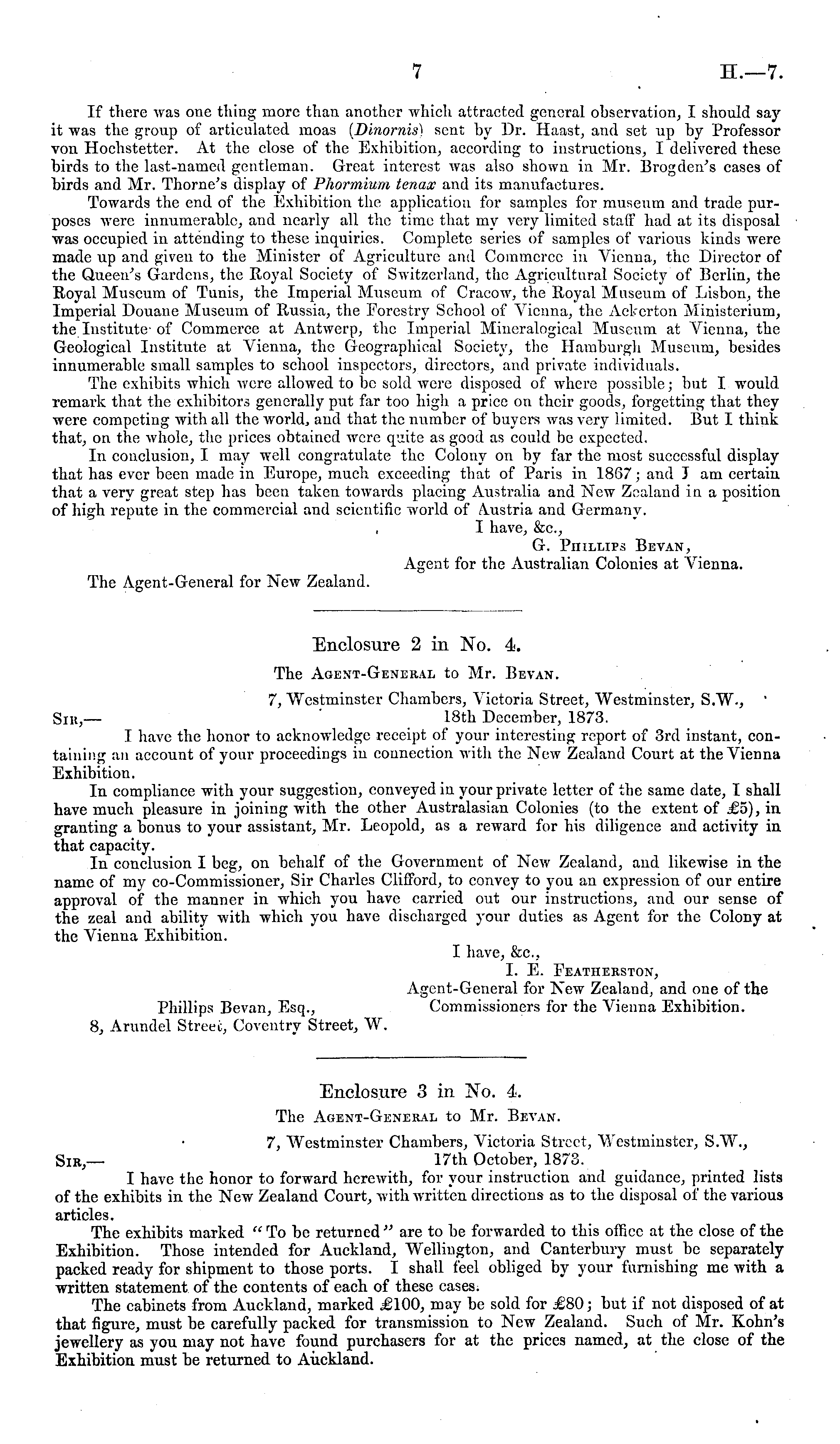 Enclosure 2 in No. 4. The Agent-General to Mr. Bevan. 7, Westminster Chambers, Victoria Street, Westminster, S.W., ' Sir,— 18th December, 1873. I have the honor to acknowledge receipt of your interesting report of 3rd instant, containing an account of your proceedings iv connection with the New Zealand Court at the Vienna Exhibition. In compliance with your suggestion, conveyed iv your private letter of the same date, I shall have much pleasure in joining with the other Australasian Colonies (to the extent of £o), in granting a bonus to your assistant, Mr. Leopold, as a reward for his diligence and activity in that capacity. In conclusion I beg, on behalf of the Government of New Zealand, and likewise in the name of my co-Commissioner, Sir Charles Clifford, to convey to you an expression of our entire approval of the manner in which you have carried out our instructions, and our sense of the zeal and ability with which you have discharged your duties as Agent for the Colony at the Vienna Exhibition. I have, &c, I. E. Featherston, Agent-General for New Zealand, and one of the Phillips Bevan, Esq., Commissioners for the Vienna Exhibition. 8, Arundel Street, Coventry Street, W.