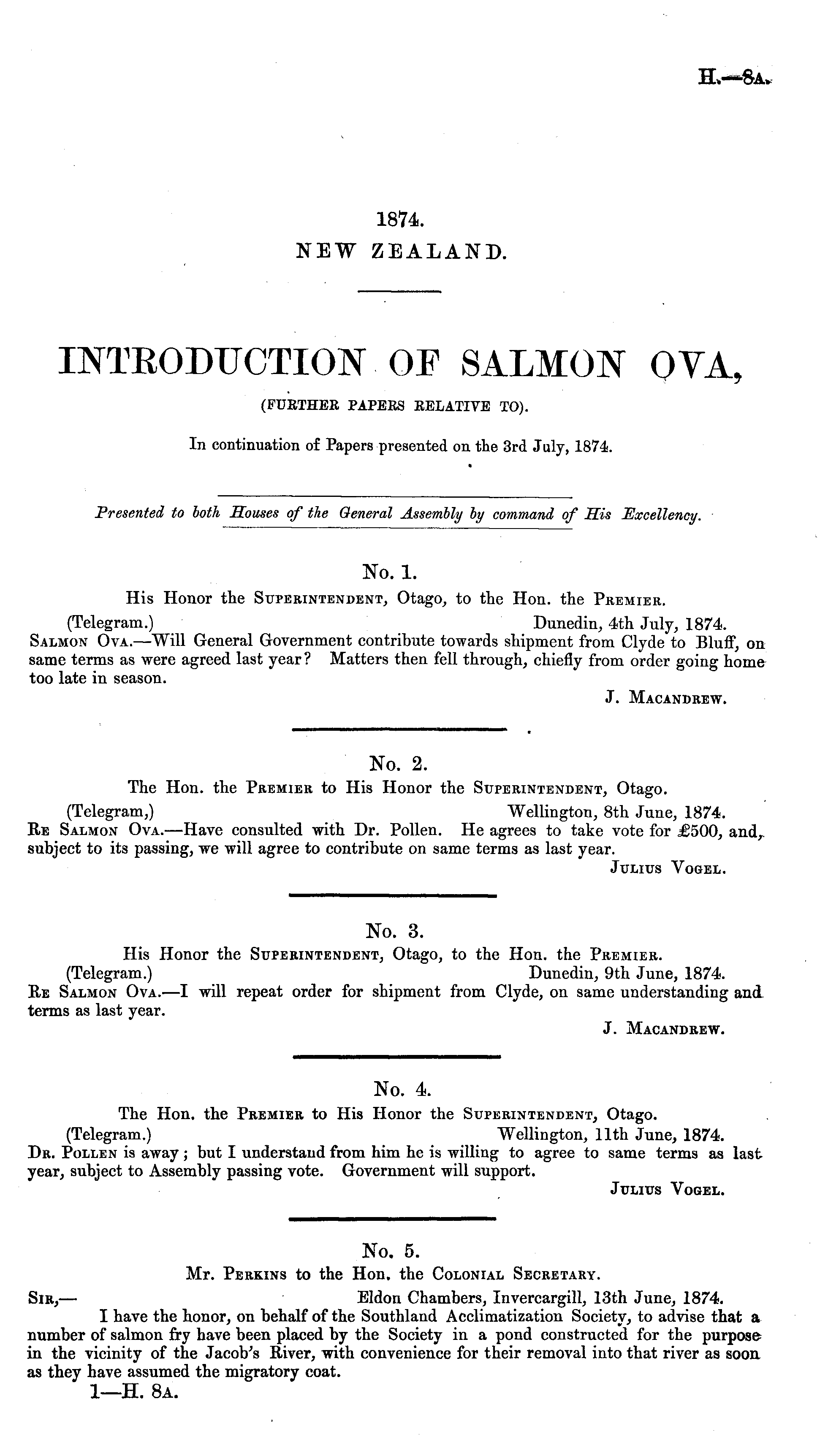 No. 1. His Honor the Superintendent, Otago, to the Hon. the Premier. (Telegram.) Dunedin, 4th July, 1874. Salmon Ova. —Will General Government contribute towards shipment from Clyde to Bluff, on same terms as were agreed last year ? Matters then fell through, chiefly from order going home too late in season. J. Macandrew.