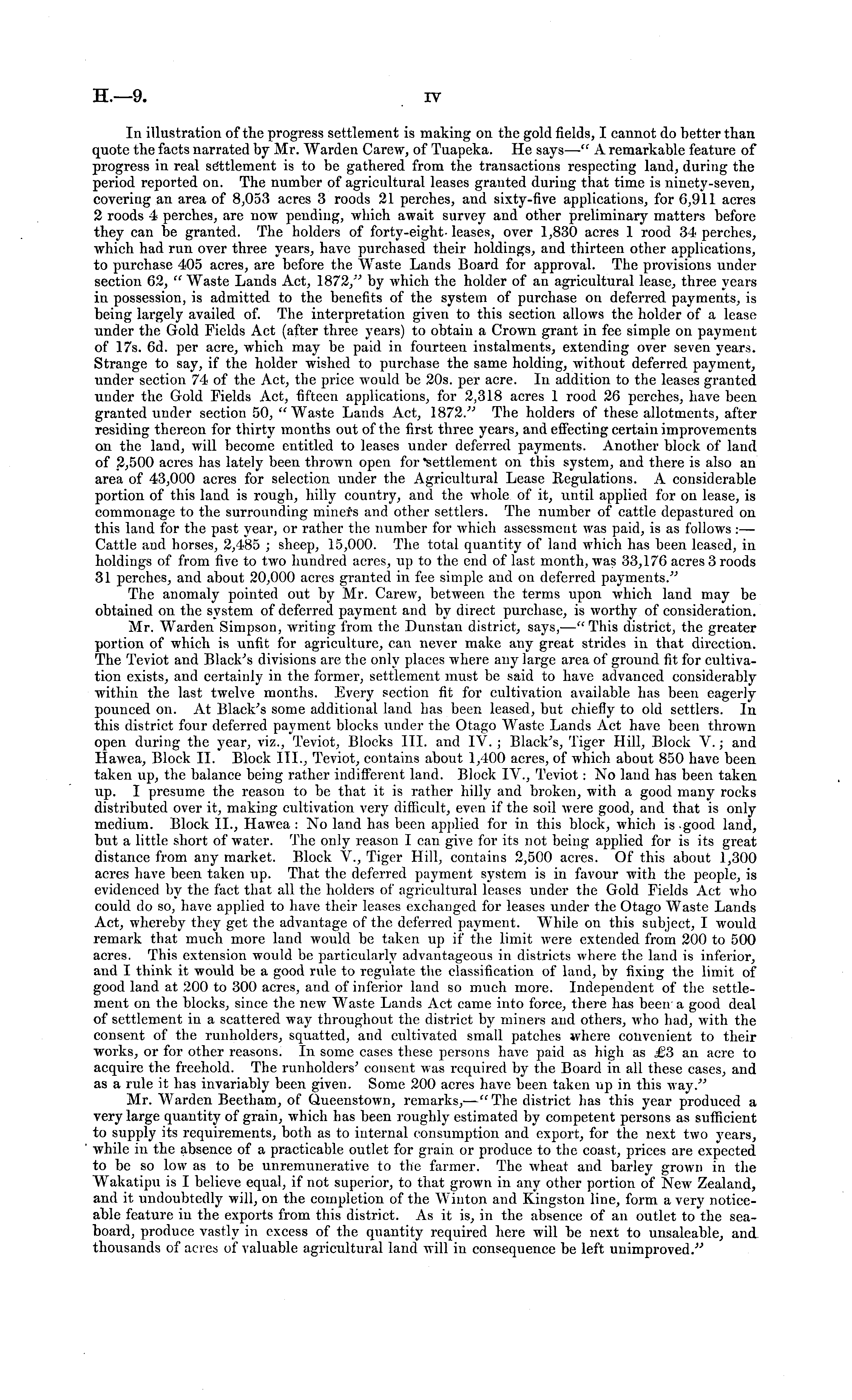 In illustration of the progress settlement is making on the gold fields, I cannot do better than quote the facts narrated by Mr. Warden Carew, of Tuapeka. He says —" A remarkable feature of progress in real settlement is to be gathered from the transactions respecting land, during the period reported on. The number of agricultural leases granted during that time is ninety-seven, covering an area of 8,053 acres 3 roods 21 perches, and sixty-five applications, for 6,911 acres 2 roods 4 perches, are now pending, which await survey and other preliminary matters before they can be granted. The holders of forty-eight- leases, over 1,830 acres 1 rood 34 perches, which had run over three years, have purchased their holdings, and thirteen other applications, to purchase 405 acres, are before the Waste Lands Board for approval. The provisions under section 62, " Waste Lands Act, 1872," by which the holder of an agricultural lease, three years in possession, is admitted to the benefits of the system of purchase on deferred payments, is being largely availed of. The interpretation given to this section allows the holder of a lease under the Gold Fields Act (after three years) to obtain a Crown grant in fee simple on payment of 17s. 6d. per acre, which may be paid in fourteen instalments, extending over seven years. Strange to say, if the holder wished to purchase the same holding, without deferred payment, under section 74 of the Act, the price would be 20s. per acre. In addition to the leases granted under the Gold Fields Act, fifteen applications, for 2,318 acres 1 rood 26 perches, have been granted under section 50, "Waste Lands Act, 1872." The holders of these allotments, after residing thereon for thirty months out of the first three years, and effecting certain improvements on the land, will become entitled to leases under deferred payments. Another block of land of 2,500 acres has lately been thrown open for "settlement on this system, and there is also an area of 43,000 acres for selection under the Agricultural Lease Regulations. A considerable portion of this land is rough, hilly country, and the whole of it, until applied for on lease, is commonage to the surrounding miners and other settlers. The number of cattle depastured on this land for the past year, or rather the number for which assessment was paid, is as follows : —■ Cattle and horses, 2,485 ; sheep, 15,000. The total quantity of land which has been leased, in holdings of from five to two hundred acres, up to the end of last month, was 33,176 acres 3 roods 31 perches, and about 20,000 acres granted in fee simple and on deferred payments." The anomaly pointed out by Mr. Carew, between the terms upon which land may be obtained on the system of deferred payment and by direct purchase, is worthy of consideration. Mr. Warden Simpson, writing from the Dunstan district, says, —"This district, the greater portion of which is unfit for agriculture, can never make any great strides in that direction. The Teviot and Black's divisions are the only places where any large area of ground fit for cultivation exists, and certainly in the former, settlement must be said to have advanced considerably within the last twelve months. Every section fit for cultivation available has been eagerly pounced on. At Black's some additional land has been leased, but chiefly to old settlers. In this district four deferred payment blocks under the Otago Waste Lands Act have been thrown open during the year, viz., Teviot, Blocks 111. and IV. ; Black's, Tiger Hill, Block V.; and Hawea, Block 11. Block 111., Teviot, contains about 1,400 acres, of which about 850 have been taken up, the balance being rather indifferent land. Block IV., Teviot: No land has been taken up. I presume the reason to be that it is rather hilly and broken, with a good many rocks distributed over it, making cultivation very difficult, even if the soil were good, and that is only medium. Block 11., Hawea :No land has been applied for in this block, which is good land, but a little short of water. The only reason I can give for its not being applied for is its great distance from any market. Block V., Tiger Hill, contains 2,500 acres. Of this about 1,300 acres have been taken up. That the deferred payment system is in favour with the people, is evidenced by the fact that all the holders of agricultural leases under the Gold Fields Act who could do so, have applied to have their leases exchanged for leases under the Otago Waste Lands Act, whereby they get the advantage of the deferred payment. While on this subject, I would remark that much more land would be taken up if the limit were extended from 200 to 500 acres. This extension would be particularly advantageous in districts where the land is inferior, and I think it would be a good rule to regulate the classification of land, by fixing the limit of good land at 200 to 300 acres, and of inferior land so much more. Independent of the settlement on the blocks, since the new Waste Lands Act came into force, there has been a good deal of settlement in a scattered way throughout the district by miners and others, who had, with the consent of the runholders, squatted, and cultivated small patches where convenient to their works, or for other reasons. In some cases these persons have paid as high as £3 an acre to acquire the freehold. The runholders' consent was required by the Board in all these cases, and as a rule it has invariably been given. Some 200 acres have been taken up in this way." Mr. Warden Beetham, of Queenstown, remarks, — "The district has this year produced a very large quantity of grain, which has been roughly estimated by competent persons as sufficient to supply its requirements, both as to internal consumption and export, for the next two years, while in the absence of a practicable outlet for grain or produce to the coast, prices are expected to be so low as to be unremunerative to the farmer. The wheat and barley