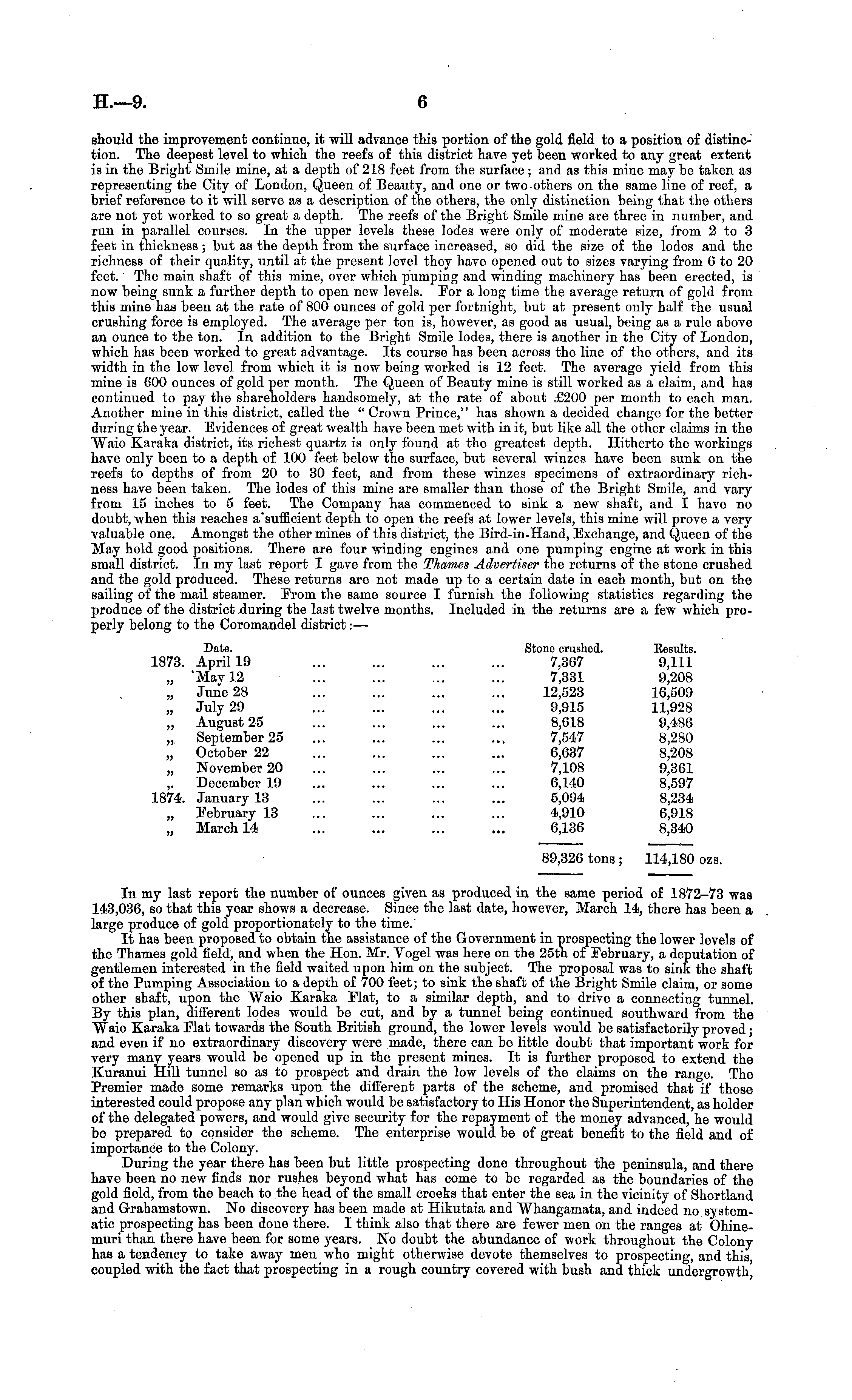 should the improvement continue, it will advance this portion of the gold field to a position of distinction. The deepest level to which the reefs of this district have yet been worked to any great extent is in the Bright Smile mine, at a depth of 218 feet from the surface ; and as this mine may be taken as representing the City of London, Queen of Beauty, and one or two others on the same line of reef, a brief reference to it will serve as a description of the others, the only distinction being that the others are not yet worked to so great a depth. The reefs of the Bright Smile mine are three in number, and run in parallel courses. In the upper levels these lodes were only of moderate size, from 2 to 3 feet in thickness ; but as the depth from the surface increased, so did the size of the lodes and the richness of their quality, until at the present level they have opened out to sizes varying from 6 to 20 feet. The main shaft of this mine, over which pumping and winding machinery has been erected, is now being sunk a further depth to open new levels. For a long time the average return of gold from this mine has been at the rate of 800 ounces of gold per fortnight, but at present only half the usual crushing force is employed. The average per ton is, however, as good as usual, being as a rule above an ounce to the ton. In addition to the Bright Smile lodes, there is another in the City of London, which has been worked to great advantage. Its course has been across the line of the others, and its width in the low level from which it is now being worked is 12 feet. The average yield from this mine is 600 ounces of gold per month. The Queen of Beauty mine is still worked as a claim, and has continued to pay the shareholders handsomely, at the rate of about £200 per month to each man. Another mine in this district, called the " Crown Prince," has shown a decided change for the better during the year. Evidences of great wealth have been met with in it, but like all the other claims in the "Waio Karaka district, its richest quartz is only found at the greatest depth. Hitherto the workings have only been to a depth of 100 feet below the surface, but several winzes have been sunk on the reefs to depths of from 20 to 30 feet, and from these winzes specimens of extraordinary richness have been taken. The lodes of this mine are smaller than those of the Bright Smile, and vary from 15 inches to 5 feet. The Company has commenced to sink a new shaft, and I have no doubt, when this reaches a"sufficient depth to open the reefs at lower levels, this mine will prove a very valuable one. Amongst the other mines of this district, the Bird-in-Hand, Exchange, and Queen of the May hold good positions. There are four winding engines and one pumping engine at work in this small district. In my last report I gave from the Thames Advertiser the returns of the stone crushed and the gold produced. These returns are not made up to a certain date in each month, but on the sailing of the mail steamer. From the same source I furnish the following statistics regarding the produce of the district during the last twelve months. Included in the returns are a few which properly belong to the Coromandel district: — Date. Stone crushed. Eesults. 1873. April 19 ... ... ... ... 7,367 9,111 „ "May 12 ... ... ... ... 7,331 9,208 „ June 28 ... ... ... ... 12,523 16,509 „ July 29 ... ... ... ... 9,915 11,928 „ August 25 ... ... ... ... 8,618 9,486 „ September 25 ... ... ... ... 7,547 8,280 „ October 22 ... ... ... ... 6,637 8,208 „ November 20 ... ... ... ... 7,108 9,361 ~ December 19 ... ... ... ... 6,140 8,597 1874. January 13 ... ... ... ... 5,094 8,234 „ February 13 ... ... ... ... 4,910 6,918 „ March 14 ... ... ... ... 6,136 8,340 89,326 tons ; 114,180 ozs. In my last report the number of ounces given as produced in the same period of 1872-73 was 143,036, so that this year shows a decrease. Since the last date, however, March 14, there has been a large produce of gold proportionately to the time. It has been proposed to obtain the assistance of the Government in prospecting the lower levels of the Thames gold field, and when the Hon. Mr. Vogel was here on the 25th of February, a deputation of gentlemen interested in the field waited upon him on the subject. The proposal was to sink the shaft of the Pumping Association to a depth of 700 feet; to sink the shaft of the Bright Smile claim, or some other shaft, upon the Waio Karaka Flat, to a similar depth, and to drive a connecting tunnel. By this plan, different lodes would be cut, and by a tunnel being continued southward from the "Waio Karaka Flat towards the South British ground, the lower levels would be satisfactorily proved; and even if no extraordinary discovery were made, there can be little doubt that important work for very many years would be opened up in the present mines. It is further proposed to extend the Kuranui Hill tunnel so as to prospect and drain the low levels of the claims on the range. The Premier made some remarks upon the different parts of the scheme, and promised that if those interested could propose any plan which would be satisfactory to His Honor the Superintendent, as holder of the delegated powers, and would give security for the repayment of the money advanced, he would bo prepared to consider the scheme. The enterprise would be of great benefit to the field and of importance to the Colony. During the year there has been but little prospecting done throughout the peninsula, and there have been no new finds nor rushes beyond what has come to be regarded as the boundaries of the gold field, from the beach to the head of the small creeks that enter the sea in the vicinity of Shortland and Grahamstown. No discovery has been made at Hikutaia and Whangamata, and indeed no systematic prospecting has been done there. I think also that there are fewer men on the ranges at Ohinemuri than there have been for some years. No doubt the a