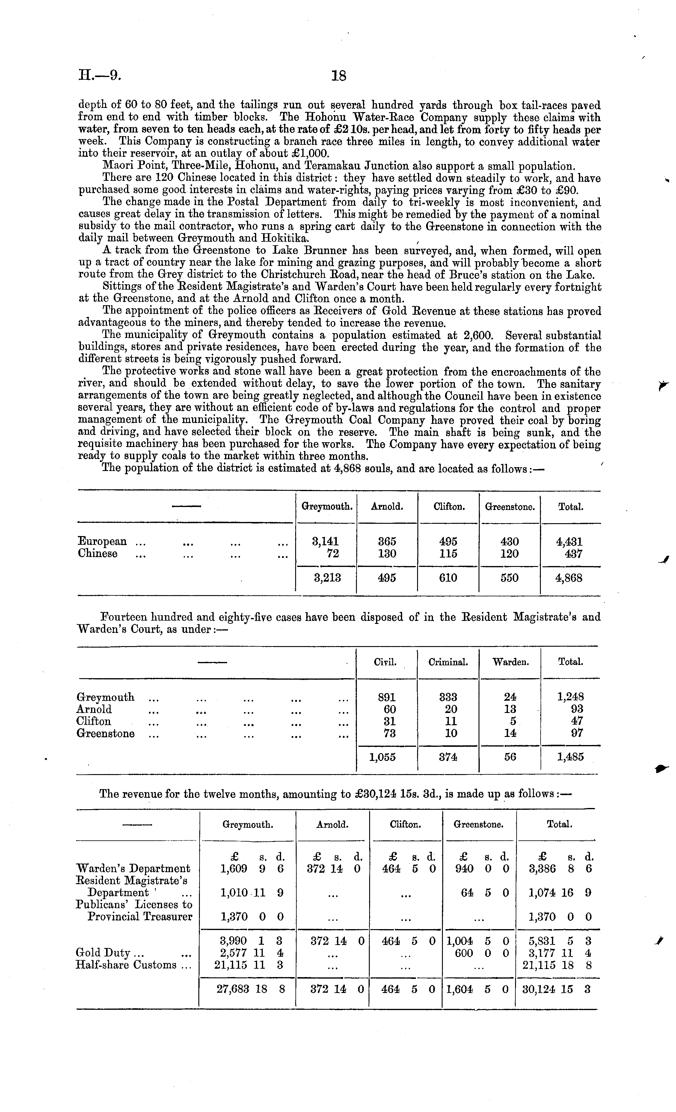 depth of 60 to 80 feet, and the tailings run out several hundred yards through box tail-races paved from end to end with timber blocks. The Hohonu Water-Race Company supply these claims with water, from seven to ten heads each, at the rate of £210s. per head, and let from forty to fifty heads per week. This Company is constructing a branch race three miles in length, to convey additional water into their reservoir, at an outlay of about £1,000. Maori Point, Three-Mile, Hohonu, and Teramakau Junction also support a small population. There are 120 Chinese located in this district: they have settled down steadily to work, and have purchased some good interests in claims and water-rights, paying prices varying from £30 to £90. The change made in the Postal Department from daily to tri-weekly is most inconvenient, and causes great delay in the transmission of letters. This might be remedied by the payment of a nominal subsidy to the mail contractor, who runs a spring cart daily to the Greenstone in connection with the daily mail between Greymouth and Hokitika. A track from the Greenstone to Lake Brunner has been surveyed, and, when formed, will open up a tract of country near the lake for mining and grazing purposes, and will probably become a short route from the Grey district to the Christchurch Road, near the head of Bruce's station on the Lake. Sittings of the Resident Magistrate's and Warden's Court have been held regularly every fortnight at the Greenstone, and at the Arnold and Clifton once a month. The appointment of the police officers as Receivers of Gold Revenue at these stations has proved advantageous to the miners, and thereby tended to increase the revenue. The municipality of Greymouth contains a population estimated at 2,600. Several substantial buildings, stores and private residences, have been erected during the year, and the formation of the different streets is being vigorously pushed forward. The protective works and stone wall have been a great protection from the encroachments of the river, and should be extended without delay, to save the lower portion of the town. The sanitary arrangements of the town are being greatly neglected, and although the Council have been in existence several years, they are without an efficient code of by-laws and regulations for the control and proper management of the municipality. The Greymouth Coal Company have proved their coal by boring and driving, and have selected their block on the reserve. The main shaft is being sunk, and the requisite machinery has been purchased for the works. The Company have every expectation of being ready to supply coals to the market within three months. The population of the district is estimated at 4,868 souls, and are located as follows: —