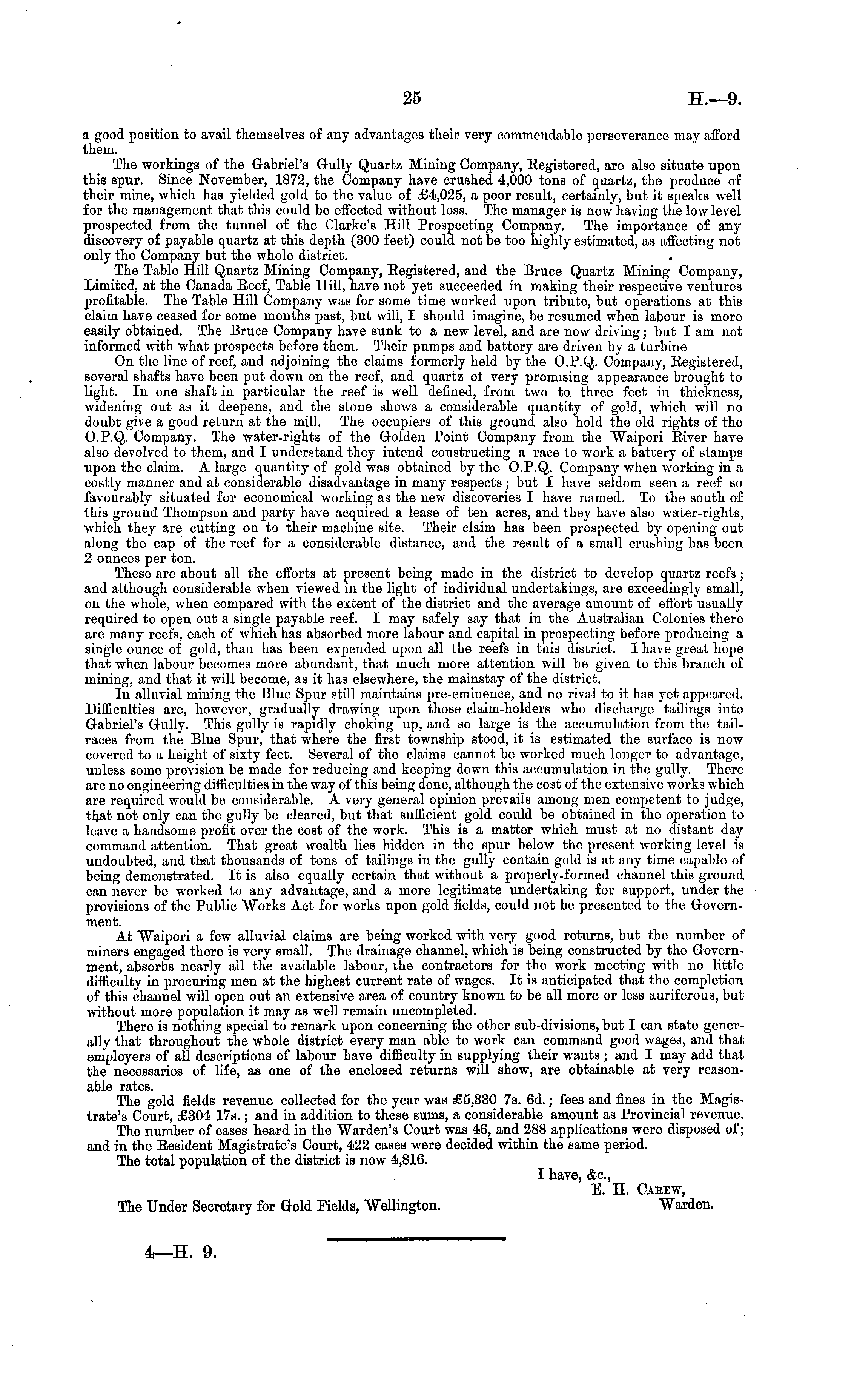 a good position to avail themselves of any advantages their very commendable perseverance may afford them. The workings of the Gabriel's Gully Quartz Mining Company, Eegistered, are also situate upon this spur. Since November, 1872, the Company have crushed 4,000 tons of quartz, the produce of their mine, which has yielded gold to the value of £4,025, a poor result, certainly, but it speaks well for the management that this could be effected without loss. The manager is now having the low level prospected from the tunnel of the Clarke's Hill Prospecting Company. The importance of any discovery of payable quartz at this depth (300 feet) could not be too highly estimated, as affecting not only the Company but the whole district. The Table Hill Quartz Mining Company, Registered, and the Bruce Quartz Mining Company, Limited, at the Canada Reef, Table Hill, have not yet succeeded in making their respective ventures profitable. The Table Hill Company was for some time worked upon tribute, but operations at this claim have ceased for some months past, but will, I should imagine, be resumed when labour is more easily obtained. The Bruce Company have sunk to a new level, and are now driving; but lam not informed with what prospects before them. Their pumps and battery are driven by a turbine On the line of reef, and adjoining the claims formerly held by the O.P.Q. Company, Registered, several shafts have been put down on the reef, and quartz of very promising appearance brought to light. In one shaft in particular the reef is well defined, from two to. three feet in thickness, widening out as it deepens, and the stone shows a considerable quantity of gold, which will no doubt give a good return at the mill. The occupiers of this ground also hold the old rights of the O.P.Q. Company. The water-rights of the Golden Point Company from the Waipori River have also devolved to them, and I understand they intend constructing a race to work a battery of stamps upon the claim. A large quantity of gold wa.s obtained by the O.P.Q. Company when working in a costly manner and at considerable disadvantage in many respects ; but I have seldom seen a reef so favourably situated for economical working as the new discoveries I have named. To the south of this ground Thompson and party have acquired a lease of ten acres, and they have also water-rights, which they are cutting on to their machine site. Their claim has been prospected by opening out along the cap of the reef for a considerable distance, and the result of a small crushing has been 2 ounces per ton. These are about all the efforts at present being made in the district to develop quartz reefs ; and although considerable when viewed in the light of individual undertakings, are exceedingly small, on the whole, when compared with the extent of the district and the average amount of effort usually required to open out a single payable reef. I may safely say that in the Australian Colonies there are many reefs, each of which has absorbed more labour and capital in prospecting before producing a single ounce of gold, than has been expended upon all the reefs in this district. I have great hope that when labour becomes more abundant, that much more attention will be given to this branch of mining, and that it will become, as it has elsewhere, the mainstay of the district. In alluvial mining the Blue Spur still maintains pre-eminence, and no rival to it has yet appeared. Difficulties are, however, gradually drawing upon those claim-holders who discharge tailings into Gabriel's Gully. This gully is rapidly choking up, and so large is the accumulation from the tailraces from the Blue Spur, that where the first township stood, it is estimated the surface is now covered to a height of sixty feet. Several of the claims cannot be worked much longer to advantage, unless some provision be made for reducing and keeping down this accumulation in the gully. There are no engineering difficulties in the way of this being done, although the cost of the extensive works which are required would be considerable. A very general opinion prevails among men competent to judge, that not only can the gully be cleared, but that sufficient gold could be obtained in the operation to leave a handsome profit over the cost of the work. This is a matter which must at no distant day command attention. That great wealth lies hidden in the spur below the present working level is undoubted, and that thousands of tons of tailings in the gully contain gold is at any time capable of being demonstrated. It is also equally certain that without a properly-formed channel this ground can never be worked to any advantage, and a more legitimate undertaking for support, under the provisions of the Public Works Act for works upon gold fields, could not be presented to the Government. At "Waipori a few alluvial claims are being worked with very good returns, but the number of miners engaged there is very small. The drainage channel, which is being constructed by the Government, absorbs nearly all the available labour, the contractors for the work meeting with no little difficulty in procuring men at the highest current rate of wages. It is anticipated that the completion of this channel will open out an extensive area of country known to be all more or less auriferous, but without more population it may as well remain uncompleted. There is nothing special to remark upon concerning the other sub-divisions, but I can state generally that throughout the whole district every man able to work can command good wages, and that employers of all descriptions of labour have difficulty in supplying their wants ; and I may add that the necessaries of life, as one of the enclosed returns will show, are obtainable at very reasonable rates. The gold fields revenue collected for the year was £5,330 7s. 6d.; fees and fines in the Magistrate's Court, £304 175.; and in addition to these sums, a considerable amount as Provi