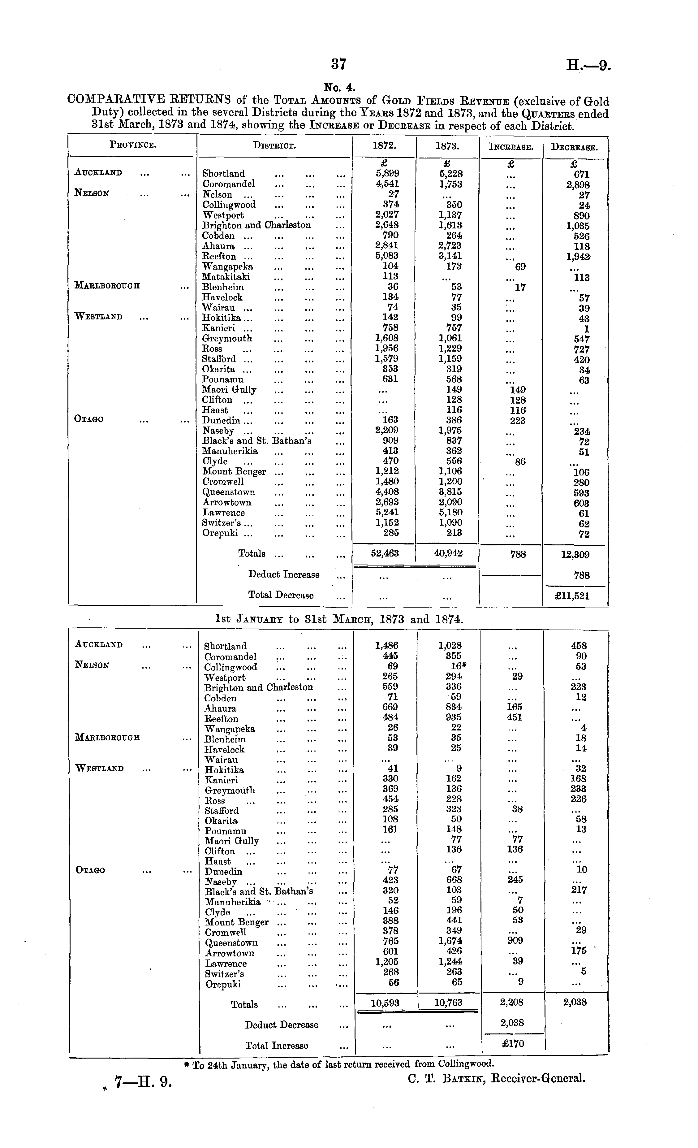 No. 4. COMPARATIVE RETURNS of the TOTAL AMOUNTS of GOLD FIELDS REVENUE (exclusive of Gold Duty) collected in the several Districts during the YEARS 1872 and 1873, and the QUARTERS ended 31st March, 1873 and 1874, showing the INCREASE or DECREASE in respect of each District.