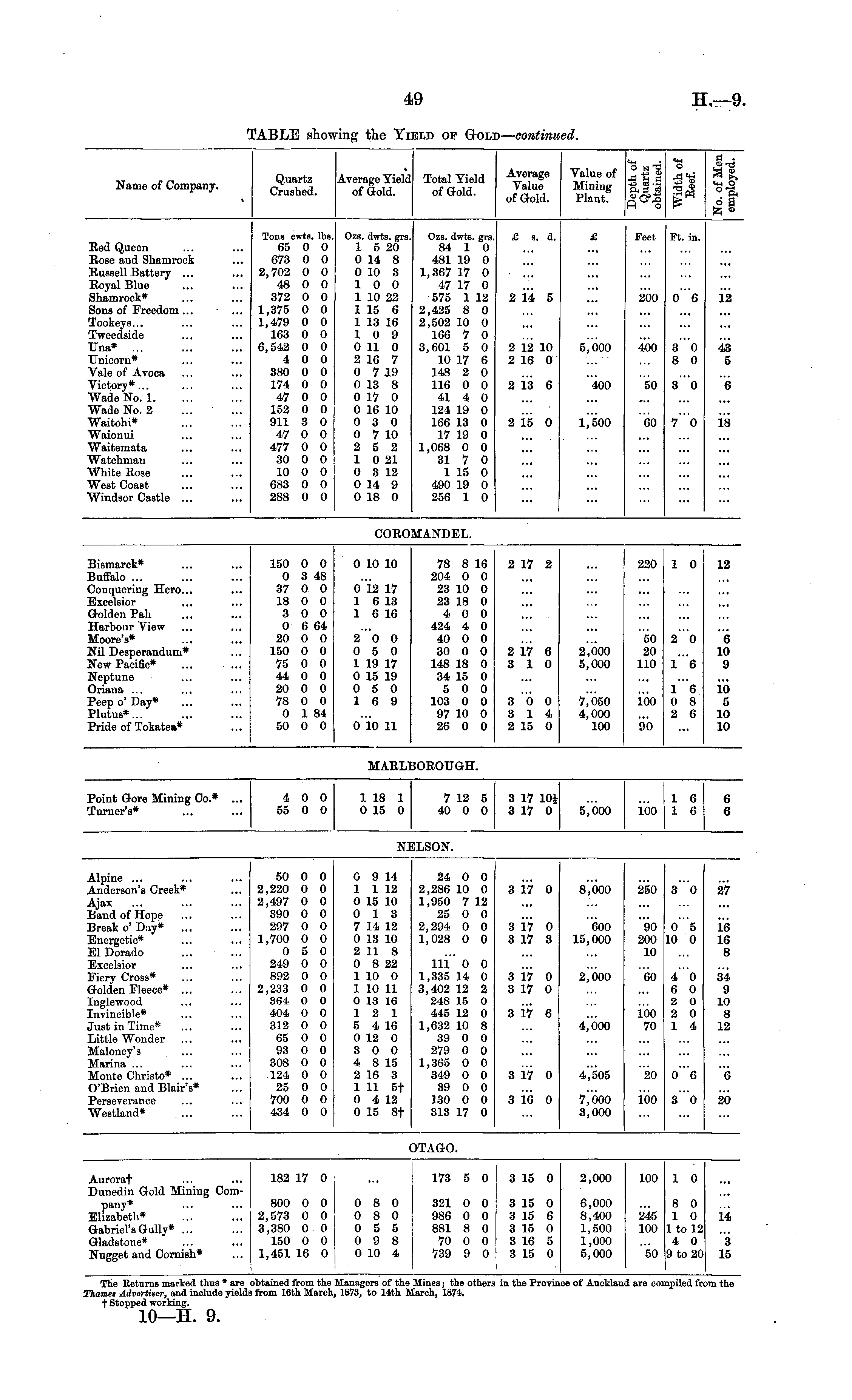 'ABLE sho' ing the Y: :ld of GrOLB — continui :d. Name of Company. Quartz Crushed. Average Yield of Gold. Total Yield Al^Se of Gold. J$™ of Gold. Value of Mining Plant. H o "8 I* «M O o 9 Tons cwts. lbs. 65 0 0 673 0 0 2,702 0 0 48 0 0 372 0 0 1,375 0 0 1,479 0 0 163 0 0 6,542 0 0 4 0 0 380 0 0 174 0 0 47 0 0 152 0 0 911 3 0 47 0 0 477 0 0 30 0 0 10 0 0 683 0 0 288 0 0 Ozs. dwts. grs. 1 5 20 0 14 8 0 10 3 10 0 1 10 22 1 15 6 1 13 16 10 9 0 11 0 2 16 7 0 7 19 0 13 8 0 17 0 0 16 10 0 3 0 0 7 10 2 5 2 1 0 21 0 3 12 0 14 9 0 18 0 Oza. dwts. gra. 84 1 O 481 19 0 1,367 17 0 47 17 0 575 1 12 2,425 8 0 2,502 10 0 166 7 0 3,601 5 0 10 17 6 148 2 0 116 0 0 41 4 0 124 19 0 166 13 0 17 19 0 1,068 0 0 31 7 0 1 15 0 490 19 0 256 1 0 £ s. d. £ Feet Ft. in. Red Queen Rose and Shamrock Russell Battery ... Royal Blue Shamrock* Sons of Freedom ... Tookeys... Tweedside Una* ... Unicorn* Vale of Avoca Victory*... Wade No. 1. Wade No. 2 Waitohi* Waionui Waitemata Watchman White Rose West Coast Windsor Castle ... 2 14 5 2 12 10 2 16 0 2 18 6 5^000 400 200 400 "50 0 6 3 "0 8 0 3 "0 12 43 5 6 2 15 0 1/500 60 7"'o 18 CORO :andel. Bismarck* Buffalo ... Conquering Hero,.. Excelsior Golden Pah Harbour View Moore's* Nil Desperandum* New Pacific* Neptune Oriana ... Peep o' Day* Plutus*..." Pride of Tokatea* 150 0 0 0 3 48 37 0 0 18 0 0 3 0 0 0 6 64 20 0 0 150 0 0 75 0 0 44 0 0 20 0 0 78 0 0 0 1 84 50 0 0 0 10 10 78 8 16 204 0 0 23 10 0 23 18 0 4 0 0 424 4 0 40 0 0 30 0 0 148 18 0 34 15 0 5 0 0 103 0 0 97 10 0 26 0 0 2 17 2 220 1 0 12 0 12 17 1 6 13 1 6 16 2 0 0 0 5 0 1 19 17 0 15 19 0 5 0 16 9 2 17 6 3 10 2,000 5,000 50 20 110 20 16 6 10 9 3 0 0 3 14 2 15 0 7,050 4,000 100 100 1 6 0 8 2 6 10 5 10 10 0 10 11 90 marl: IC-ROUGH. Point Gore Mining Co.* Turner's* 4 0 0 55 0 0 1 18 1 0 15 0 7 12 5 40 0 0 3 17 10J 3 17 0 5,000 100 1 6 1 6 6 6 :lson. Alpine ... Anderson's Creek* Ajax Hand of Hope Break o' Day* Energetic* El Dorado Excelsior Ifiery Cross* Golden Fleece* ... Inglewood Invincible* Just in Time* Little Wonder ... Maloney's Marina ... Monte Christo* ... O'Brien and Blair's* Perseverance Westland* 50 0 0 2,220 0 0 2,497 0 0 390 0 0 297 0 0 1,700 0 0 0 5 0 249 0 0 892 0 0 2,233 0 0 364 0 0 404 0 0 312 0 0 65 0 0 93 0 0 308 0 0 124 0 0 25 0 0 700 0 0 434 0 0 0 9 14 1 1 12 0 15 10 0 13 7 14 12 0 13 10 2 11 8 0 8 22 1 10 0 1 10 11 O 13 16 12 1 5 4 16 0 12 0 3 0 0 4 8 15 2 16 3 1 11 5f 0 4 12 0 15 8f 24 0 0 2,286 10 0 1,950 7 12 25 0 0 2,294 0 0 1,028 0 0 111 0 0 1,335 14 0 3,402 12 2 248 15 O 445 12 0 1,632 10 8 39 0 0 279 0 0 1,365 0 0 349 0 0 39 0 0 130 0 0 313 17 0 3 17 0 3 17 0 3 17 3 3 17 0 3 17 0 8,000 600 15,000 2,000 250 90 200 10 60 3 "o 0 5 10 0 4 0 6 0 2 0 2 0 1 4 » 10 16 8 84 9 10 8 12 3 17 6 4,000 100 70 3 17 0 4,505 20 0 "6 "a 3 16 0 riboo 3,000 ibo 3 0 20 ITAGO. Auroraf Dunedin Gold Mining Company* Elizabetii* Gabriel's Gully* ... Gladstone* Nugget and Cornish* 182 17 0 173 5 0 3 15 0 2,000 100 1 0 800 0 0 2,573 0 0 3,380 0 0 150 0 0 1,451 16 0 0 8 0 0 8 0 0 5 5 0 9 8 0 10 4 321 0 0 986 0 0 881 8 0 70 0 0 739 9 0 3 15 0 3 15 6 3 15 0 3 16 5 3 15 0 6,000 8,400 1,500 1,000 5,000 245 100 8 0 1 0 1 to 12 4 0 9 to 20 11 50 "a 15 The Returns marked thus * are Thames Advertiser, and include yields t Stopped working. 10—H. 9. >btained from the Managers of the Mines; the others in the Province of Auckland are compiled from the from 16th March, 1873, to 14th March, 1874.
