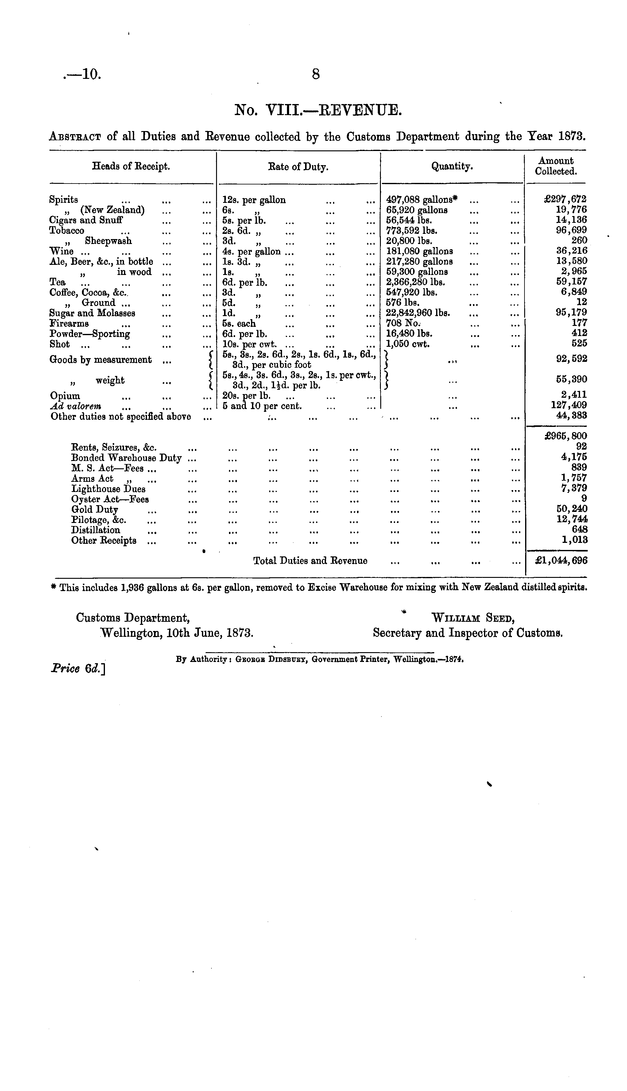 No. VIII.—REVENUE. ABSTRACT of all Duties and Revenue collected by the Customs Department during the Year 1873.