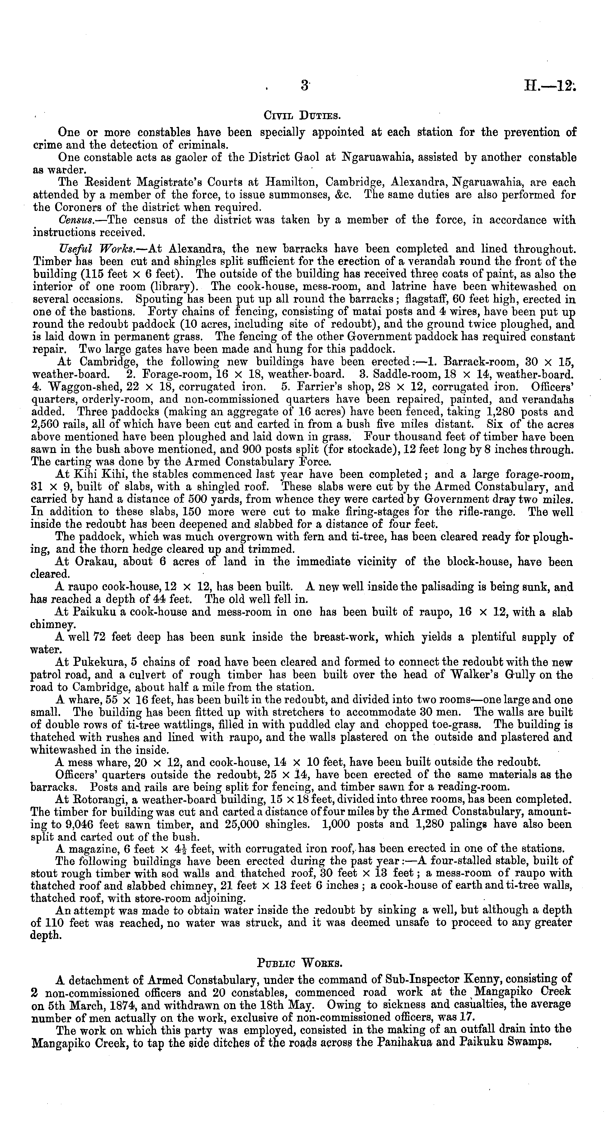 Civil Duties. One or more constables have been specially appointed at each station for the prevention of crime and the detection of criminals. One constable acts as gaoler of the District Gaol at Ngaruawahia, assisted by another constable as warder. The Resident Magistrate's Courts at Hamilton, Cambridge, Alexandra, Ngaruawahia, are each attended by a member of the force, to issue summonses, &c. The same duties are also performed for the Coroners of the district when required. Census. —The census of the district was taken by a member of the force, in accordance with instructions received. Useful Works. —At Alexandra, the new barracks have been completed and lined throughout. Timber has been cut and shingles split sufficient for the erection of a verandah round the front of the building (115 feet X 6 feet). The outside of the building has received three coats of paint, as also the interior of one room (library). The cook-house, mess-room, and latrine have been whitewashed on several occasions. Spouting has been put up all round the barracks; flagstaff, 60 feet high, erected in one of the bastions. Forty chains of fencing, consisting of matai posts and 4 wires, have been put up round the redoubt paddock (10 acres, including site of redoubt), and the ground twice ploughed, and is laid down in permanent grass. The fencing of the other Government paddock has required constant repair. Two large gates have been made and hung for this paddock. At Cambridge, the following new buildings have been erected:—l. Barrack-room, 30 x 15, weather-board. 2. Forage-room, 16 x 18, weather-board. 3. Saddle-room, 18 x 14, weather-board. 4. Waggon-shed, 22 X 18, corrugated iron. 5. Farrier's shop, 28 x 12, corrugated iron. Officers' quarters, orderly-room, and non-commissioned quarters have been repaired, painted, and verandahs added. Three paddocks (making an aggregate of 16 acres) have been fenced, taking 1,280 posts and 2,560 rails, all of which have been cut and carted in from a bush five miles distant. Six of the acres above mentioned have been ploughed and laid down in grass. Four thousand feet of timber have been sawn in the bush above mentioned, and 900 posts split (for stockade), 12 feet long by 8 inches through. The carting was done by the Armed Constabulary Force. At Kihi Kihi, the stables commenced last year have been completed; and a large forage-room, 31 X 9, built of slabs, with a shingled roof. These slabs were cut by the Armed Constabulary, and carried by hand a distance of 500 yards, from whence they were carted by Government dray two miles. In addition to these slabs, 150 more were cut to make firing-stages for the rifle-range. The well inside the redoubt has been deepened and slabbed for a distance of four feet. The paddock, which was much overgrown with fern and ti-tree, has been cleared ready for ploughing, and the thorn hedge cleared up and trimmed. At Orakau, about 6 acres of land in the immediate vicinity of the block-house, have been cleared. A raupo cook-house, 12 x 12, has been built. A new well inside the palisading is being sunk, and has reached a depth of 44 feet. The old well fell in. At Paikuku a cook-house and mess-room in one has been built of raupo, 16 x 12, with a slab chimney. A well 72 feet deep has been sunk inside the breast-work, which yields a plentiful supply of water. At Pukekura, 5 chains of road have been cleared and formed to connect the redoubt with the new patrol road, and a culvert of rough timber has been built over the head of Walker's Gully on the road to Cambridge, about half a mile from the station. A whare, 55 x 16 feet, has been built in the redoubt, and divided into two rooms—one large and one small. The building has been fitted up with stretchers to accommodate 30 men. The walls are built of double rows of ti-tree wattlings, filled in with puddled clay and chopped toe-grass. The building is thatched with rushes and lined with raupo, and the walls plastered on the outside and plastered and whitewashed in the inside. A mess whare, 20 x 12, and cook-house, 14 X 10 feet, have been built outside the redoubt. Officers' quarters outside the redoubt, 25 X 14, have been erected of the same materials as the barracks. Posts and rails are being split for fencing, and timber sawn for a reading-room. At Eotorangi, a weather-board building, 15 x 18 feet, divided into three rooms, has been completed. The timber for building was cut and carted a distance of four miles by the Armed Constabulary, amounting to 9,046 feet sawn timber, and 25,000 shingles. 1,000 posts and 1,280 palings have also been split and carted out of the bush. A magazine, 6 feet X 4-j feet, with corrugated iron roof, has been erected in one of the stations. The following buildings have been erected during the past year :■ —A four-stalled stable, built of stout rough timber with sod walls and thatched roof, 30 feet Xl 3 feet; a mess-room of raupo with thatched roof and slabbed chimney, 21 feet X 13 feet 6 inches ; a cook-house of earth and ti-tree walls, thatched roof, with store-room adjoining. An attempt was made to obtain water inside the redoubt by sinking a well, but although a depth of 110 feet was reached, no water was struck, and it was deemed unsafe to proceed to any greater depth. Public Woeks. A detachment of Armed Constabulary, under the command of Sub-Inspector Kenny, consisting of 2 non-commissioned officers and 20 constables, commenced road work at the Mangapiko Creek on sth March, 1874, and withdrawn on the 18th May. Owing to sickness and casualties, the average number of men actually on the work, exclusive of non-commissioned officers, was 17. The work on which this party was employed, consisted in the making of an outfall drain into the Mangapiko Creek, to tap the side ditches of the roads across the Panihakua and Paikuku Swamps.