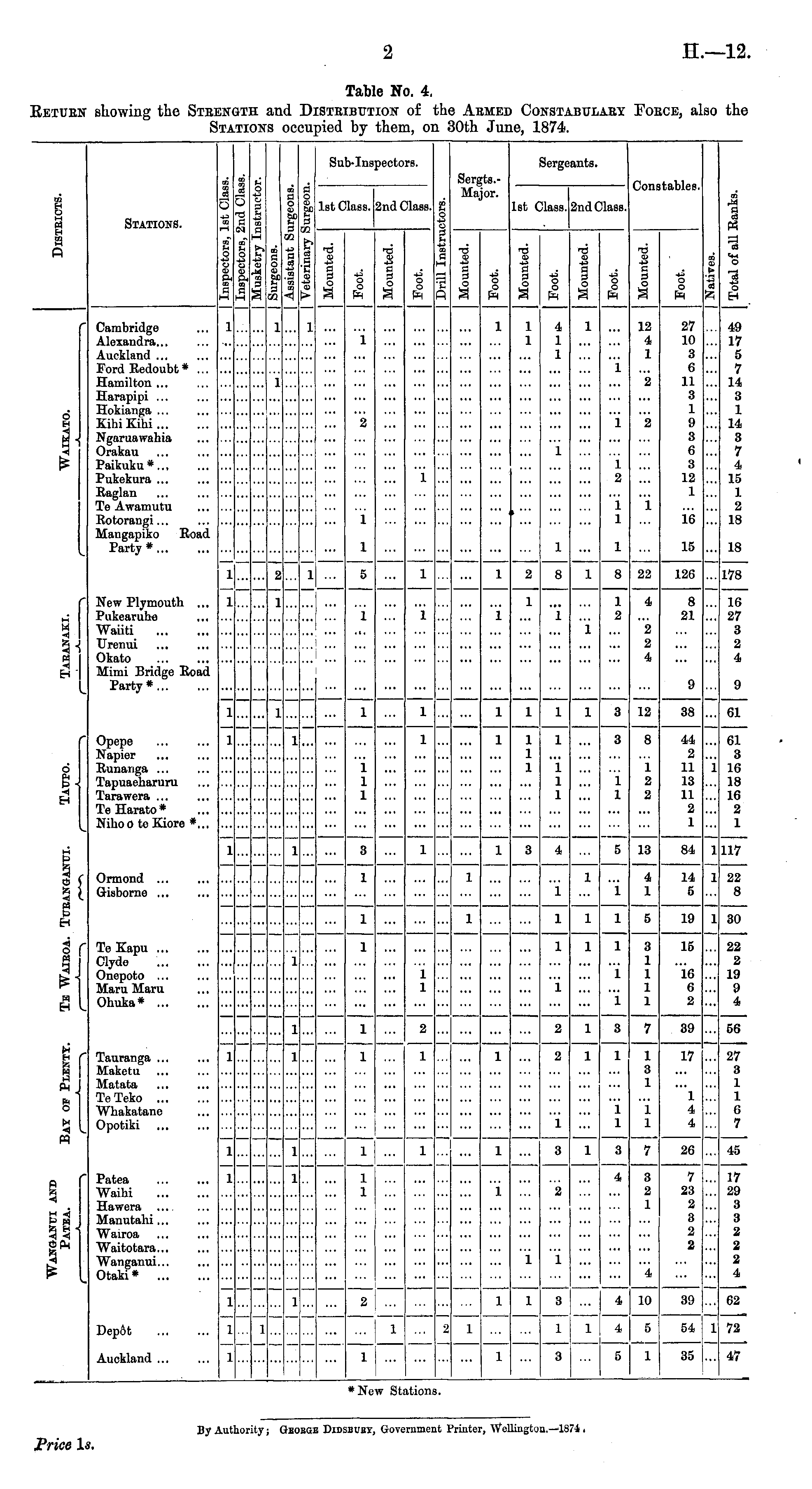 Table No. 4. RETURN showing the STRENGTH and DISTRIBUTION of the ARMED CONSTABULARY FORCE, also the STATIONS occupied by them, on 30th June, 1874.