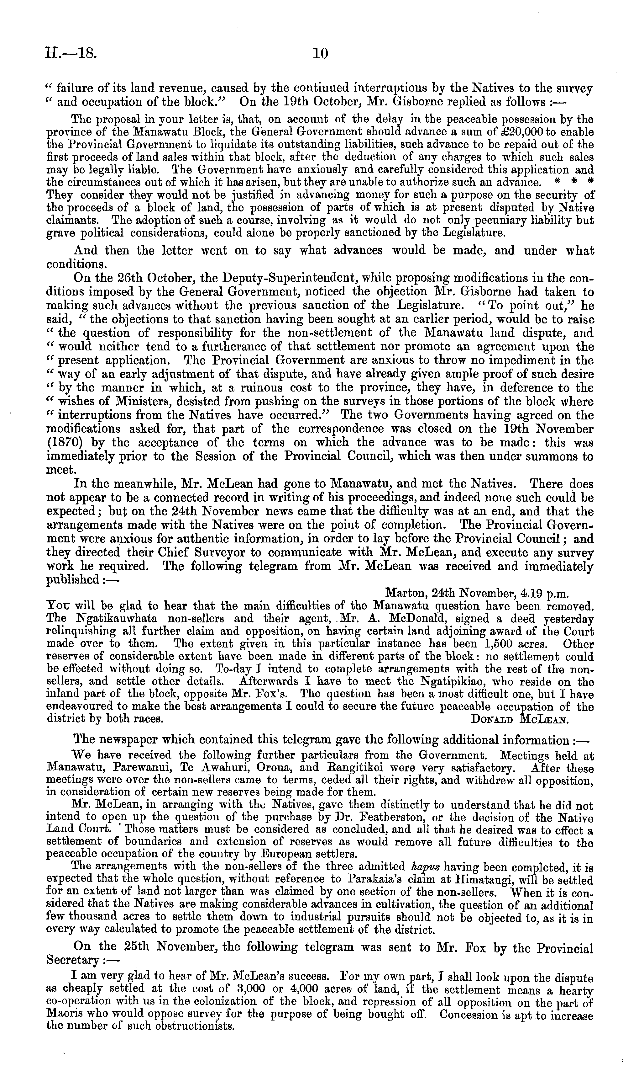 " failure of its land revenue, caused by the continued interruptions by the Natives to the survey " and occupation of the block." On the 19th October, Mr. Gisborne replied as follows :— The proposal in your letter is, that, on account of the delay in the peaceable possession by the province of the Manawatu Block, the General Government should advance a sum of £20,000 to enable the Provincial Government to liquidate its outstanding liabilities, such advance to be repaid out of the first proceeds of land sales within that block, after the deduction of any charges to which such sales may be legally liable. The Government have anxiously and carefully considered this application and the circumstances out of which it has arisen, but they are unable to authorize such an advance. * * * They consider they would not be justified in advancing money for such a purpose on the security of the proceeds of a block of land, the possession of parts of which is at present disputed by Native claimants. The adoption of such a course, involving as it would do not only pecuniary liability but grave political considerations, could alone be properly sanctioned by the Legislature. And then the letter went on to say what advances would be made, and under what conditions. On the 26th October, the Deputy-Superintendent, while proposing modifications in the conditions imposed by the General Government, noticed the objection Mr. Gisborne had taken to making such advances without the previous sanction of the Legislature. "To point out," he said, " the objections to that sanction having been sought at an earlier period, would be to raise " the question of responsibility for the non-settlement of the Manawatu land dispute, and " would neither tend to a furtherance of that settlement nor promote an agreement upon the " present application. The Provincial Government are anxious to throw no impediment in the " way of an early adjustment of that dispute, and have already given ample proof of such desire " by the manner in which, at a ruinous cost to the province, they have, in deference to the " wishes of Ministers, desisted from pushing on the surveys in those portions of the block where " interruptions from the Natives have occurred." The two Governments having agreed on the modifications asked for, that part of the correspondence was closed on the 19th November (1870) by the acceptance of the terms on which the advance was to be made: this was immediately prior to the Session of the Provincial Council, which was then under summons to meet. In the meanwhile, Mr. McLean had gone to Manawatu, and met the Natives. There does not appear to be a connected record in writing of his proceedings, and indeed none such could be expected; but on the 24th November news came that the difficulty was at an end, and that the arrangements made with the Natives were on the point of completion. The Provincial Government were anxious for authentic information, in order to lay before the Provincial Council; and they directed their Chief Surveyor to communicate with Mr. McLean, and execute any survey work he required. The following telegram from Mr. McLean was received and immediately published:— Marton, 24th November, 4.19 p.m. You will be glad to hear that the main difficulties of the Manawatu question have been removed. The Ngatikauwhata non-sellers and their agent, Mr. A. McDonald, signed a deed yesterday relinquishing all further claim and opposition, on having certain land adjoining award of the Court made over to them. The extent given in this particular instance has been 1,500 acres. Other reserves of considerable extent have been made in different parts of the block: no settlement could be effected without doing so. To-day I intend to complete arrangements with the rest of the nonsellers, and settle other details. Afterwards I have to meet the Ngatipikiao, who reside on the inland part of the block, opposite Mr. Fox's. The question has been a most difficult one, but I have endeavoured to make the best arrangements I could to secure the future peaceable occupation of the district by both races. Donald McLean. The newspaper which contained this telegram gave the following additional information :— We have received the following further particulars from the Government. Meetings held at Manawatu, Parewanui, Te Awahuri, Oroua, and Rangitikei were very satisfactory. After these meetings were over the non-sellers came to terms, ceded all their rights, and withdrew all opposition, in consideration of certain new reserves being made for them. Mr. McLean, in arranging with the Natives, gave them distinctly to understand that he did not intend to open up the question of the purchase by Dr. Featherston, or the decision of the Native Land Court. ' Those matters must be considered as concluded, and all that he desired was to effect a settlement of boundaries and extension of reserves as would remove all future difficulties to the peaceable occupation of the country by European settlers. The arrangements with the non-sellers of the three admitted hapus having been completed, it is expected that the whole question, without reference to Parakaia's claim at Himatangi, will be settled for an extent of land not larger than was claimed by one section of the non-sellers. When it is considered that the Natives are making considerable advances in cultivation, the question of an additional few thousand acres to settle them down to industrial pursuits should not be objected to, as it is in every way calculated to promote the peaceable settlement of the district. On the 25th November, the following telegram was sent to Mr. Fox by the Provincial Secretary:— lam very glad to hear of Mr. McLean's success. For my own part, I shall look upon the dispute as cheaply settled at the cost of 3,000 or 4,000 acres of land, if the settlement means a hearty co-operation with us in the colonization of the block, and repression of all opposition on the part of Maoris wh