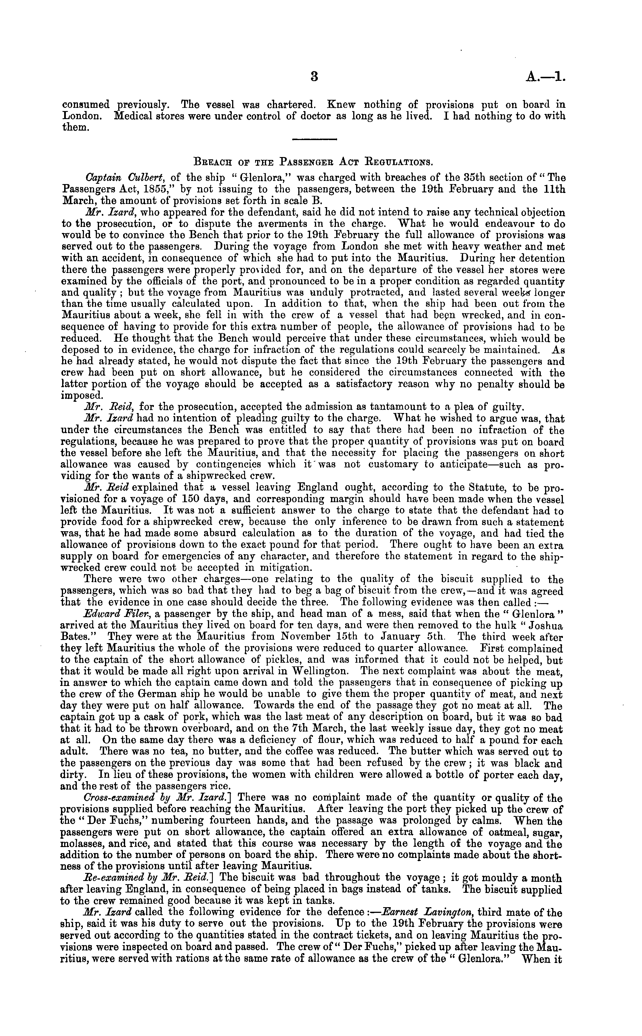 consumed previously. The vessel was chartered. Knew nothing of provisions put on board in London. Medical stores were under control of doctor as long as he lived. I had nothing to do with them. Beeach op tiie Passengeb Act Eegttlations. Captain Culbert, of the ship " Grlenlora," was charged with breaches of the 35th section of " The Passengers Act, 1855," by not issuing to the passengers, between the 19th February and the 11th March, the amount of provisions set forth in scale B. Mr. Izard, who appeared for the defendant, said he did not intend to raise any technical objection to the prosecution, or to dispute the averments in the charge. "What he would endeavour to do would be to convince the Bench that prior to the 19th February the full allowance of provisions was served out to the passengers. During the voyage from London she met with heavy weather and met with an accident, in consequence of which she had to put into the Mauritius. During her detention there the passengers were properly provided for, and on the departure of the vessel her stores were examined by the officials of the port, and pronounced to be in a proper condition as regarded quantity and quality ; but the voyage from Mauritius was unduly protracted, and lasted several week-s longer than the time usually calculated upon. In addition to that, when the ship had been out from the Mauritius about a week, she fell in with the crew of a vessel that had bepn wrecked, and in consequence of having to provide for this extra number of people, the allowance of provisions had to be reduced. He thought that the Bench would perceive that under these circumstances, which would be deposed to in evidence, the charge for infraction of the regulations could scarcely be maintained. As he had already stated, he would not dispute the fact that since the 19th February the passengers and crew had been put on short allowance, but he considered the circumstances connected with the latter portion of the voyage should be accepted as a satisfactory reason why no penalty should be imposed. Mr. Held, for the prosecution, accepted the admission as tantamount to a plea of guilty. Mr. Izard had no intention of pleading guilty to the charge. What he wished to argue was, that under the circumstances the Bench was entitled to say that there had been no infraction of the regulations, because he was prepared to prove that the proper quantity of provisions was put on board the vessel before she left the Mauritius, and that the necessity for placing the passengers on short allowance was caused by contingencies which it was not customary to anticipate—such as providing for the wants of a shipwrecked crew. Mr. Reid explained that a vessel leaving England ought, according to the Statute, to be provisioned for a voyage of 150 days, and corresponding margin should have been made when the vessel left the Mauritius. It was not a sufficient answer to the charge to state that the defendant had to provide food for a shipwrecked crew, because the only inferenco to be drawn from such a statement was, that he had made some absurd calculation as to the duration of the voyage, and had tied the allowance of provisions down to the exact pound for that period. There ought to have been an extra supply on board for emergencies of any character, and therefore the statement in regard to the shipwrecked crew could not be accepted in mitigation. There were two other charges—one relating to the quality of the biscuit supplied to the passengers, which was so bad that they had to beg a bag of biscuit from the crew, —and it was agreed that the evidence in one case should decide the three. The following evidence was then called :— Edward Filer, a passenger by the ship, and head man of a mess, said that when the " Grlenlora " arrived at the Mauritius they lived on board for ten days, and were then removed to the hulk " Joshua Bates." They were at the Mauritius from November 15th to January sth. The third week after they left Mauritius the whole of the provisions were reduced to quarter allowance. First complained to the captain of the short allowance of pickles, and was informed that it could not be helped, but that it would be made all right upon arrival in Wellington. The next complaint was about the meat, in answer to which the captain came down and told the passengers that in consequence of picking up the crew of the German ship he would be unable to give them the proper quantity of meat, and next day they were put on half allowance. Towards the end of the passage they got no meat at all. The captain got up a cask of pork, which was the last meat of any description on board, but it was so bad that it had to be thrown overboard, and on the 7th March, the last weekly issue day, they got no meat at all. On the same day there was a deficiency of flour, which was reduced to half a pound for each adult. There was no tea, no butter, and the coffee was reduced. The butter which was served out to the passengers on the previous day was some that had been refused by the crew; it was black and dirty. In lieu of these provisions, the women with children were allowed a bottle of porter each day, and the rest of the passengers rice. Cross-examined by Mr. Izard.~\ There was no complaint made of the quantity or quality of the provisions supplied before reaching the Mauritius. After leaving the port they picked up the crew of the " Der Fuchs," numbering fourteen hands, and the passage was prolonged by calms. When the passengers were put on short allowance, the captain offered an extra allowance of oatmeal, sugar, molasses, and rice, and stated that this course was necessary by the length of the voyage and the addition to the number of persons on board the ship. There were no complaints made about the shortness of the provisions until after leaving Mauritius. Re-examined by Mr. Reid.~\ The biscuit was bad throughout the voyage ; it got mouldy a month after leaving England, in consequence of bei