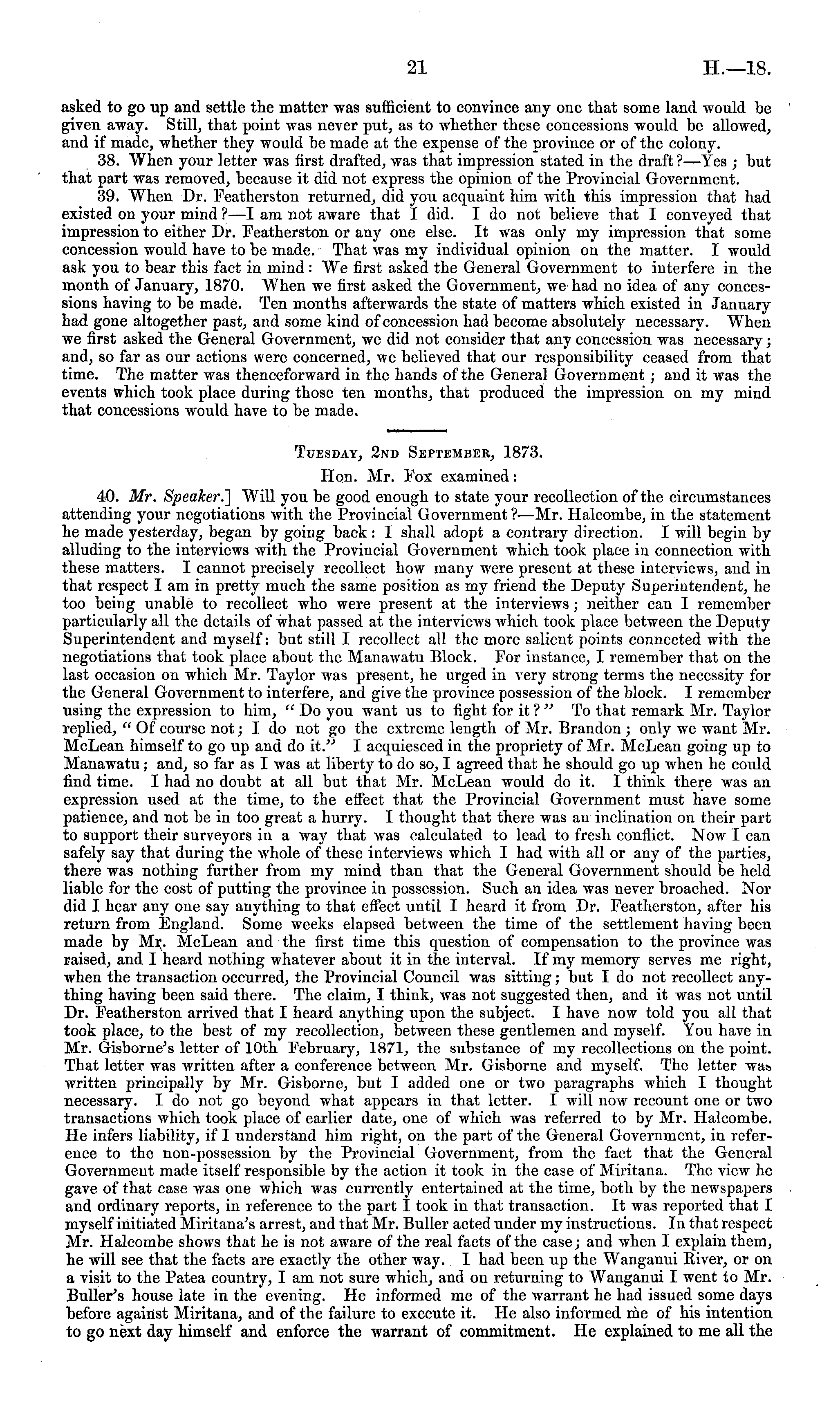 asked to go up and settle the matter was sufficient to convince any one that some land would be given away. Still, that point was never put, as to whether these concessions would be allowed, and if made, whether they would be made at the expense of the province or of the colony. 38. When your letter was first drafted, was that impression stated in the draft ?—Yes ; but that part was removed, because it did not express the opinion of the Provincial Government. 39. When Dr. Featherston returned, did you acquaint him with this impression that had existed on your mind ?—I am not aware that I did. Ido not believe that I conveyed that impression to either Dr. Featherston or any one else. It was only my impression that some concession would have to be made. That was my individual opinion on the matter. I would ask you to bear this fact in mind : We first asked the General Government to interfere in the month of January, 1870. When we first asked the Government, we had no idea of any concessions having to be made. Ten months afterwards the state of matters which existed in January had gone altogether past, and some kind of concession had become absolutely necessary. When we first asked the General Government, we did not consider that any concession was necessary; and, so far as our actions were concerned, we believed that our responsibility ceased from that time. The matter was thenceforward in the hands of the General Government; and it was the events which took place during those ten months, that produced the impression on my mind that concessions would have to be made. Tuesday, 2nd September, 1873. Hon. Mr. Fox examined: 40. Mr. Speaker. .] Will you be good enough to state your recollection of the circumstances attending your negotiations with the Provincial Government ?—Mr. Halcombe, in the statement he made yesterday, began by going back: I shall adopt a contrary direction. I will begin by alluding to the interviews with the Provincial Government which took place in connection with these matters. I cannot precisely recollect how many were present at these interviews, and in that respect I am in pretty much the same position as my friend the Deputy Superintendent, he too being unable to recollect who were present at the interviews; neither can I remember particularly all the details of what passed at the interviews which took place between the Deputy Superintendent and myself: but still I recollect all the more salient points connected with the negotiations that took place about the Manawatu Block. For instance, I remember that on the last occasion on which Mr. Taylor was present, he urged in very strong terms the necessity for the General Government to interfere, and give the province possession of the block. I remember using the expression to him, "Do you want us to fight for it ? " To that remark Mr. Taylor replied, "Of course not; I do not go the extreme length of Mr. Brandon ; only we want Mr. McLean himself to go up and do it." I acquiesced in the propriety of Mr. McLean going up to Manawatu ; and, so far as I was at liberty to do so, I agreed that he should go up when he could find time. I had no doubt at all but that Mr. McLean would do it. I think there was an expression used at the time, to the effect that the Provincial Government must have some patience, and not be in too great a hurry. I thought that there was an inclination on their part to support their surveyors in a way that was calculated to lead to fresh conflict. Now I can safely say that during the whole of these interviews which I had with all or any of the parties, there was nothing further from my mind than that the General Government should be held liable for the cost of putting the province in possession. Such an idea was never broached. Nor did I hear any one say anything to that effect until I heard it from Dr. Featherston, after his return from England. Some weeks elapsed between the time of the settlement having been made by Mr. McLean and the first time this question of compensation to the province was raised, and I heard nothing whatever about it in the interval. If my memory serves me right, when the transaction occurred, the Provincial Council was sitting; but Ido not recollect anything having been said there. The claim, I think, was not suggested then, and it was not until Dr. Featherston arrived that I heard anything upon the subject. I have now told you all that took place, to the best of my recollection, between these gentlemen and myself. You have in Mr. Gisborne's letter of 10th February, 1871, the substance of my recollections on the point. That letter was written after a conference between Mr. Gisborne and myself. The letter was written principally by Mr. Gisborne, but I added one or two paragraphs which I thought necessary. I do not go beyond what appears in that letter. I will now recount one or two transactions which took place of earlier date, one of which was referred to by Mr. Halcombe. He infers liability, if I understand him right, on the part of the General Government, in reference to the non-possession by the Provincial Government, from the fact that the General Government made itself responsible by the action it took in the case of Miritana. The view he gave of that case was one which was currently entertained at the time, both by the newspapers and ordinary reports, in reference to the part I took in that transaction. It was reported that I myself initiated Miritana's arrest, and that Mr. Buller acted under my instructions. In that respect Mr. Halcombe shows that he is not aware of the real facts of the case; and when I explain them, he will see that the facts are exactly the other way. I had been up the Wanganui River, or on a visit to the Patea country, I am not sure which, and on returning to Wanganui I went to Mr. Buller's house late in the evening. He informed me of the warrant he had issued some days before against Miritana, and of the failure to execute it. He also informed m
