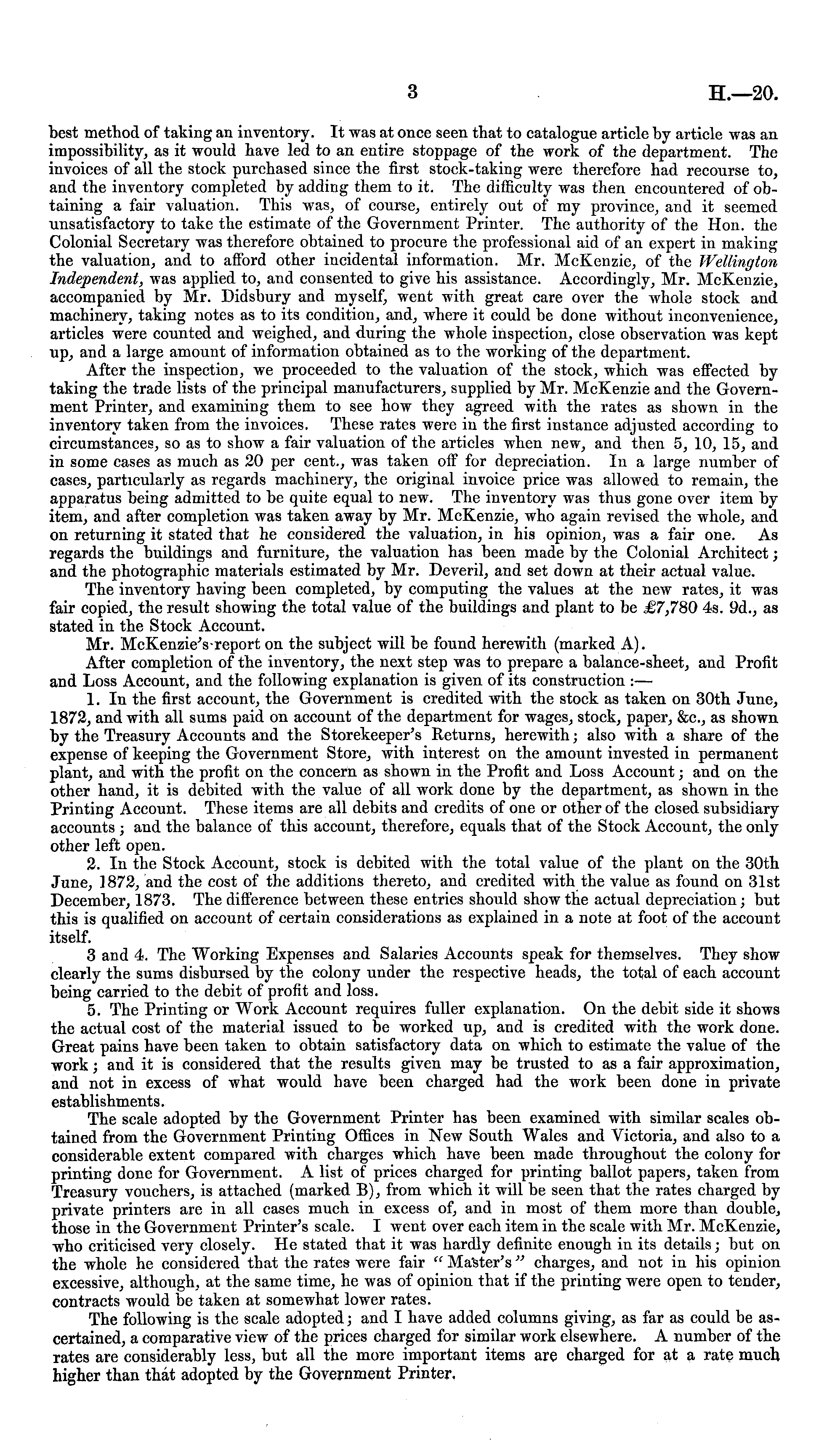 best method of taking an inventory. It was at once seen that to catalogue article by article was an impossibility, as it would have led to an entire stoppage of the work of the department. The invoices of all the stock purchased since the first stock-taking were therefore had recourse to, and the inventory completed by adding them to it. The difficulty was then encountered of obtaining a fair valuation. This was, of course, entirely out of my province, and it seemed unsatisfactory to take the estimate of the Government Printer. The authority of the Hon. the Colonial Secretary was therefore obtained to procure the professional aid of an expert in making the valuation, and to afford other incidental information. Mr. McKenzie, of the Wellington Independent, was applied to, and consented to give his assistance. Accordingly, Mr. McKenzie, accompanied by Mr. Didsbury and myself, went with great care over the whole stock and machinery, taking notes as to its condition, and, where it could be done without inconvenience, articles were counted and weighed, and during the whole inspection, close observation was kept up, and a large amount of information obtained as to the working of the department. After the inspection, we proceeded to the valuation of the stock, which was effected by taking the trade lists of the principal manufacturers, supplied by Mr. McKenzie and the Government Printer, and examining them to see how they agreed with the rates as shown in the inventory taken from the invoices. These rates were in the first instance adjusted according to circumstances, so as to show a fair valuation of the articles when new, and then 5, 10, 15, and in some cases as much as 20 per cent., was taken off for depreciation. In a large number of cases, particularly as regards machinery, the original invoice price was allowed to remain, the apparatus being admitted to be quite equal to new. The inventory was thus gone over item by item, and after completion was taken away by Mr. McKenzie, who again revised the whole, and on returning it stated that he considered the valuation, in his opinion, was a fair one. As regards the buildings and furniture, the valuation has been made by the Colonial Architect; and the photographic materials estimated by Mr. Deveril, and set down at their actual value. The inventory having been completed, by computing the values at the new rates, it was fair copied, the result showing the total value of the buildings and plant to be £7,780 4s. 9d., as stated in the Stock Account. Mr. McKenzie's report on the subject will be found herewith (marked A). After completion of the inventory, the next step was to prepare a balance-sheet, and Profit and Loss Account, and the following explanation is given of its construction :— 1. In the first account, the Government is credited with the stock as taken on 30th June, 1872, and with all sums paid on account of the department for wages, stock, paper, &c, as shown by the Treasury Accounts and the Storekeeper's Returns, herewith; also with a share of the expense of keeping the Government Store, with interest on the amount invested in permanent plant, and with the profit on the concern as shown in the Profit and Loss Account; and on the other hand, it is debited with the value of all work done by the department, as shown in the Printing Account. These items are all debits and credits of one or other of the closed subsidiary accounts ; and the balance of this account, therefore, equals that of the Stock Account, the only other left open. 2. In the Stock Account, stock is debited with the total value of the plant on the 30th June, 1872, and the cost of the additions thereto, and credited with the value as found on 31st December, 1873. The difference between these entries should show the actual depreciation; but this is qualified on account of certain considerations as explained in a note at foot of the account itself. 3 and 4. The Working Expenses and Salaries Accounts speak for themselves. They show clearly the sums disbursed by the colony under the respective heads, the total of each account being carried to the debit of profit and loss. 5. The Printing or Work Account requires fuller explanation. On the debit side it shows the actual cost of the material issued to be worked up, and is credited with the work done. Great pains have been taken to obtain satisfactory data on which to estimate the value of the work; and it is considered that the results given may be trusted to as a fair approximation, and not in excess of what would have been charged had the work been done in private establishments. The scale adopted by the Government Printer has been examined with similar scales obtained from the Government Printing Offices in New South Wales and Victoria, and also to a considerable extent compared with charges which have been made throughout the colony for printing done for Government. A list of prices charged for printing ballot papers, taken from Treasury vouchers, is attached (marked B), from which it will be seen that the rates charged by private printers are in all cases much in excess of, and in most of them more than double, those in the Government Printer's scale. I went over each item in the scale with Mr. McKenzie, who criticised very closely. He stated that it was hardly definite enough in its details; but on the whole he considered that the rates were fair " Masters" charges, and not in his opinion excessive, although, at the same time, he was of opinion that if the printing were open to tender, contracts would be taken at somewhat lower rates. The following is the scale adopted; and I have added columns giving, as far as could be ascertained, a comparative view of the prices charged for similar work elsewhere. A number of the rates are considerably less, but all the more important items are charged for at a rate much higher than that adopted by the Government Printer.