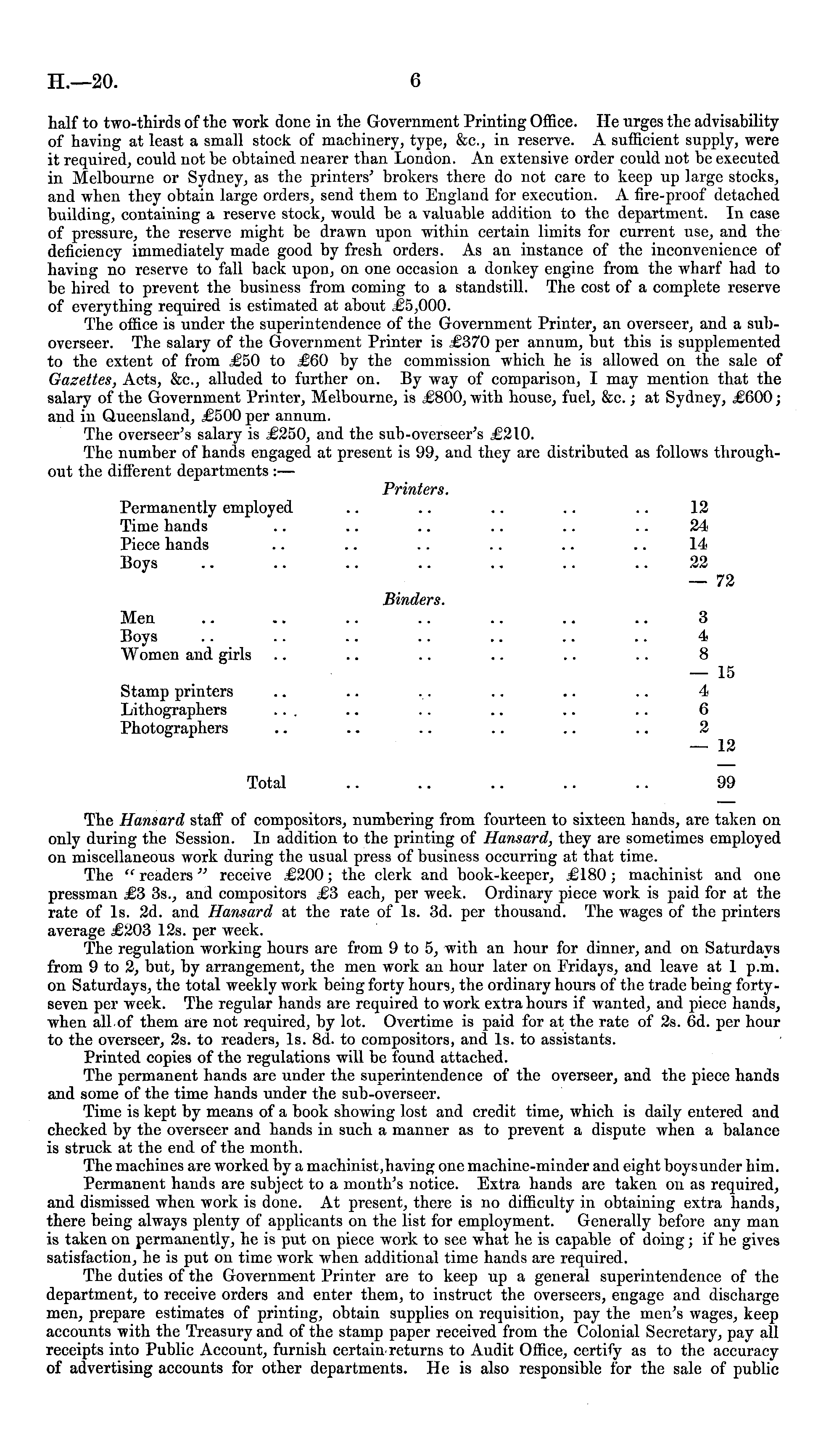 half to two-thirds of the work done in the Government Printing Office. He urges the advisability of having at least a small stock of machinery, type, &c., in reserve. A sufficient supply, were it required, could not be obtained nearer than London. An extensive order could not be executed in Melbourne or Sydney, as the printers' brokers there do not care to keep up large stocks, and when they obtain large orders, send them to England for execution. A fire-proof detached building, containing a reserve stock, would be a valuable addition to the department. In case of pressure, the reserve might be drawn upon within certain limits for current use, and the deficiency immediately made good by fresh orders. As an instance of the inconvenience of having no reserve to fall back upon, on one occasion a donkey engine from the wharf had to be hired to prevent the business from coming to a standstill. The cost of a complete reserve of everything required is estimated at about £5,000. The office is under the superintendence of the Government Printer, an overseer, and a suboverseer. The salary of the Government Printer is £370 per annum, but this is supplemented to the extent of from £50 to £60 by the commission which he is allowed on the sale of Gazettes, Acts, &c, alluded to further on. By way of comparison, I may mention that the salary of the Government Printer, Melbourne, is £800, with house, fuel, &c.; at Sydney, £600; and in Queensland, £500 per annum. The overseer's salary is £250, and the sub-overseer's £210. The number of hands engaged at present is 99, and they are distributed as follows throughout the different departments : — Printers. Permanently employed .. .. .. .. .. 12 Time hands .. .. .. .. .. .. 24 Piece hands .. .. .. .. .. .. 14 Boys .. .. .. .. .. .. .. 22 — 72 Binders. Men .. .. .. .. .. .. .. 3 Boys .. .. .. .. .. .. .. 4 Women and girls .. .. .. .. .. .. 8 — 15 Stamp printers .. .. .. .. .. .. 4 Lithographers ... .. .. .. .. .. 6 Photographers .. .. .. .. .. .. 2 — 12 Total .. .. .. .. .. 99 The Hansard staff of compositors, numbering from fourteen to sixteen hands, are taken on only during the Session. In addition to the printing of Hansard, they are sometimes employed on miscellaneous work during the usual press of business occurring at that time. The "readers" receive £200; the clerk and book-keeper, £180; machinist and one pressman £3 35., and compositors £3 each, per week. Ordinary piece work is paid for at the rate of Is. 2d. and Hansard at the rate of Is. 3d. per thousand. The wages of the printers average £203 12s. per week. The regulation working hours are from 9 to 5, with an hour for dinner, and on Saturdays from 9 to 2, but, by arrangement, the men work an hour later on Fridays, and leave at 1 p.m. on Saturdays, the total weekly work being forty hours, the ordinary hours of the trade being fortyseven per week. The regular hands are required to work extra hours if wanted, and piece hands, when all of them are not required, by lot. Overtime is paid for at the rate of 2s. 6d. per hour to the overseer, 2s. to readers, Is. Bd. to compositors, and Is. to assistants. Printed copies of the regulations will be found attached. The permanent hands are under the superintendence of the overseer, and the piece hands and some of the time hands under the sub-overseer. Time is kept by means of a book showing lost and credit time, which is daily entered and checked by the overseer and hands in such a manner as to prevent a dispute when a balance is struck at the end of the month. The machines are worked by a machinist,having one machine-minder and eight boysunder him. Permanent hands are subject to a month's notice. Extra hands are taken on as required, and dismissed when work is done. At present, there is no difficulty in obtaining extra hands, there being always plenty of applicants on the list for employment. Generally before any man is taken on permanently, he is put on piece work to see what he is capable of doing; if he gives satisfaction, he is put on time work when additional time hands are required. The duties of the Government Printer are to keep up a general superintendence of the department, to receive orders and enter them, to instruct the overseers, engage and discharge men, prepare estimates of printing, obtain supplies on requisition, pay the men's wages, keep accounts with the Treasury and of the stamp paper received from the Colonial Secretary, pay all receipts into Public Account, furnish certain returns to Audit Office, certify as to the accuracy of advertising accounts for other departments. He is also responsible for the sale of public
