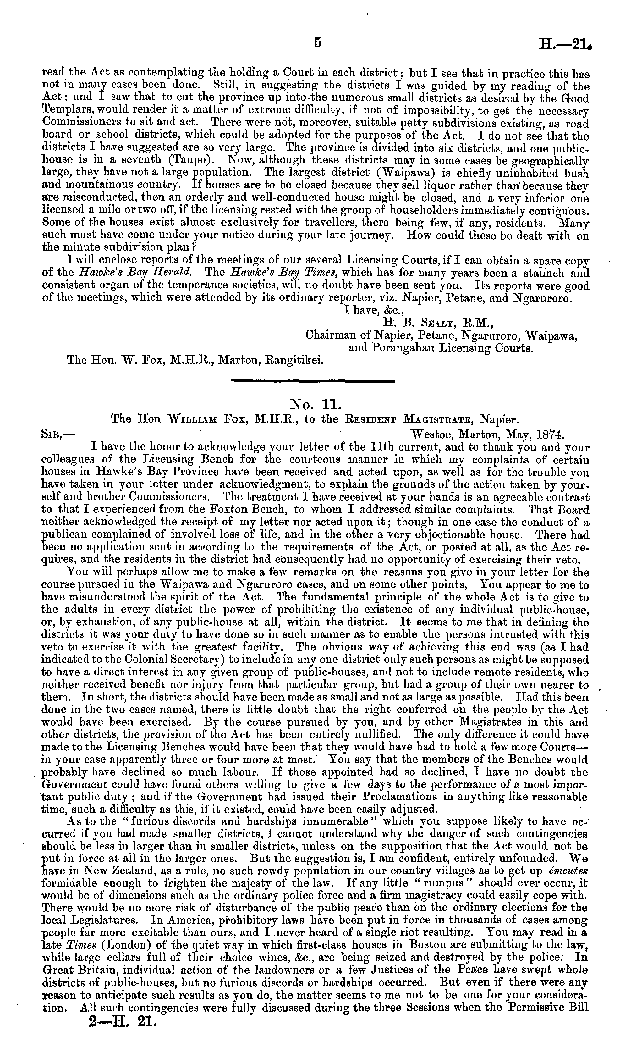 read the Act as contemplating the holding a Court in each district; but I see that in practice this has not in many cases been done. Still, in suggesting the districts I was guided by my reading of the Act; and I saw that to cut the province up into the numerous small districts as desired by the Good Templars, would render it a matter of extreme difficulty, if not of impossibility, to get the necessary Commissioners to sit and act. There were not, moreover, suitable petty subdivisions existing, as road board or school districts, which could be adopted for the purposes of the Act. Ido not see that the districts I have suggested are so very large. The province is divided into six districts, and one publichouse is in a seventh (Taupo). Now, although these districts may in some cases be geographically large, they have not a large population. The largest district (Waipawa) is chiefly uninhabited bush and mountainous eountry. If houses are to be closed because they sell liquor rather than because they are misconducted, then an orderly and well-conducted house might be closed, and a very inferior one licensed a mile or two off, if the licensing rested with the group of householders immediately contiguous. Some of the houses exist almost exclusively for travellers, there being few, if any, residents. Many such must have come under your notice during your late journey. How could these be dealt with on the minute subdivision plan ? I will enclose reports of the meetings of our several Licensing Courts, if I can obtain a spare copy of the Haioke's Bay Herald. The Hawke's Bay Times, which has for many years been a staunch and consistent organ of the temperance societies, will no doubt have been sent you. Its reports were good of the meetings, which were attended by its ordinary reporter, viz. Napier, Petane, and Ngaruroro. I have, <fcc, H. B. Sealt, E.M., Chairman of Napier, Petane, Ngaruroro, Waipawa, and Porangahau Licensing Courts. The Hon. W. Fox, M.H.E., Marton, Eangitikei.