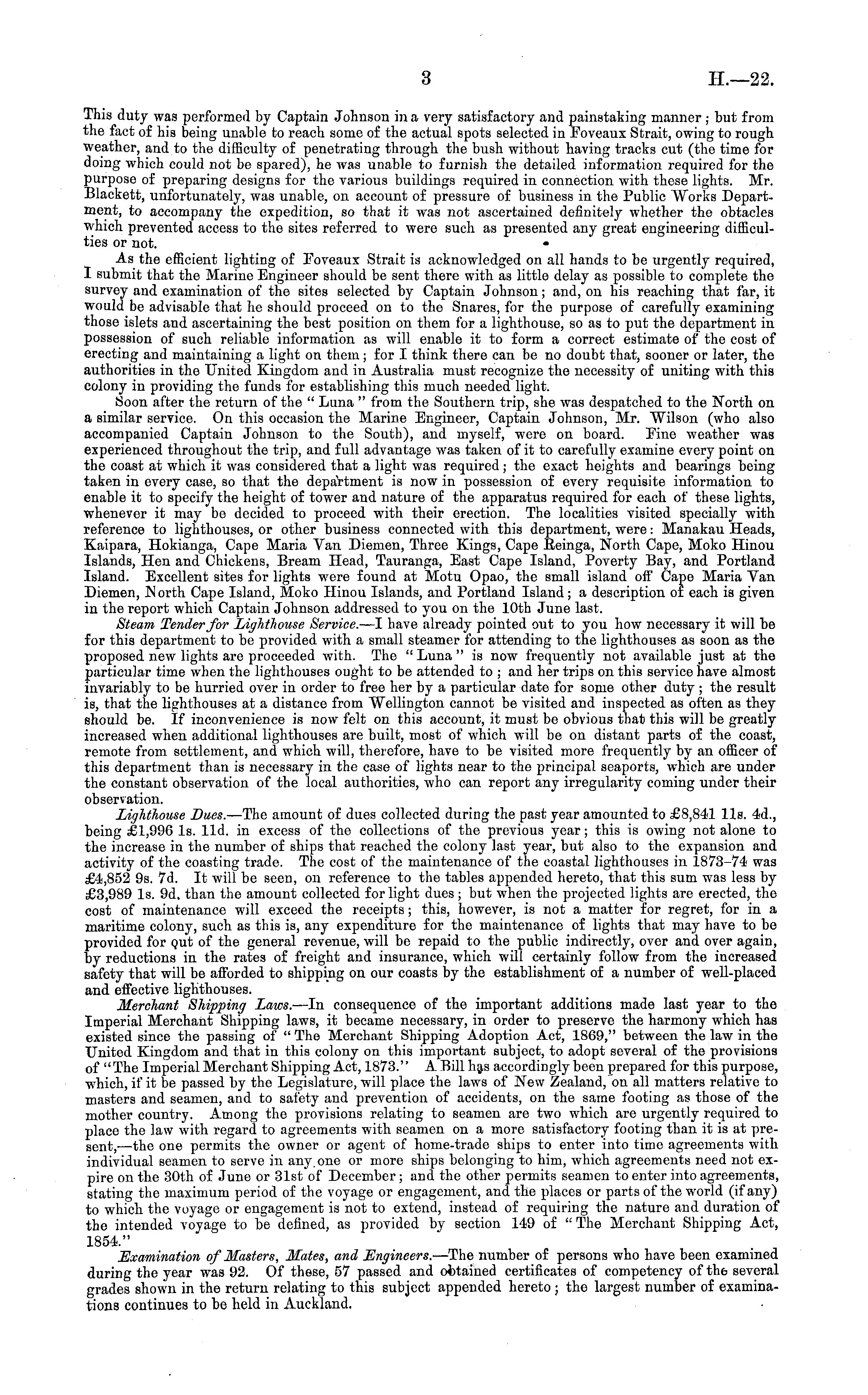 This duty was performed by Captain Johnson in a very satisfactory and painstaking manner ; but from the fact of his being unable to reach some of the actual spots selected in Foveaux Strait, owing to rough weather, and to the difficulty of penetrating through the bush without having tracks cut (the time for doing which could not be spared), he was unable to furnish the detailed information required for the purpose of preparing designs for the various buildings required in connection with these lights. Mr. Blackett, unfortunately, was unable, on account of pressure of business in the Public Works Department, to accompany the expedition, so that it was not ascertained definitely whether the obtacles which prevented access to the sites referred, to were such as presented any great engineering difficulties or not. • As the efficient lighting of Foveaux Strait is acknowledged on all hands to be urgently required, I submit that the Marine Engineer should be sent there with as little delay as possible to complete the survey and examination of the sites selected by Captain Johnson; and, on his reaching that far, it would be advisable that he should proceed on to the Snares, for the purpose of carefully examining those islets and ascertaining the best position on them for a lighthouse, so as to put the department in possession of such reliable information as will enable it to form a correct estimate of the cost of erecting and maintaining a light on them; for I think there can be no doubt that, sooner or later, the authorities in the United Kingdom and in Australia must recognize the necessity of uniting with this colony in providing the funds for establishing this much needed light. Soon after the return of the " Luna " from the Southern trip, she was despatched to the North on a similar service. On this occasion the Marine Engineer, Captain Johnson, Mr. Wilson (who also accompanied Captain Johnson to the South), and myself, were on board. Fine weather was experienced throughout the trip, and full advantage was taken of it to carefully examine every point on the coast at which it was considered that a light was required; the exact heights and bearings being taken in every case, so that the department is now in possession of every requisite information to enable it to specify the height of tower and nature of the apparatus required for each of these lights, whenever it may be decided to proceed with their erection. The localities visited specially with reference to lighthouses, or other business connected with this department, were: Manakau Heads, Kaipara, Hokianga, Cape Maria Van Diemen, Three Kings, Cape Reinga, North Cape, Moko Hinou Islands, Hen and Chickens, Bream Head, Tauranga, East Cape Island, Poverty Bay, and Portland Island. Excellent sites for lights were found at Motu Opao, the small island off Cape Maria Van Diemen, North Cape Island, Moko Hinou Islands, and Portland Island; a description of each is given in the report which Captain Johnson addressed to you on the 10th June last. Steam Tender for Lighthouse Service. —I have already pointed out to you how necessary it will be for this department to be provided with a small steamer for attending to the lighthouses as soon as the proposed new lights are proceeded with. The "Luna" is now frequently not available just at the particular time when the lighthouses ought to be attended to ; and her trips on this service have almost invariably to be hurried over in order to free her by a particular date for some other duty ; the result is, that the lighthouses at a distance from Wellington cannot be visited and inspected as often as they should be. If inconvenience is now felt on this account, it must be obvious that this will be greatly increased when additional lighthouses are built, most of which will be on distant parts of the coast, remote from settlement, and which will, therefore, have to be visited more frequently by an officer of this department than is necessary in the case of lights near to the principal seaports, which are under the constant observation of the local authorities, who can report any irregularity coming under their observation. Lighthouse Dues. —The amount of dues collected during the past year amounted to £8,841 11s. 4d., being £1,996 Is. lid. in excess of the collections of the previous year; this is owing not alone to the increase in the number of ships that reached the colony last year, but also to the expansion and activity of the coasting trade. The cost of the maintenance of the coastal lighthouses in 1873-74 was £4,852 9s. 7d. It will be seen, on reference to the tables appended hereto, that this sum was less by £3,989 Is. 9d, than the amount collected for light dues; but when the projected lights are erected, the cost of maintenance will exceed the receipts; this, however, is not a matter for regret, for in a maritime colony, such as this is, any expenditure for the maintenance of lights that may have to bo provided for put of the general revenue, will bo repaid to the public indirectly, over and over again, by reductions in the rates of freight and insurance, which will certainly follow from the increased safety that will be afforded to shipping on our coasts by the establishment of a number of well-placed and effective lighthouses. Merchant Shipping Laws.—ln consequence of the important additions made last year to the Imperial Merchant Shipping laws, it became necessary, in order to preserve the harmony which has existed since the passing of " The Merchant Shipping Adoption Act, 1869," between the law in the United Kingdom and that in this colony on this important subject, to adopt several of the provisions of "The Imperial Merchant Shipping Act, 1873." A Bill has accordingly been prepared for this purpose, which, if it be passed by the Legislature, will place the laws of New Zealand, on all matters relative to masters and seamen, and to safety and prevention of accidents, on the same footing a